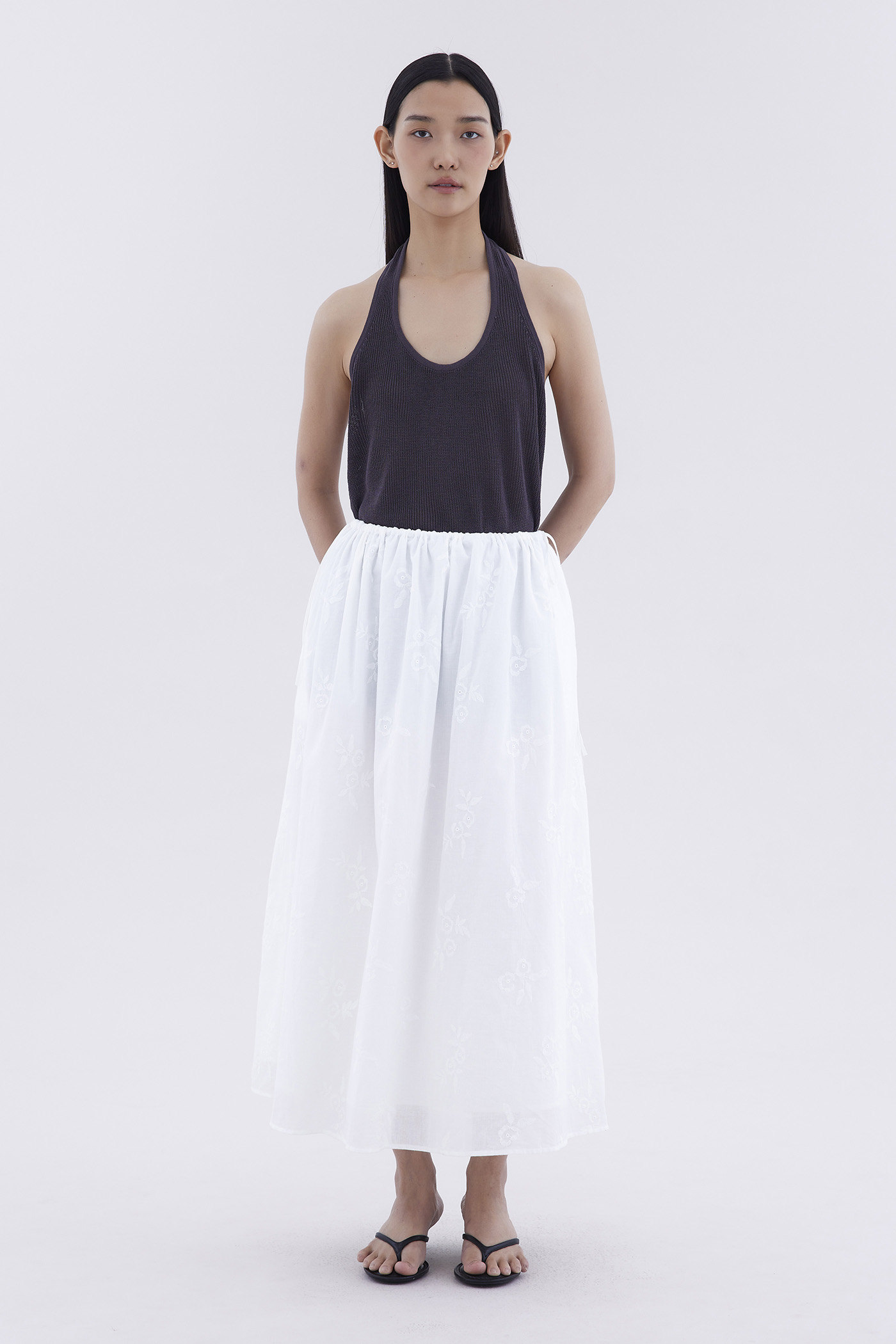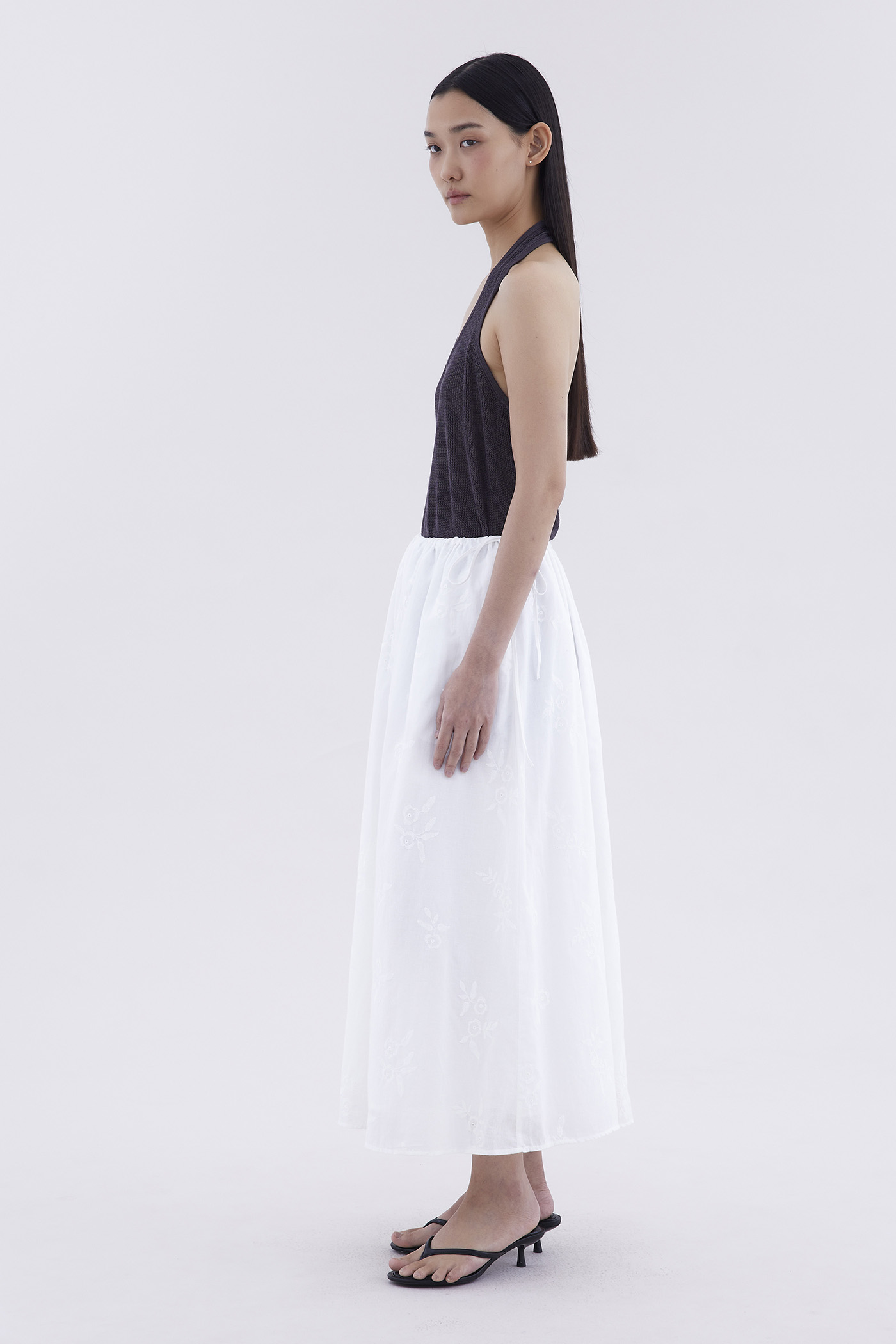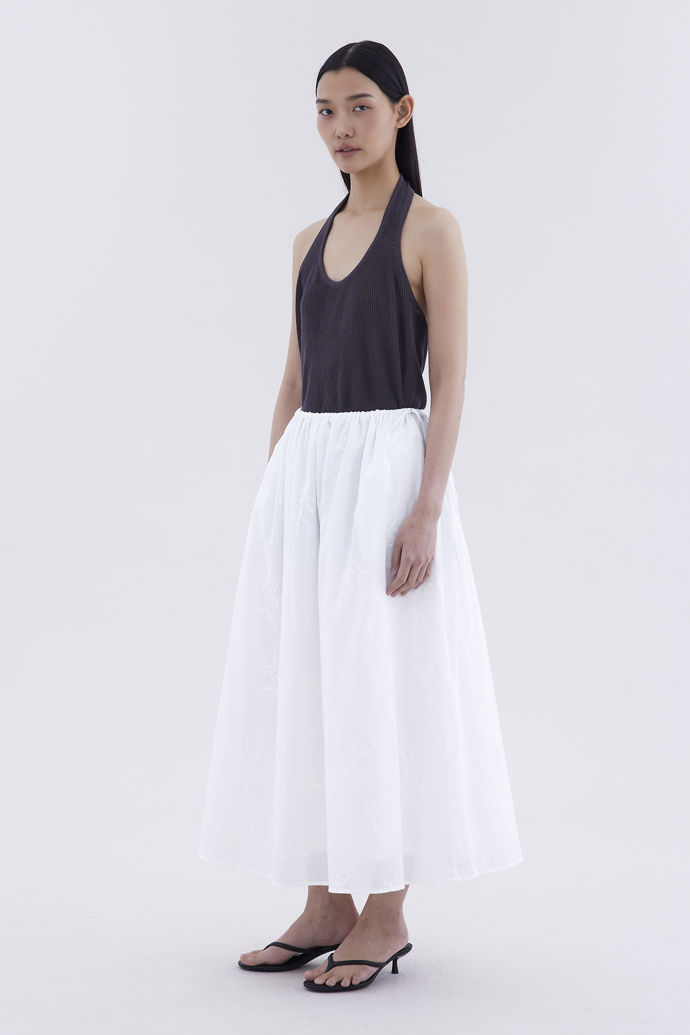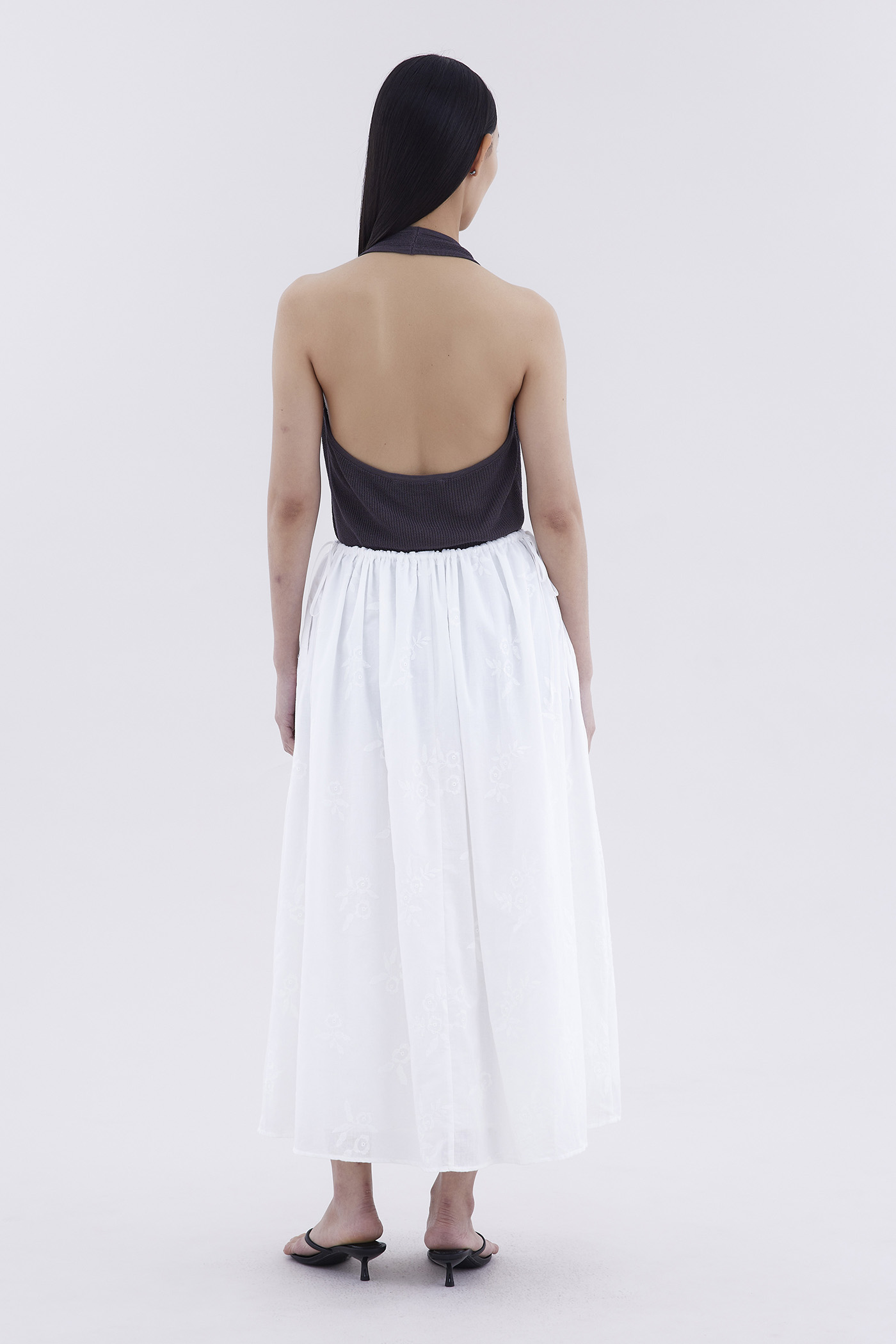 Double the detail. Made from crisp and softly structured cotton broderie, this maxi skirt features a drawstring waistband with side-ties and a flared A-line silhouette.