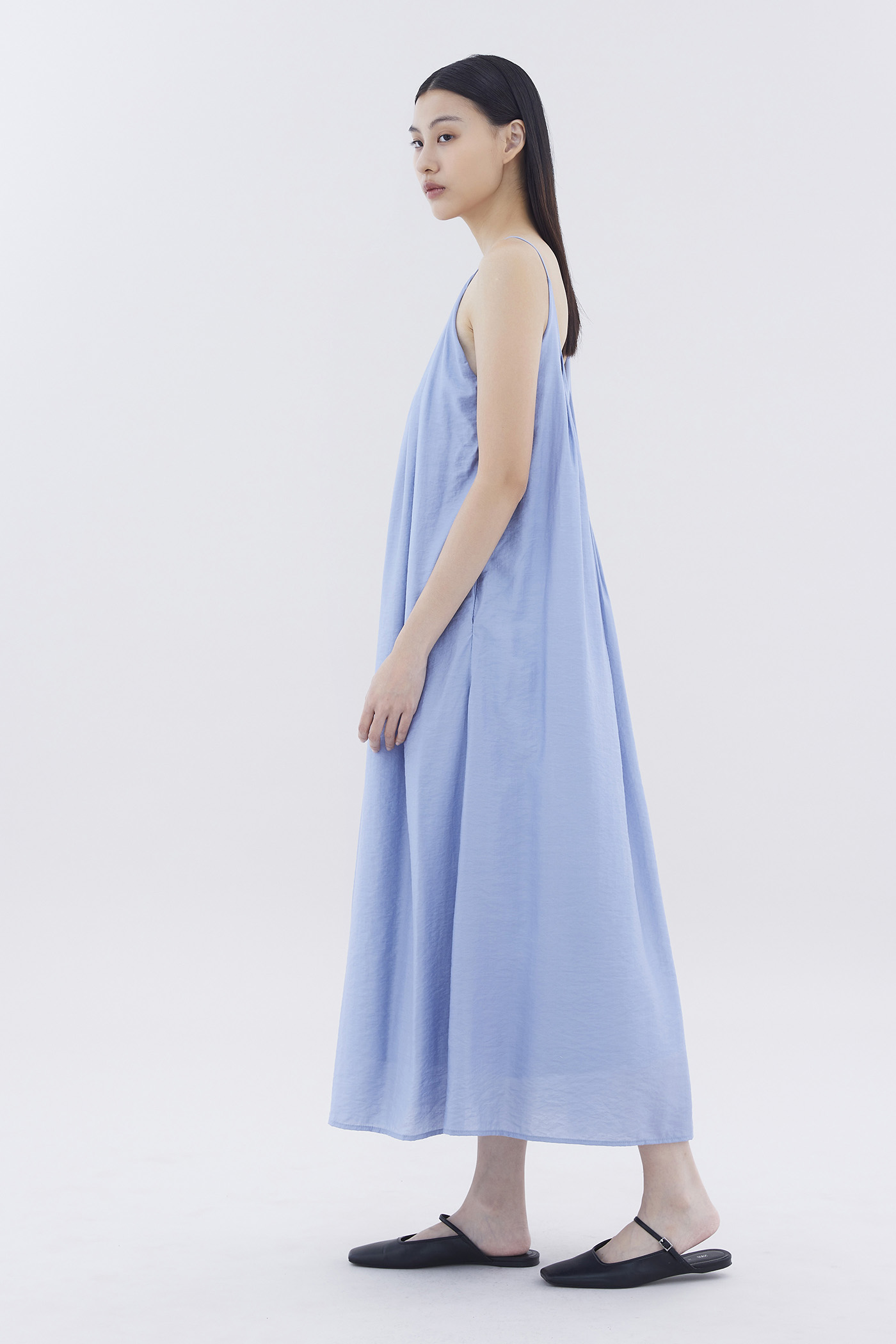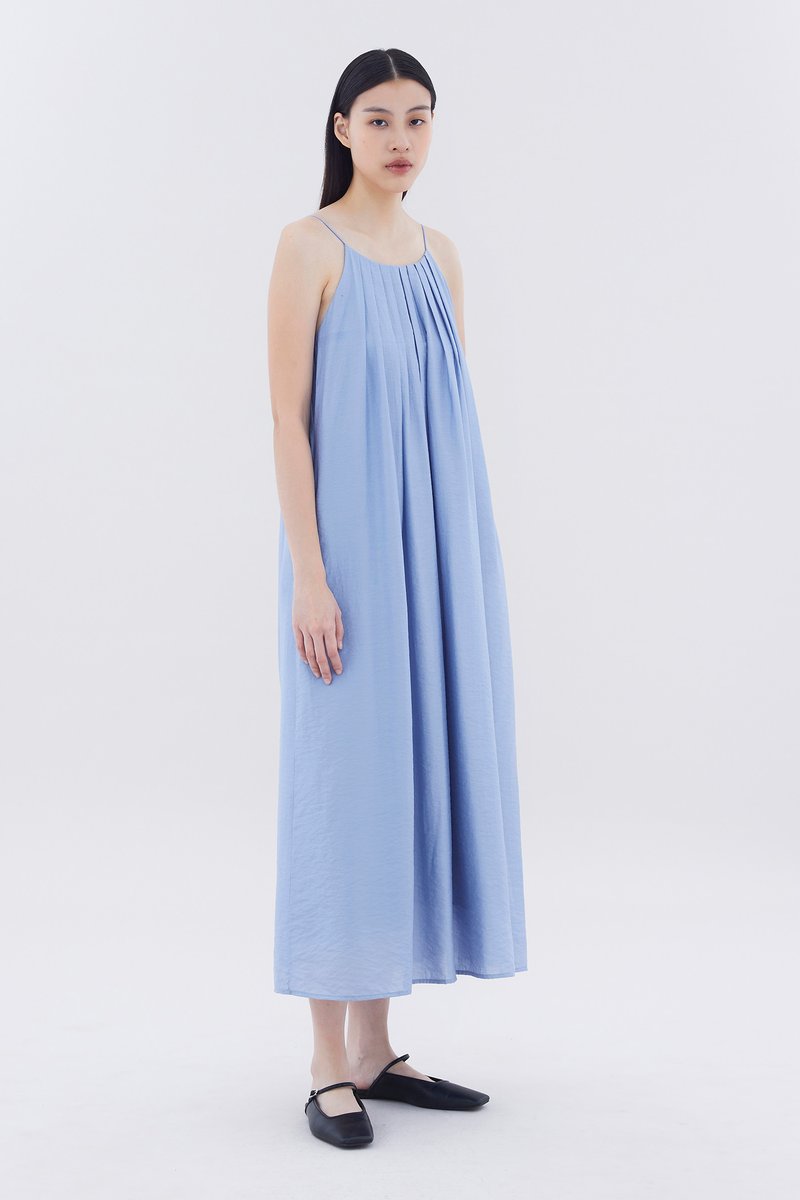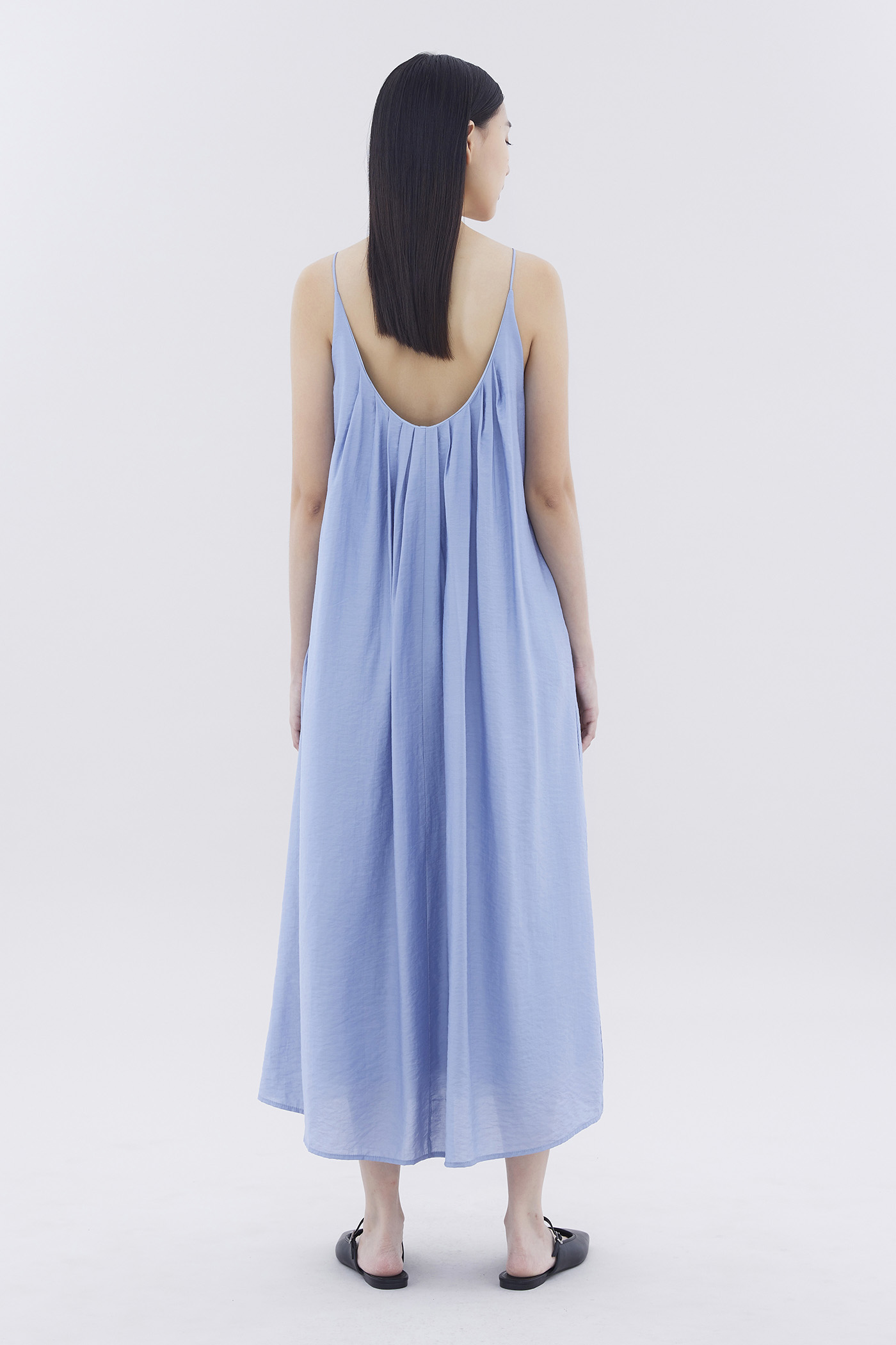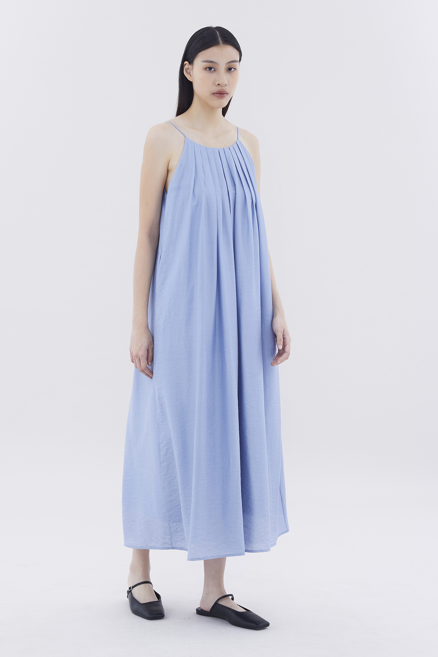 Let your textures do the talking. Made from soft and flowy fabric, this sleeveless maxi dress features pleating, a scooped back, a round neckline, slim non-adjustable shoulder straps and a side zip closure. Fits relaxed in an easy tent silhouette.