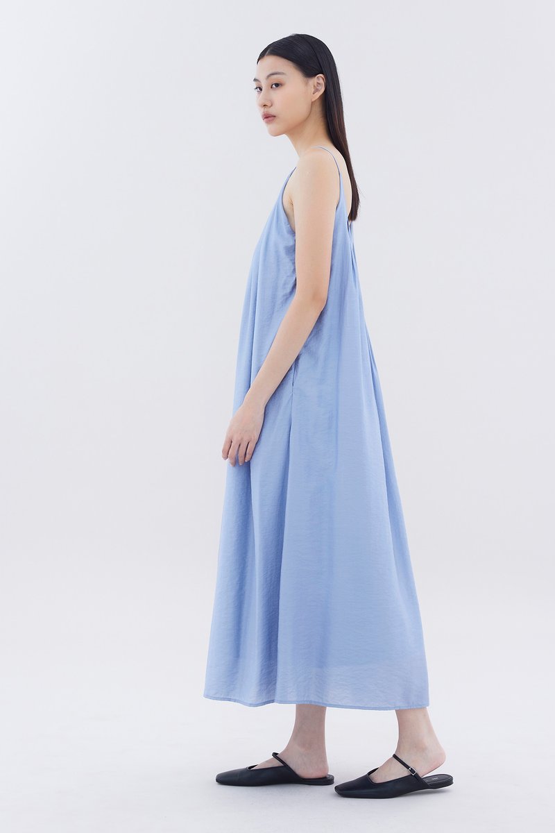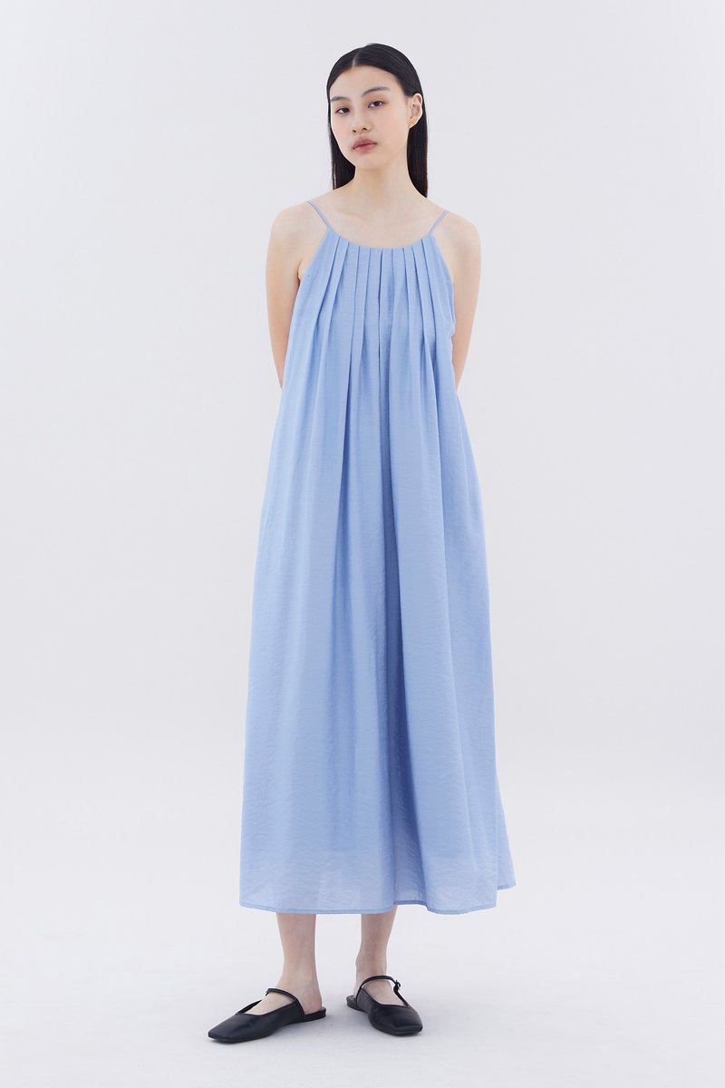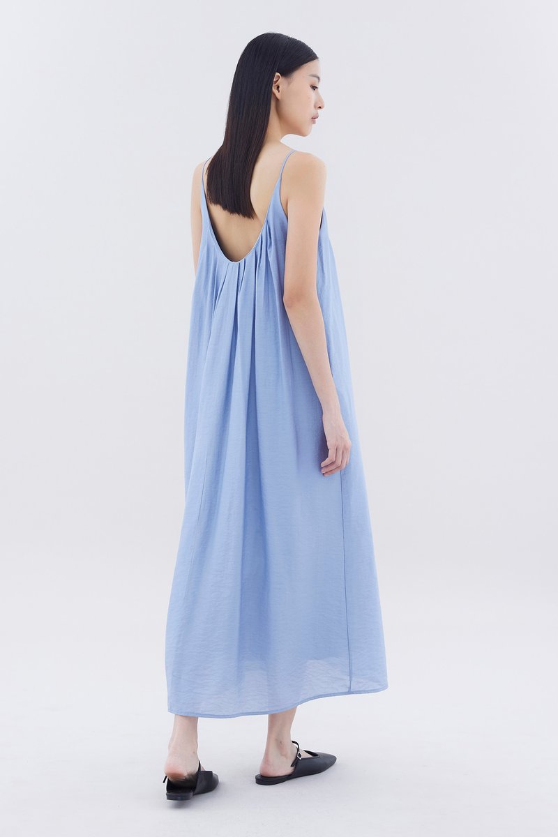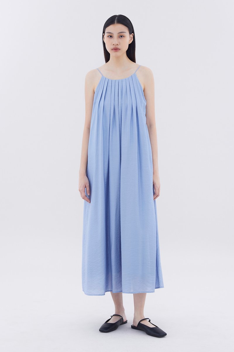 Let your textures do the talking. Made from soft and flowy fabric, this sleeveless maxi dress features pleating, a scooped back, a round neckline, slim non-adjustable shoulder straps and a side zip closure. Fits relaxed in an easy tent silhouette.