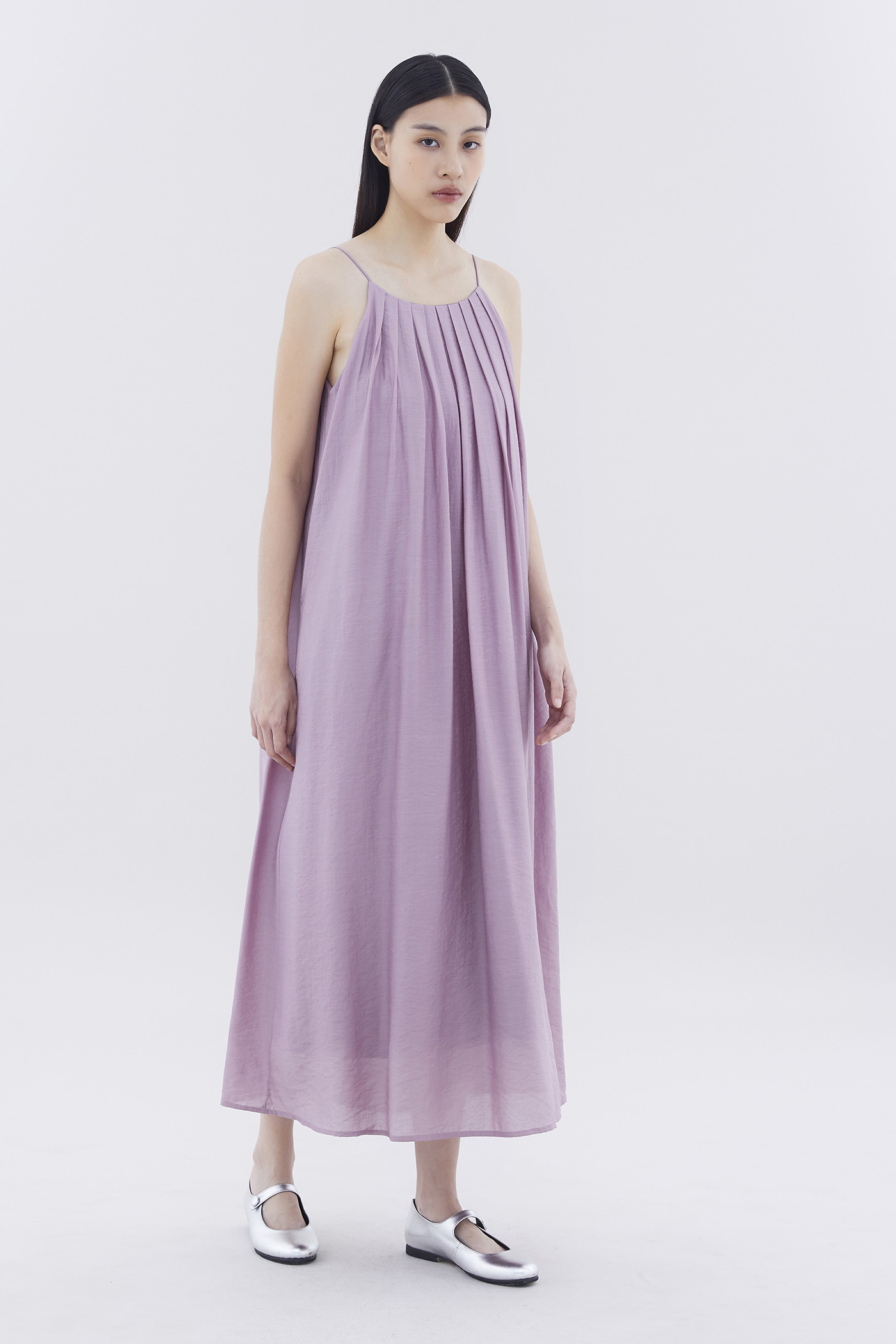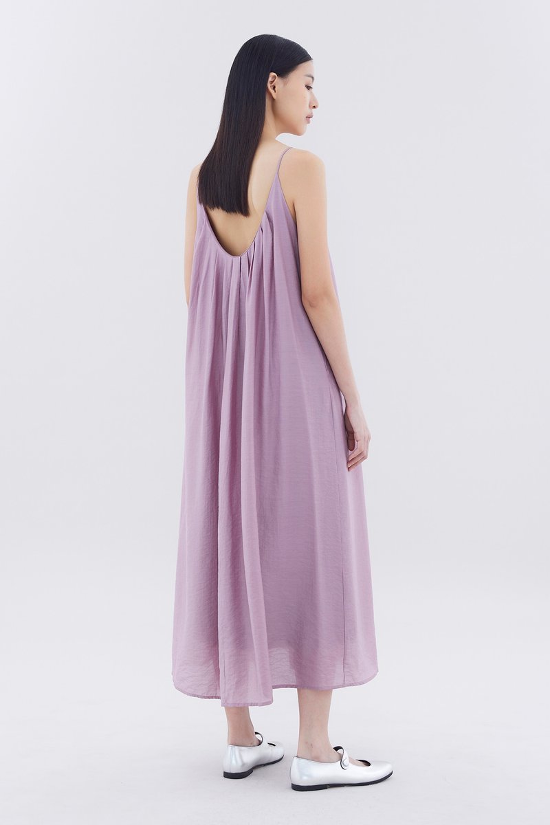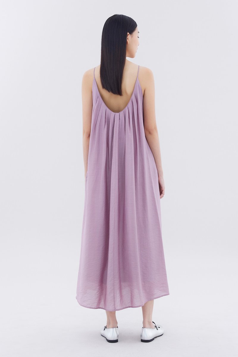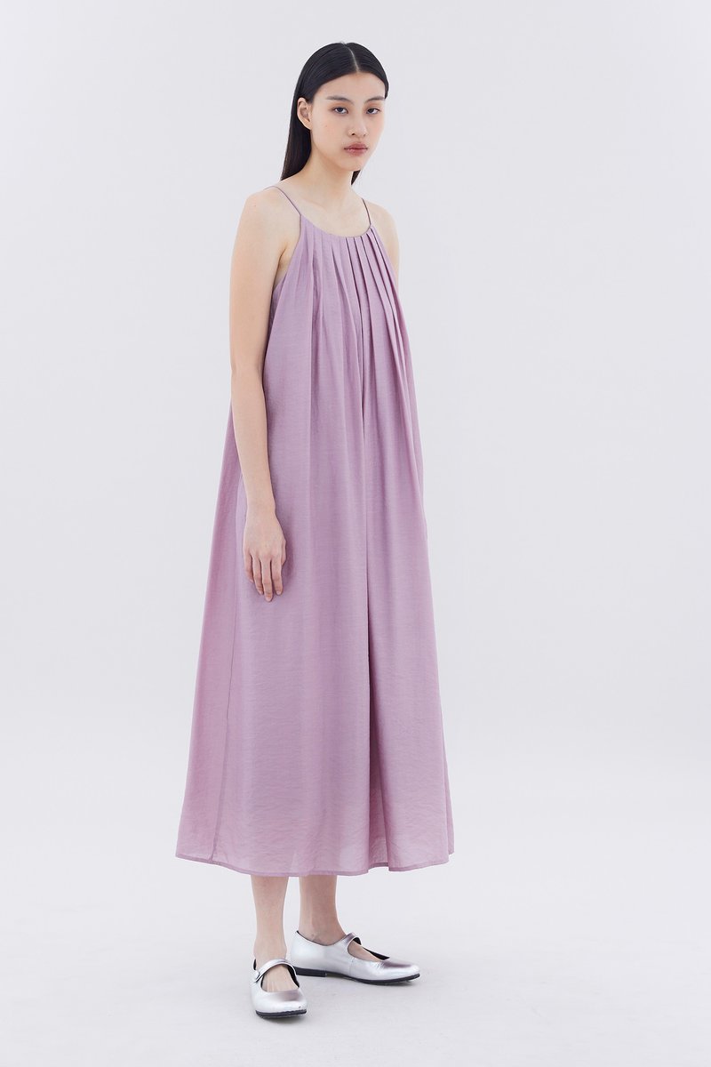Let your textures do the talking. Made from soft and flowy fabric, this sleeveless maxi dress features pleating, a scooped back, a round neckline, slim non-adjustable shoulder straps and a side zip closure. Fits relaxed in an easy tent silhouette.