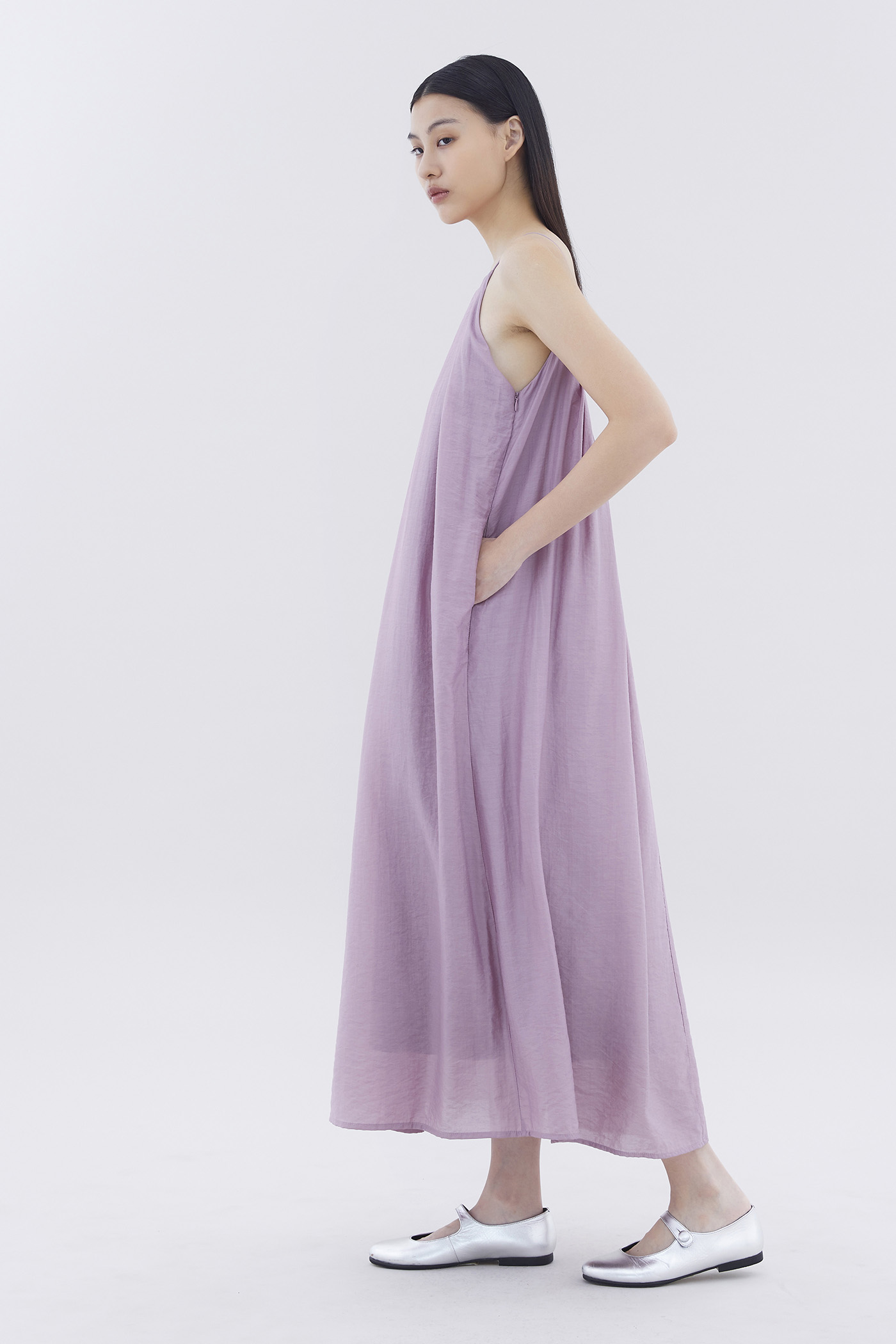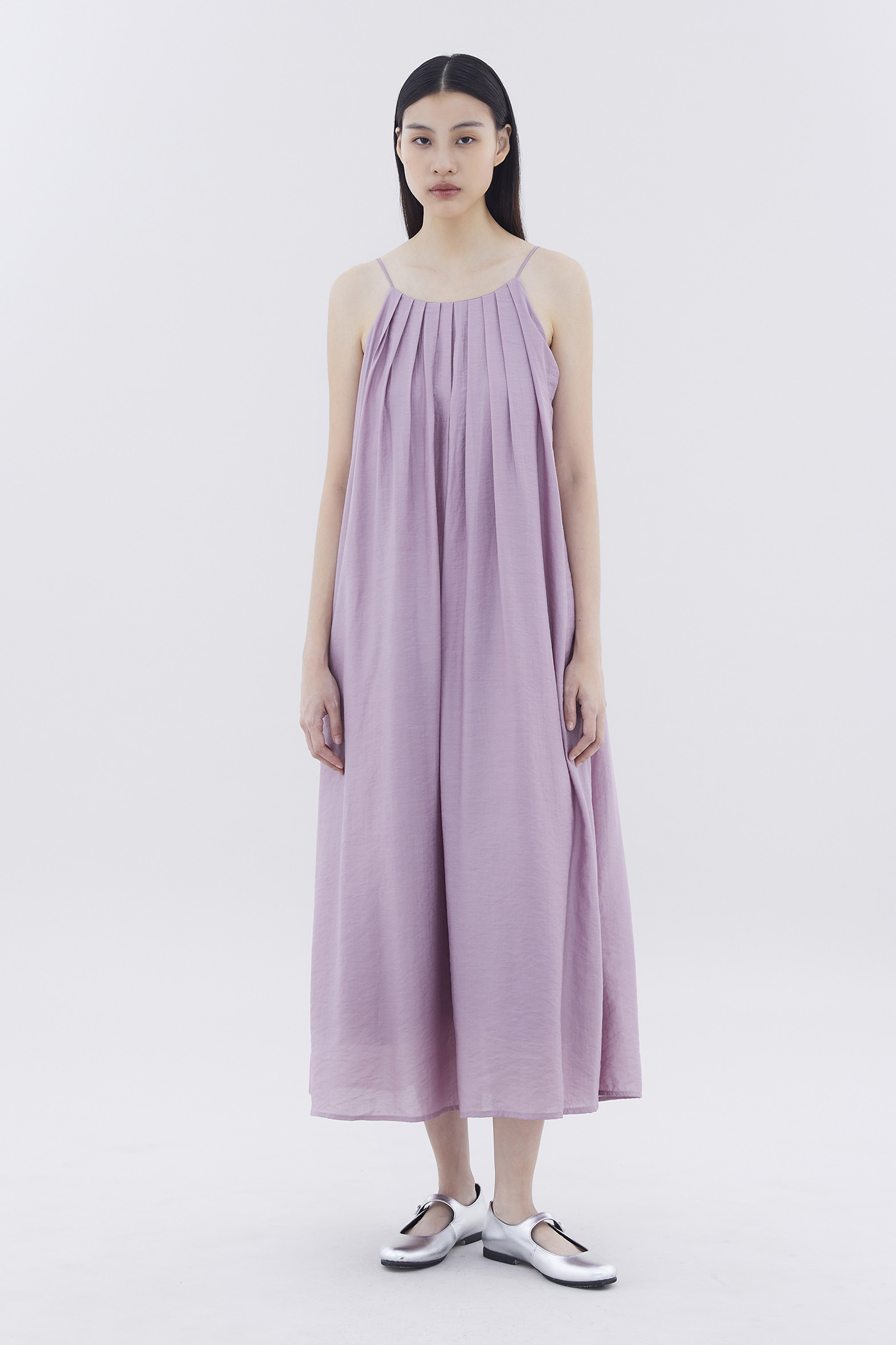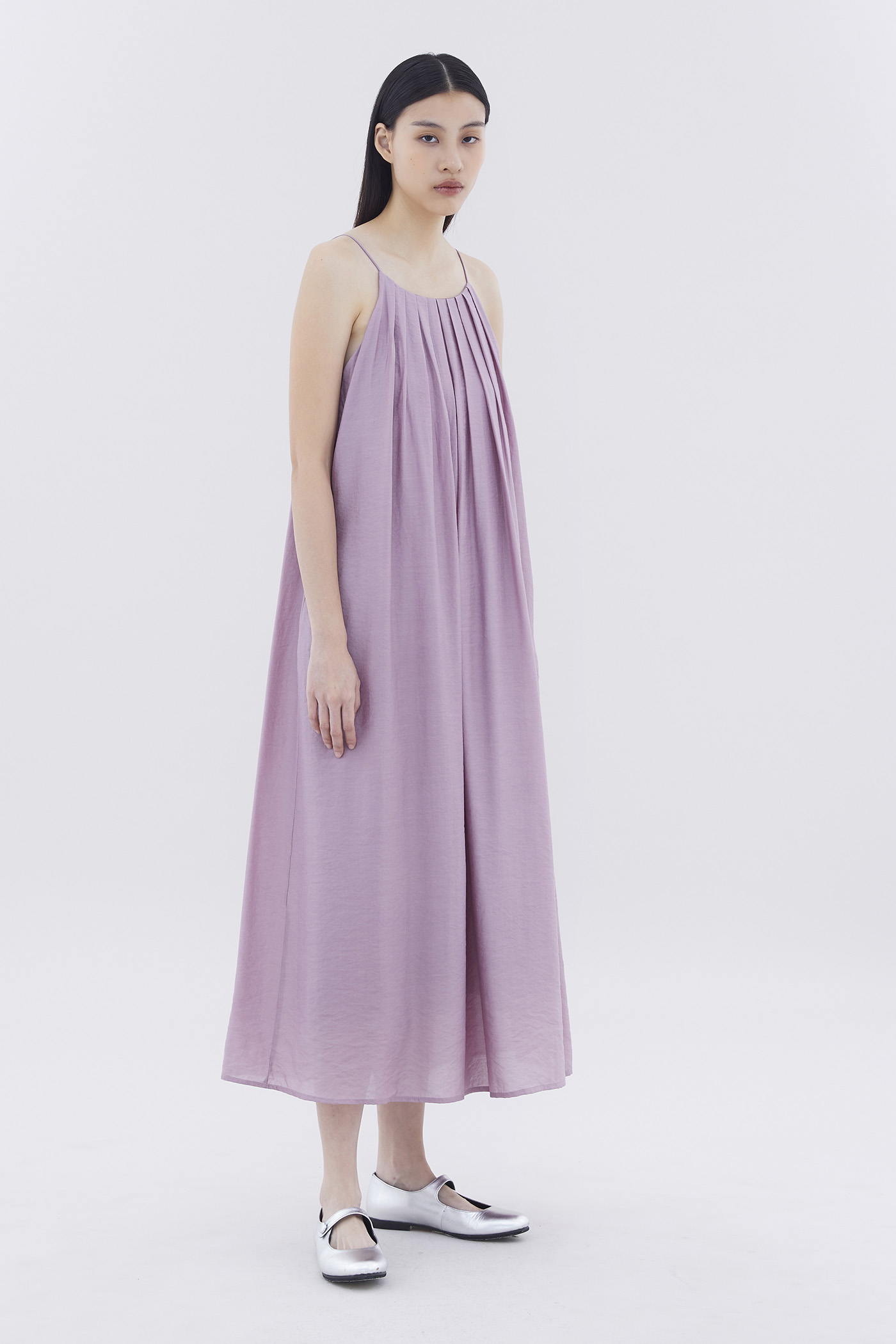 Let your textures do the talking. Made from soft and flowy fabric, this sleeveless maxi dress features pleating, a scooped back, a round neckline, slim non-adjustable shoulder straps and a side zip closure. Fits relaxed in an easy tent silhouette.