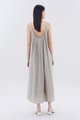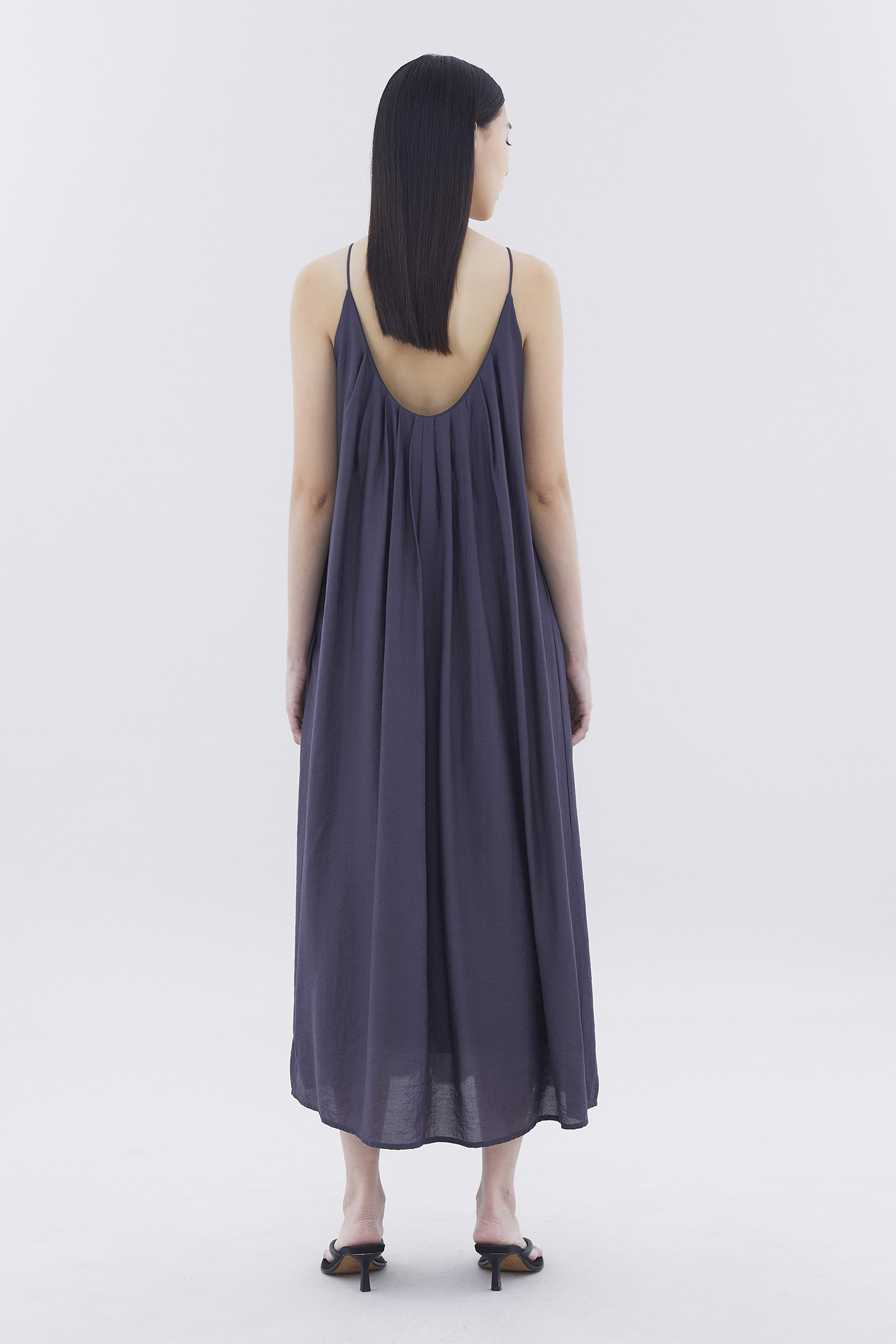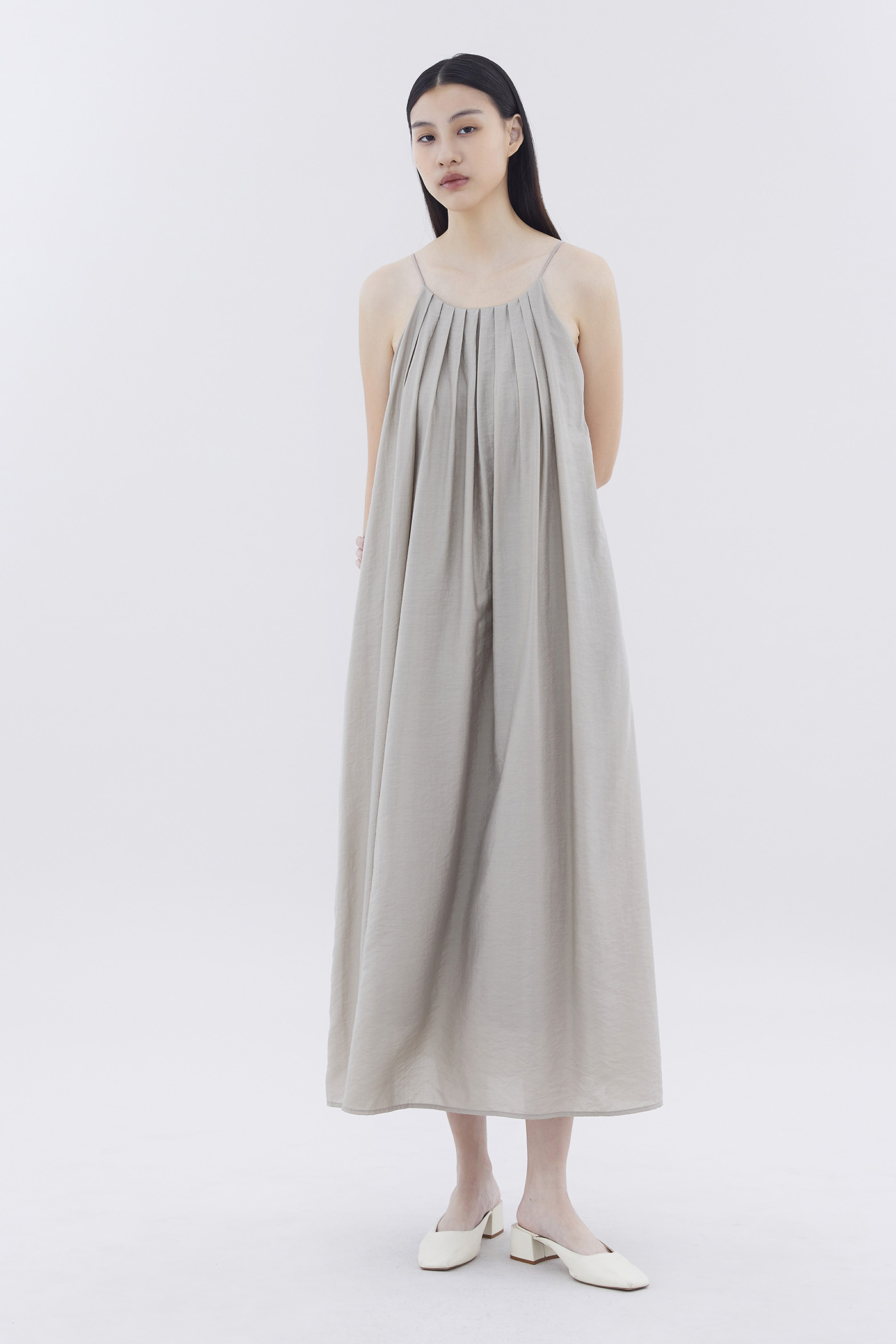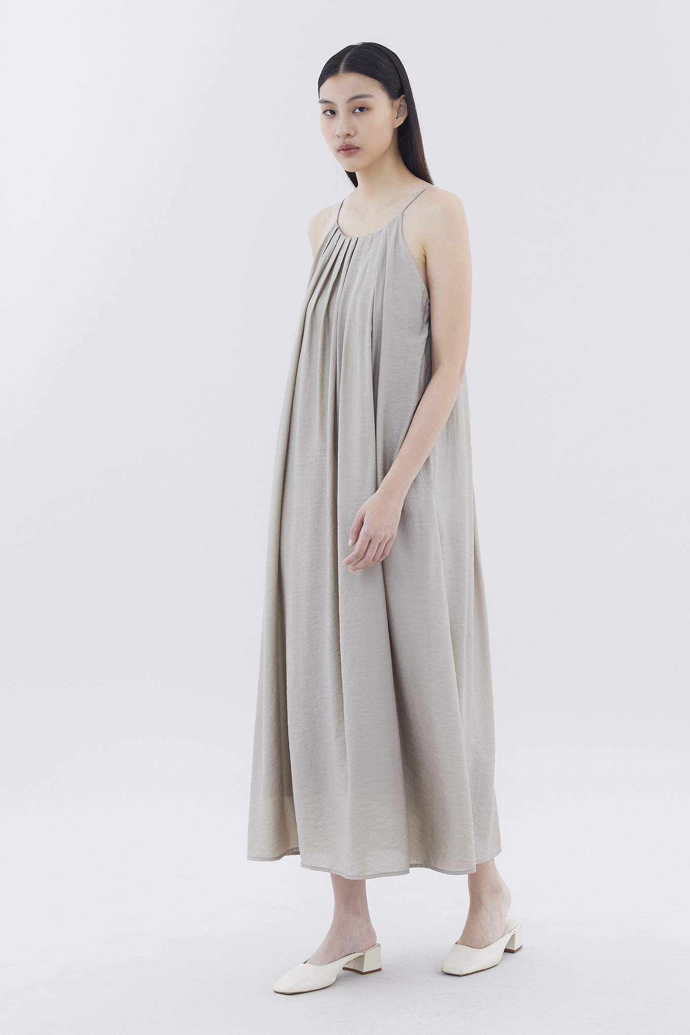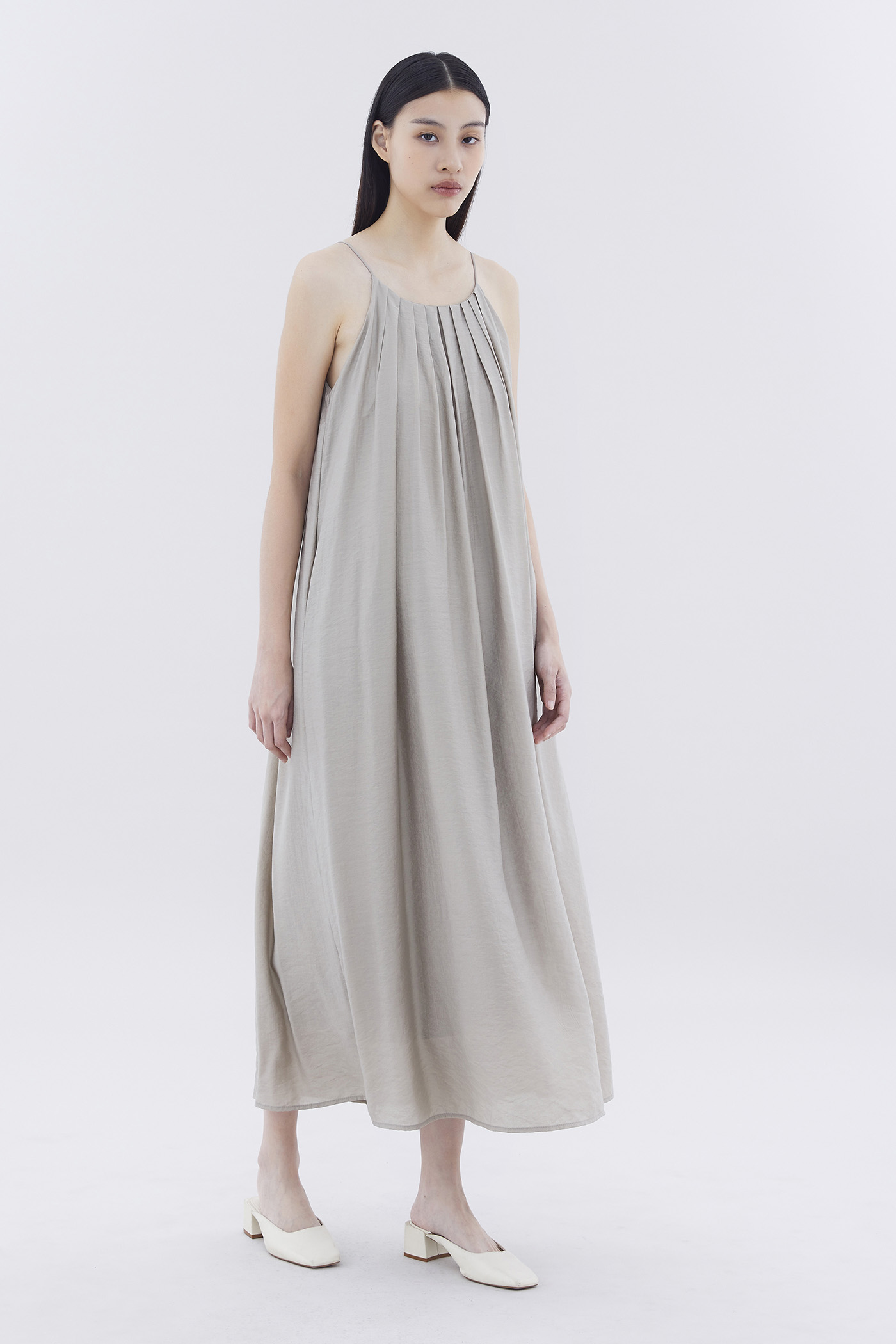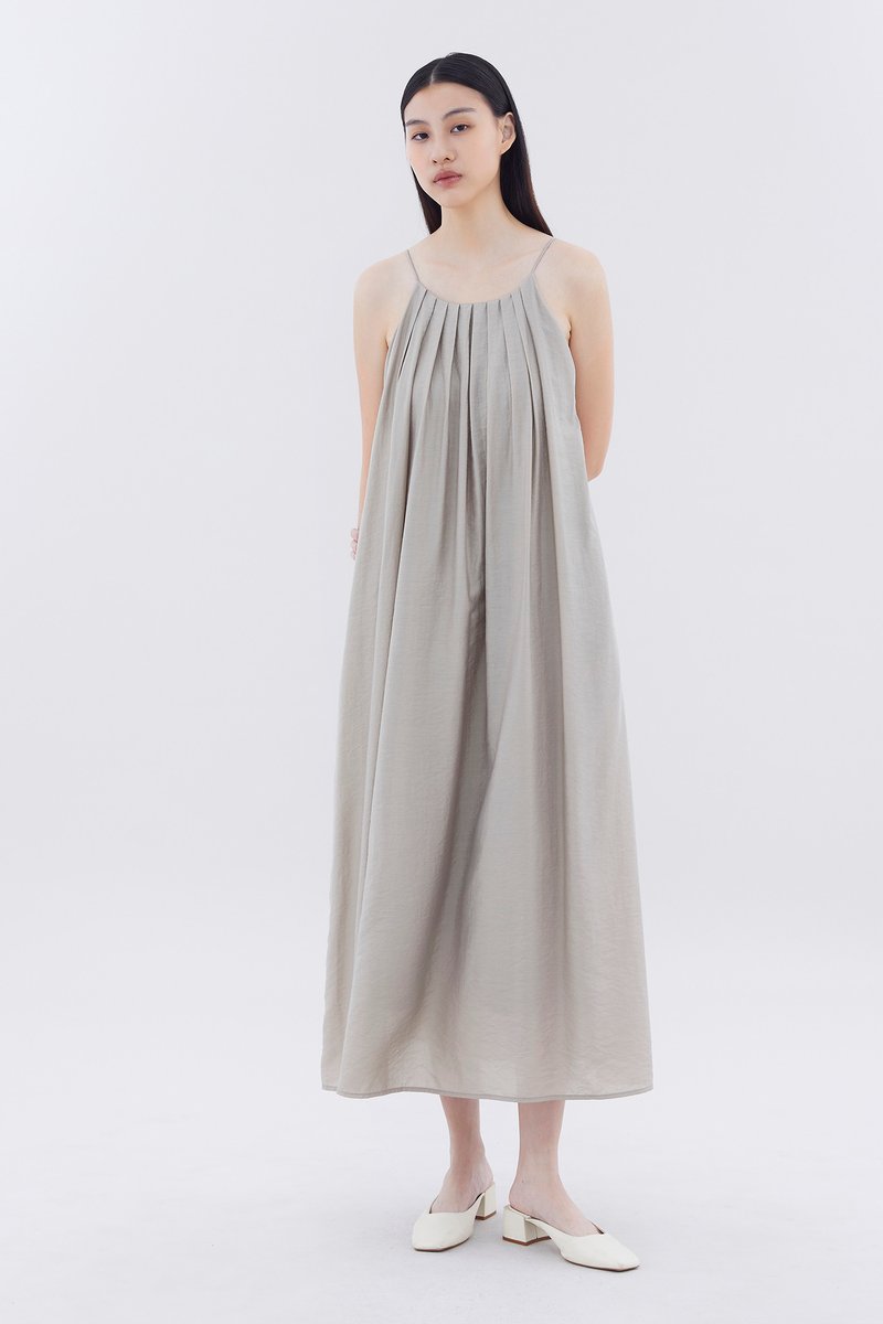 Let your textures do the talking. Made from soft and flowy fabric, this sleeveless maxi dress features pleating, a scooped back, a round neckline, slim non-adjustable shoulder straps and a side zip closure. Fits relaxed in an easy tent silhouette.