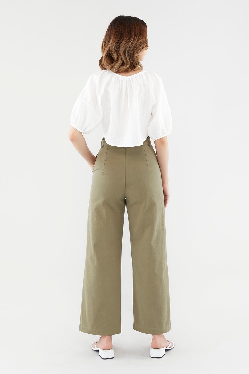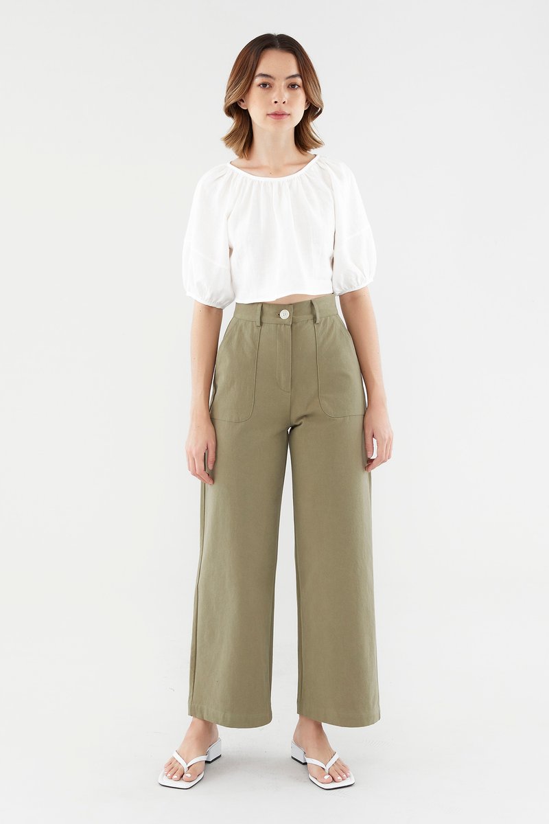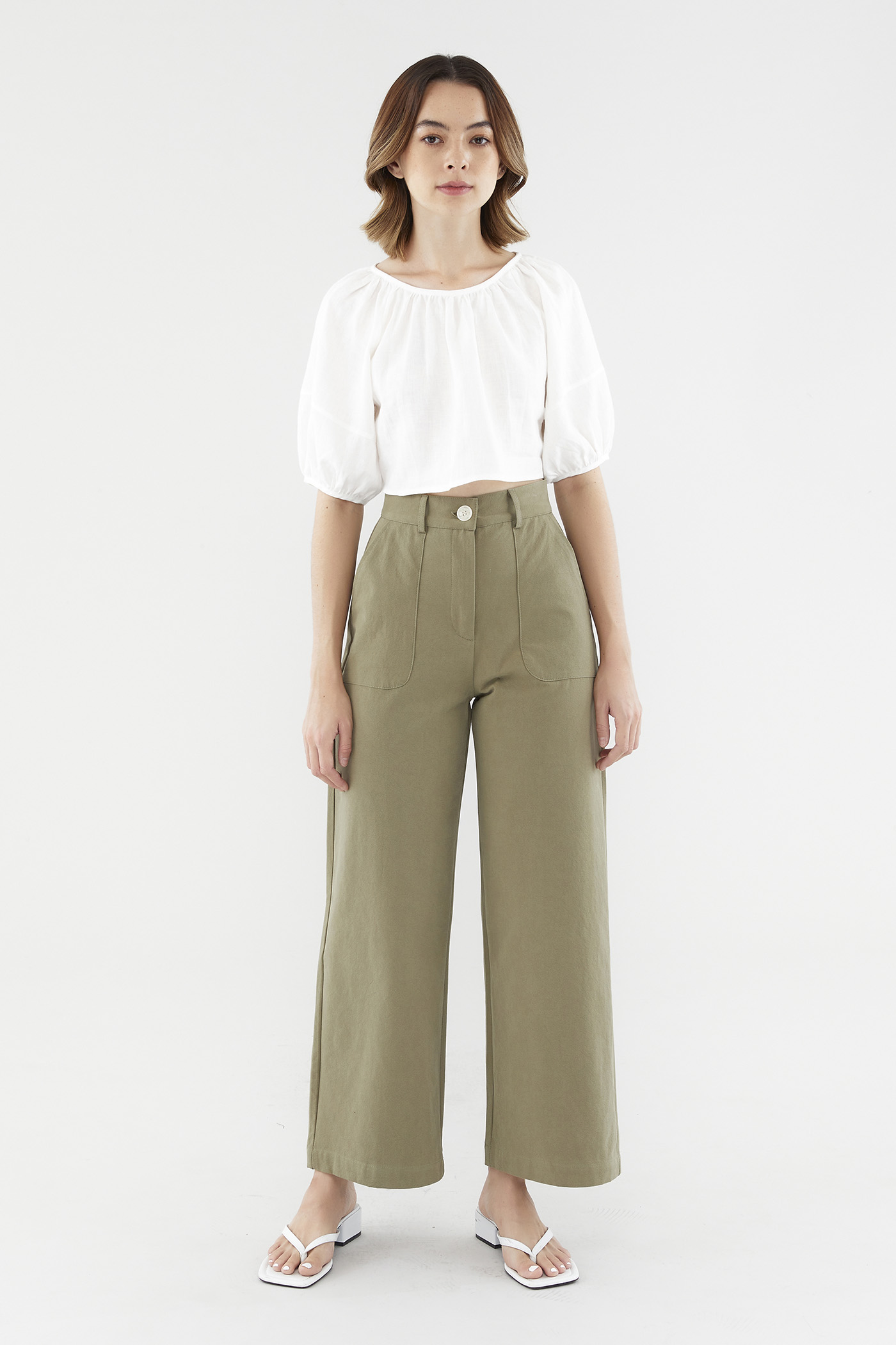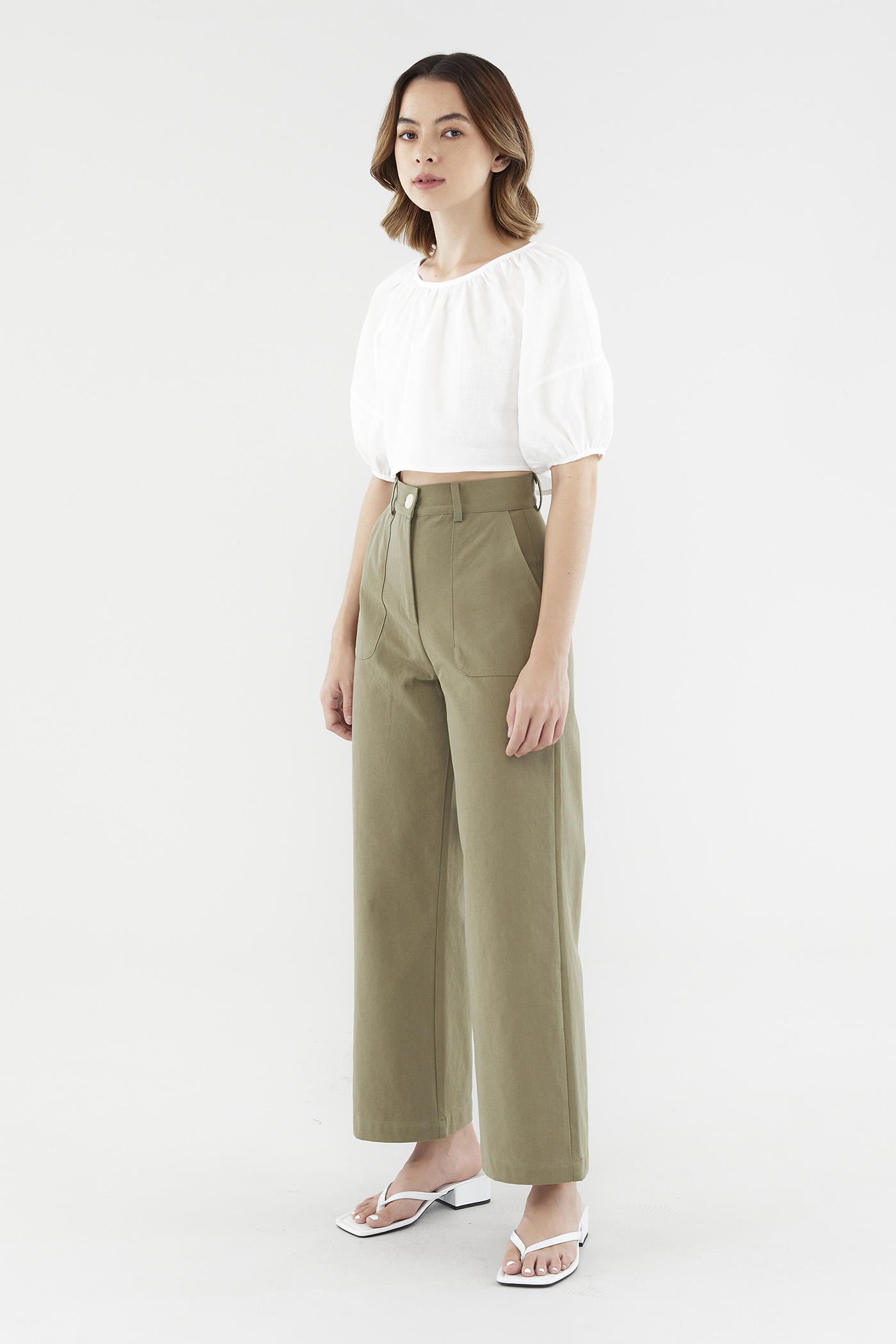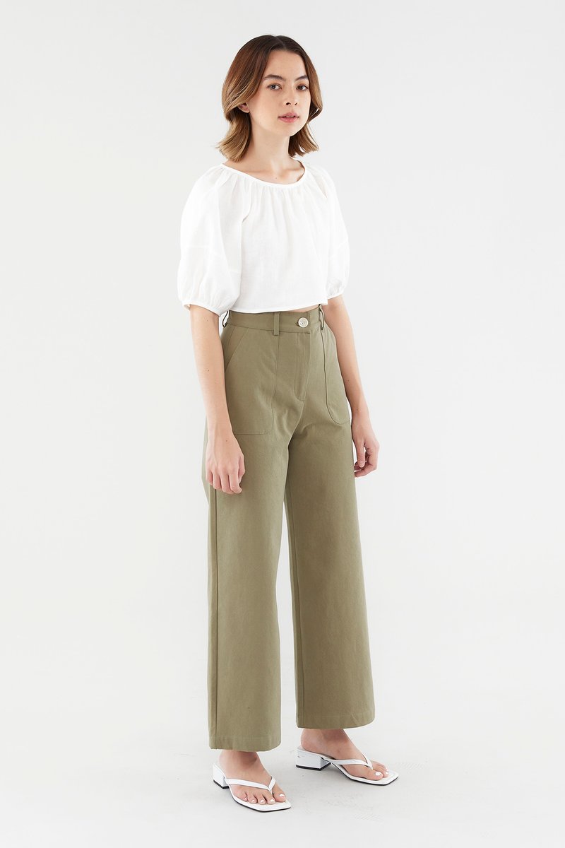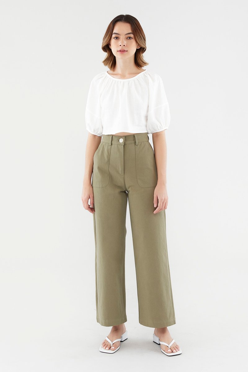 Crisp look, broken-in feel. Cut from non-stretch and non-sheer cotton, these softly structured pants feature a high waist, belt loops, straight wide legs and two large patch pockets on each side. Worn in a slim fit and regular length, with a button and zip closure on the front.