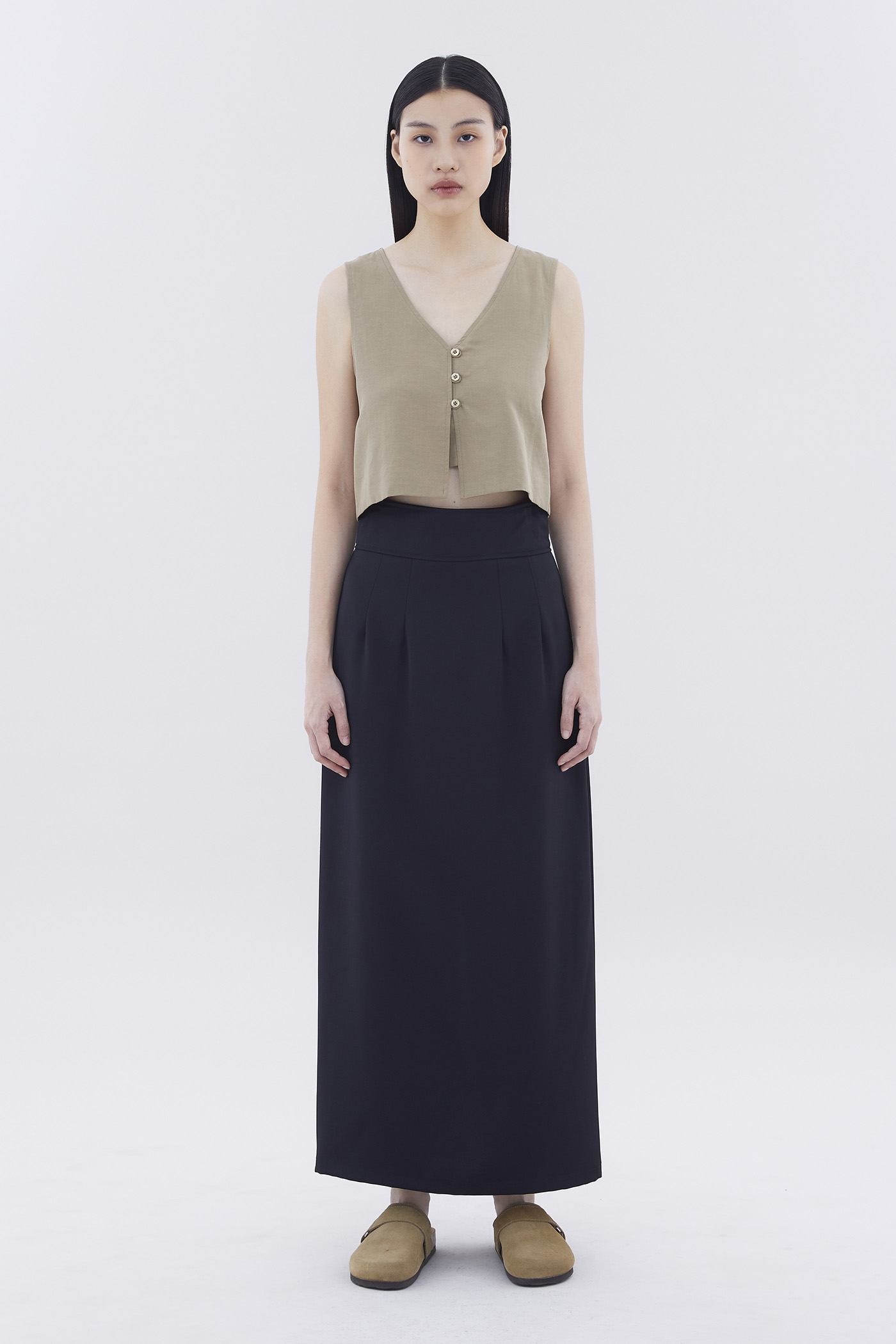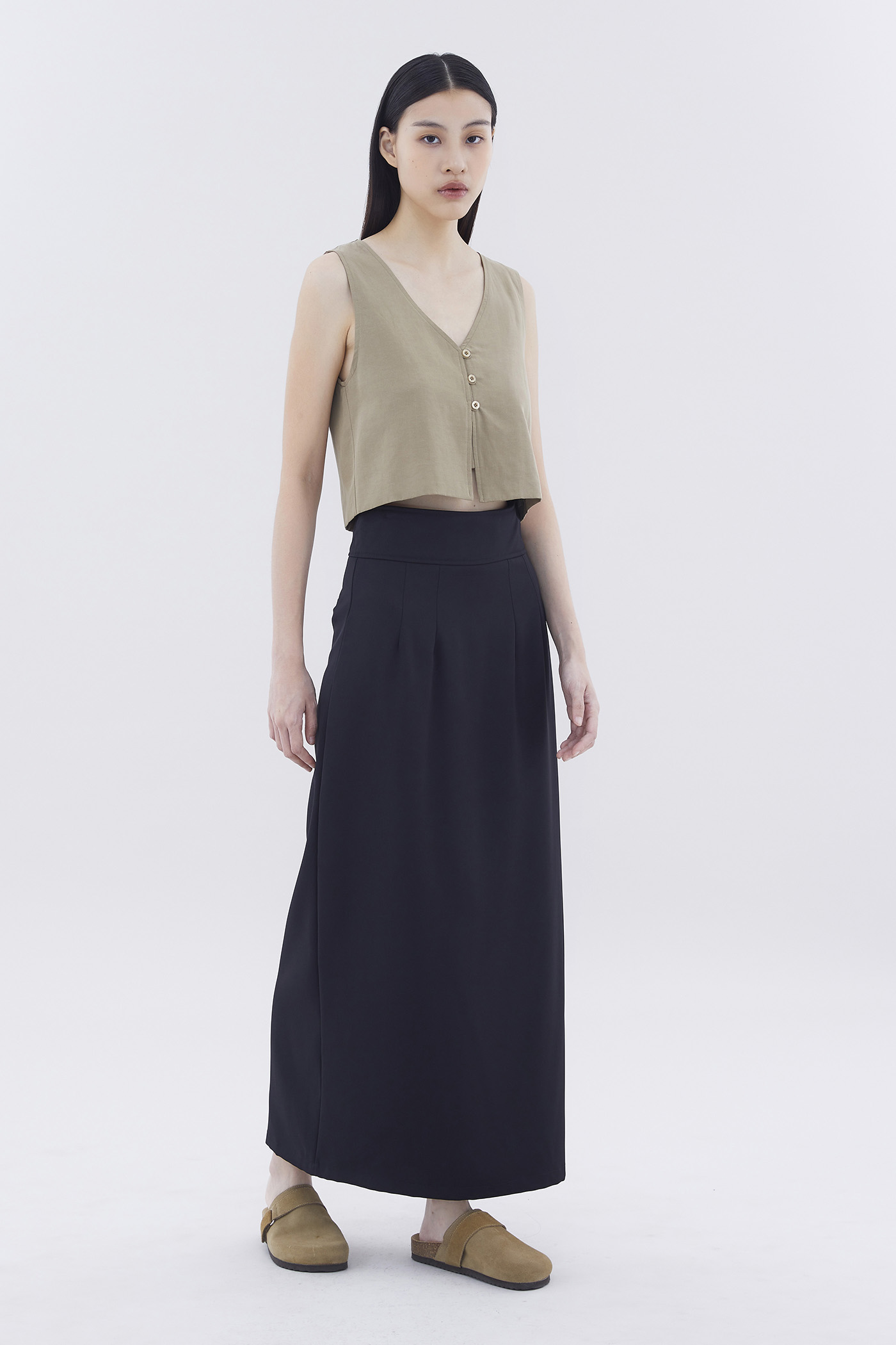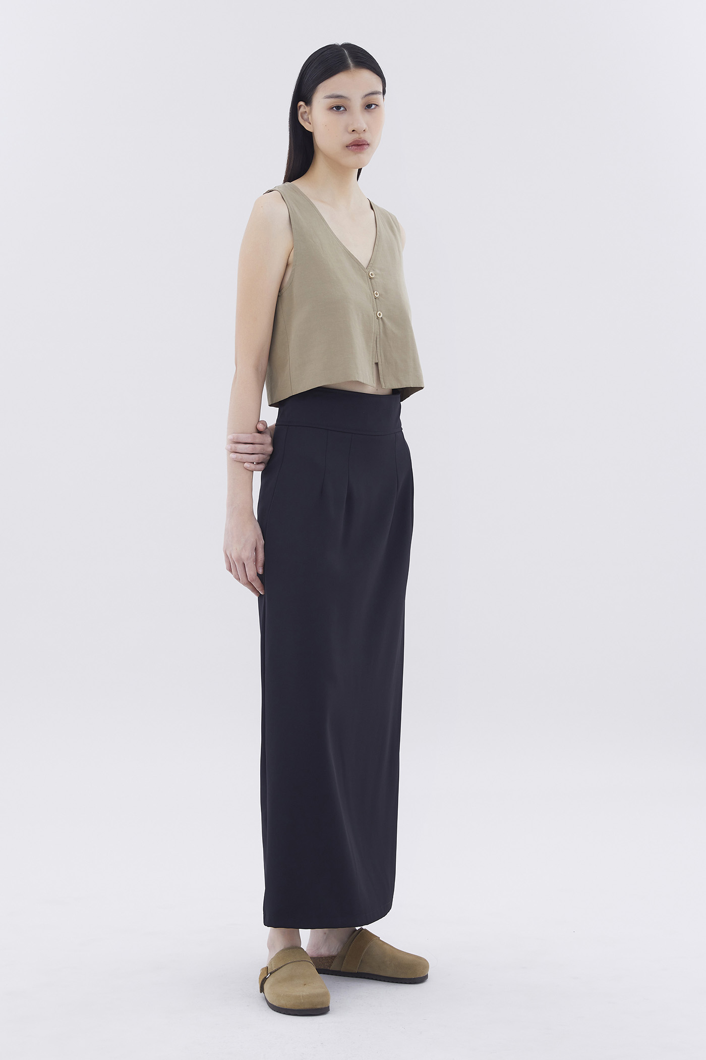 Form-flattering. Made from smooth and gently tailored fabric, this high-rise maxi skirt features a straight silhouette, a wide waistband as well as a slit and decorative pockets at the back. Worn in a slim fit with a back zip closure.