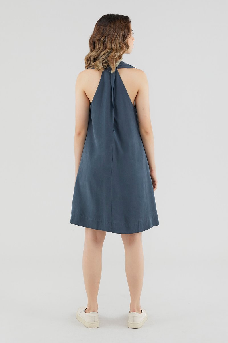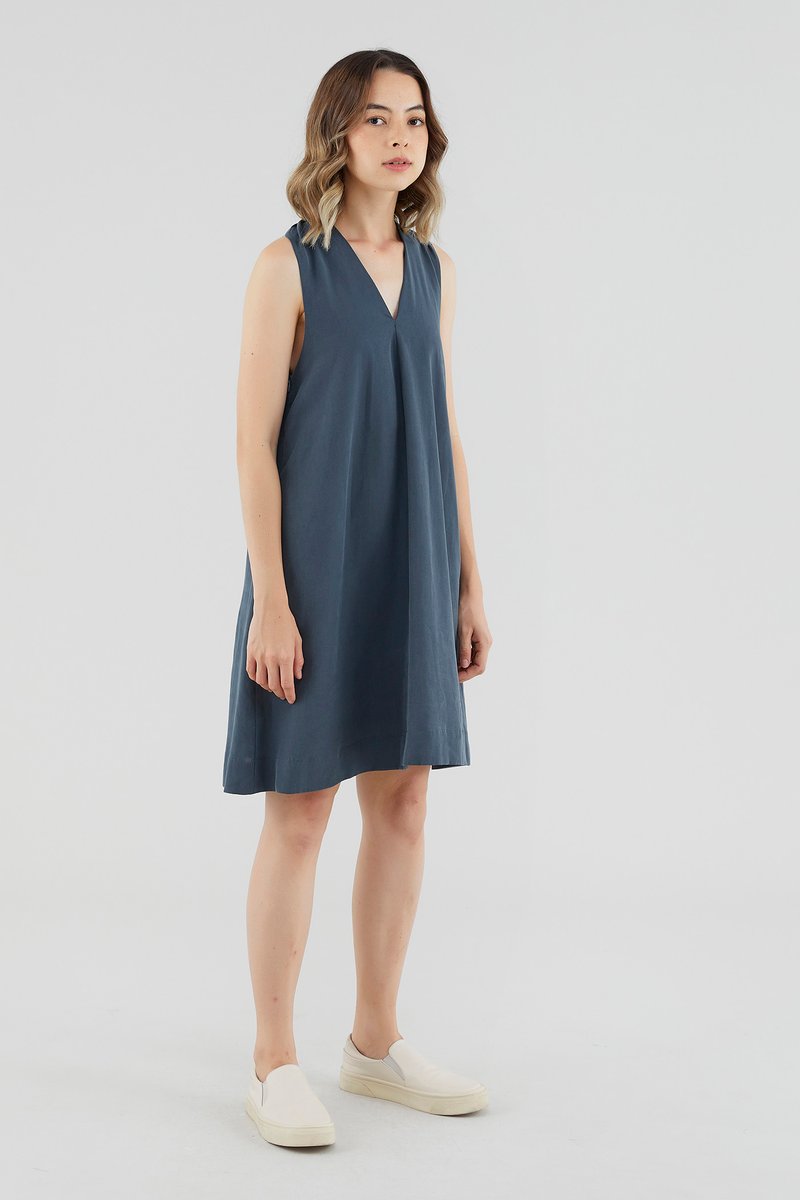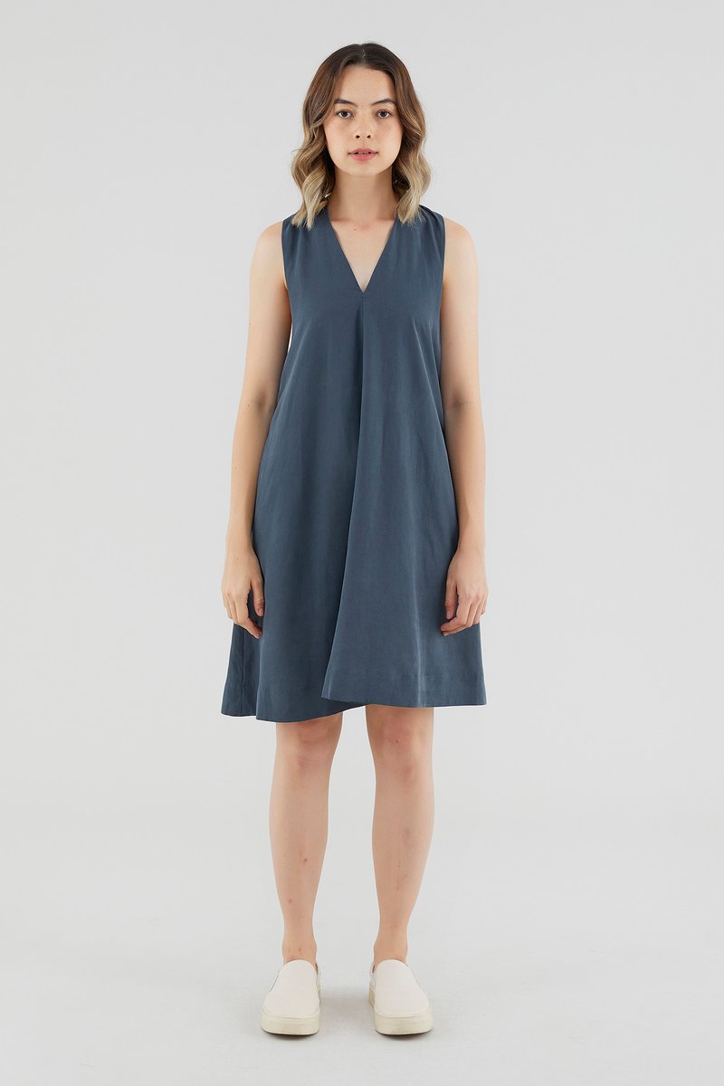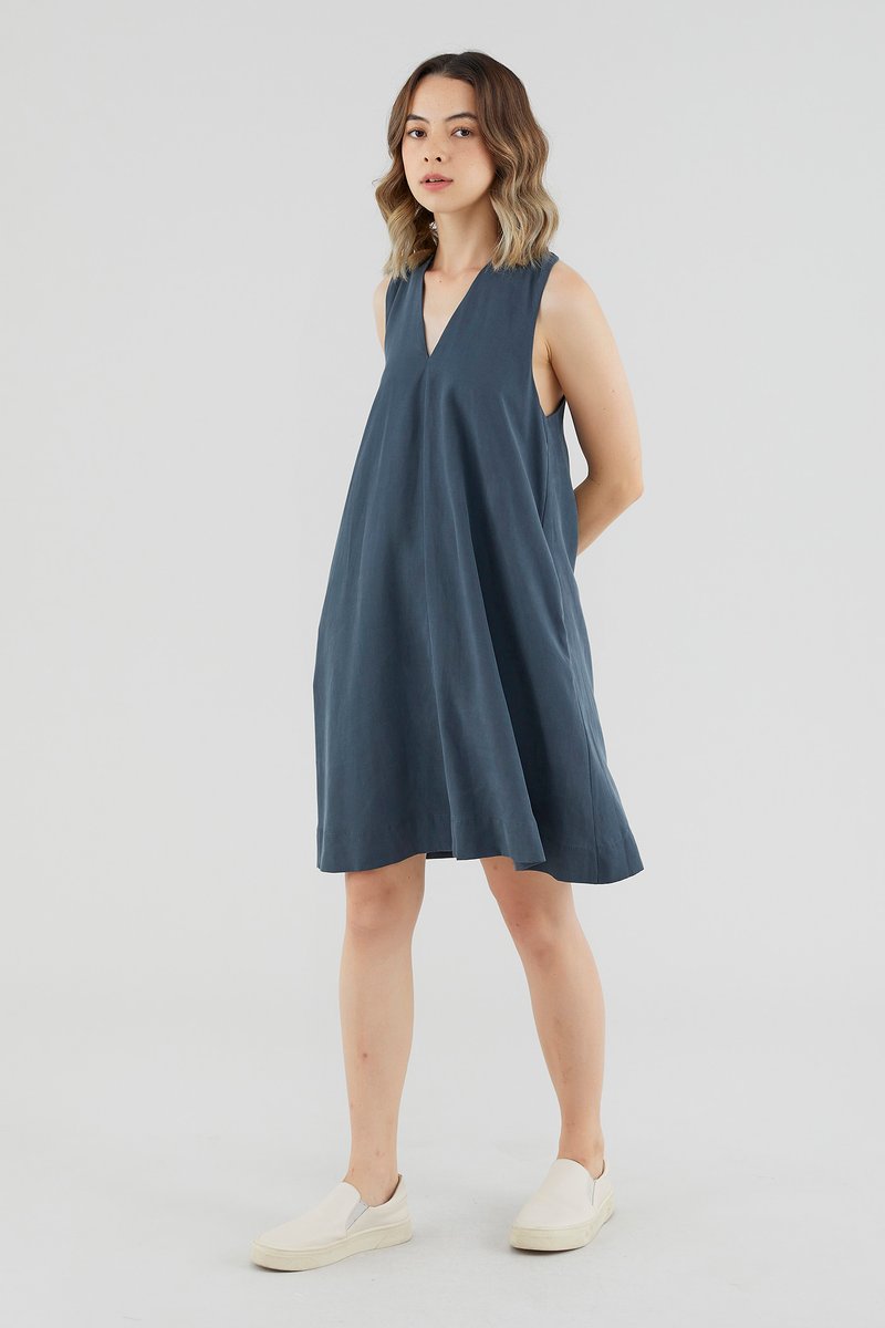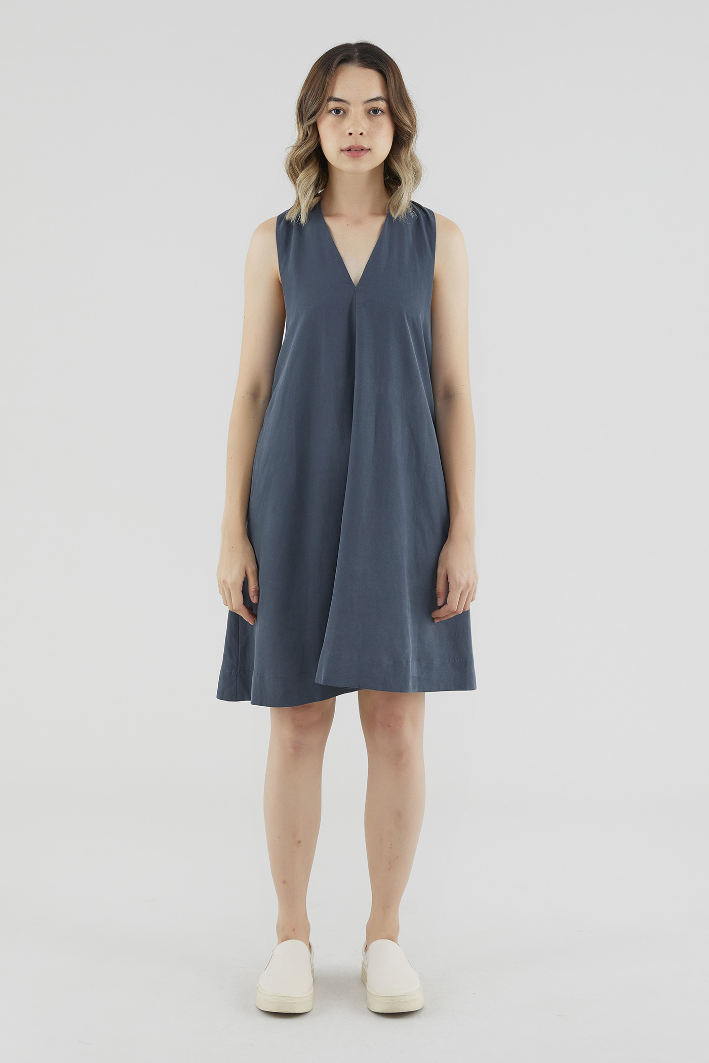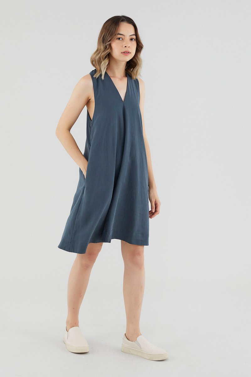 Bold details. Made from smooth and drapey fabric, this sleeveless dress features a deep V-neckline, a drapey racerback with a slit opening, and a side zip closure. Fits above the knee in a relaxed trapeze silhouette.