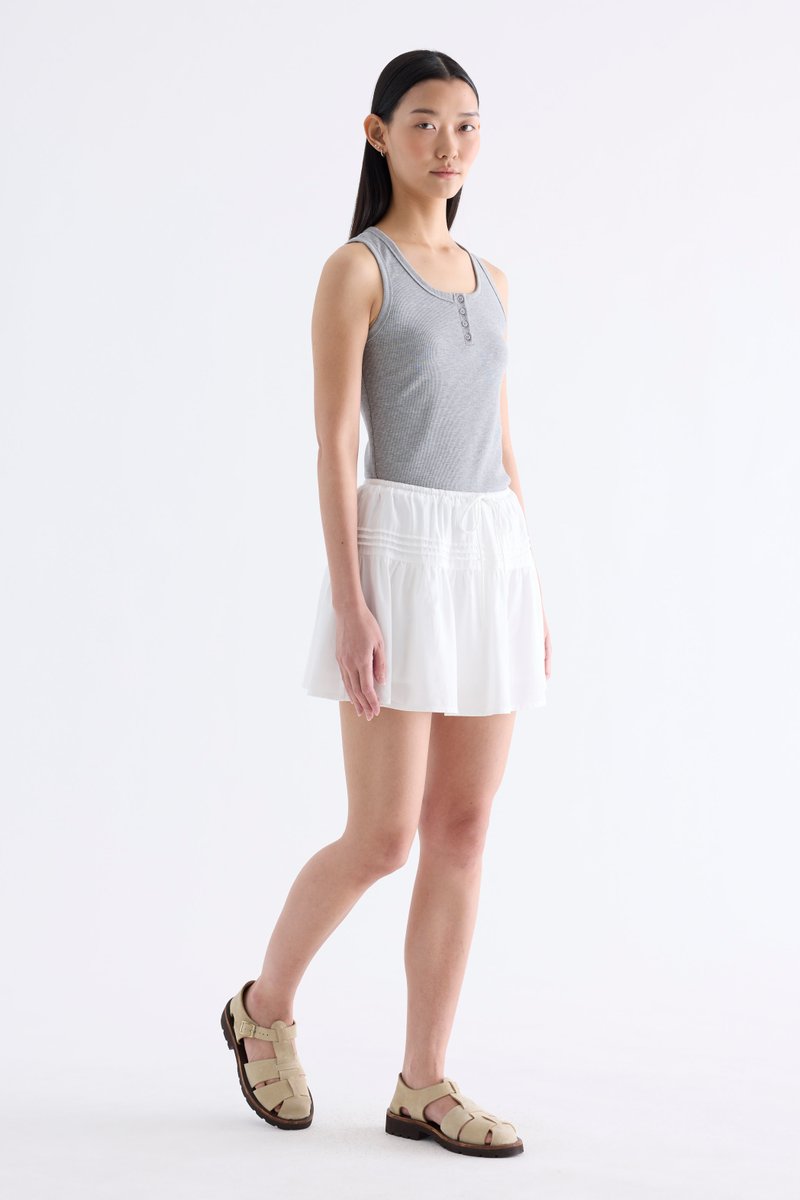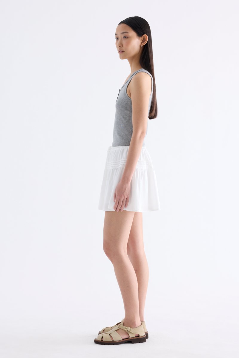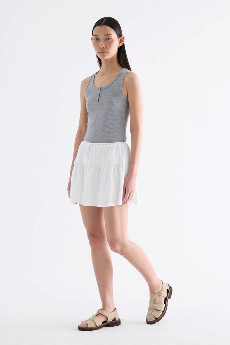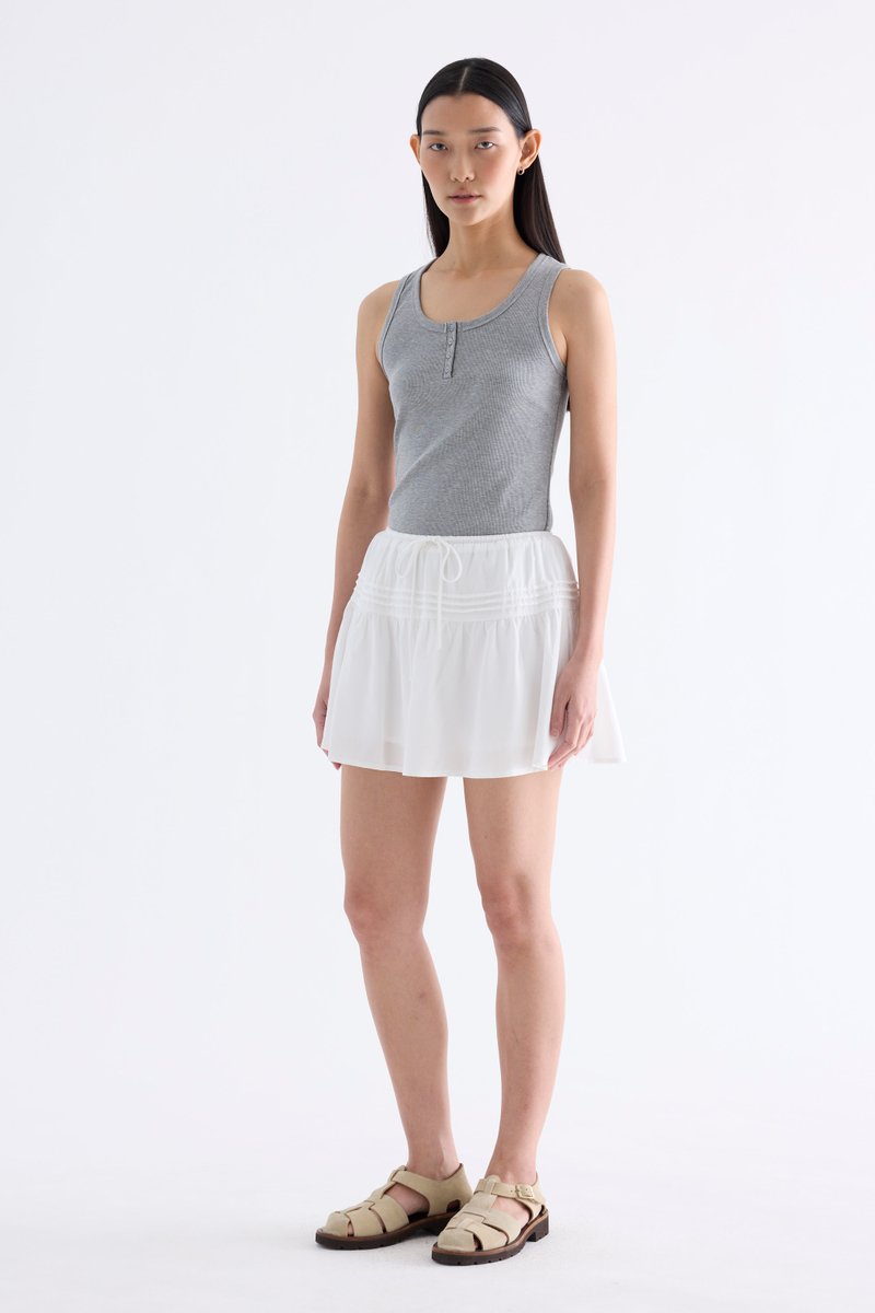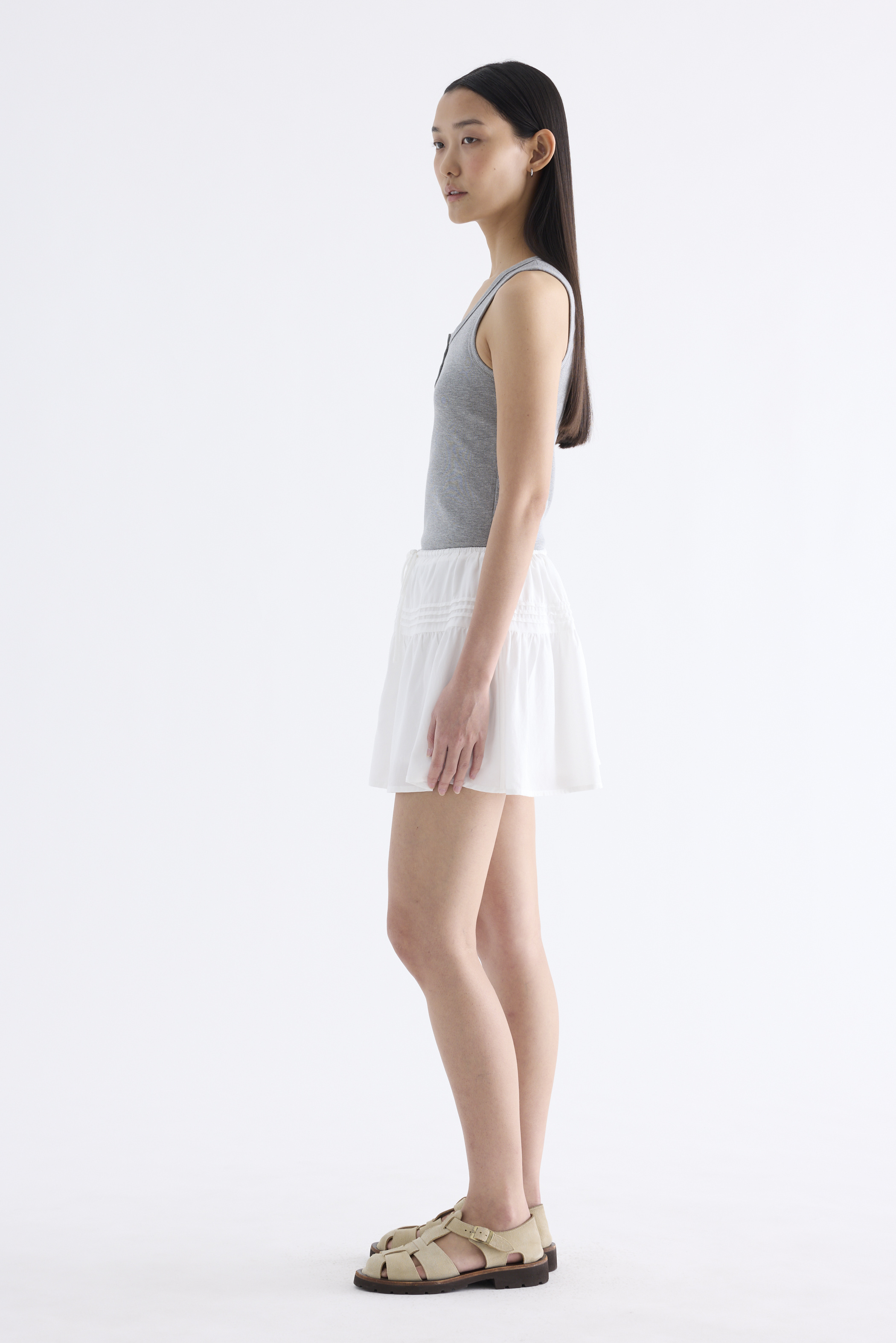 Short of nothing. Made from soft and smooth fabric, this skirt features an elasticated drawstring waistband, pin-tuck pleats along its length and an easy, flared silhouette. Worn in a relaxed fit.