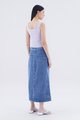 Refresh your denims. Cut from softly structured cotton, this button-down maxi skirt features a high waist, belt loops, panelling, and a front zip and button closure. Worn in a slim fit.