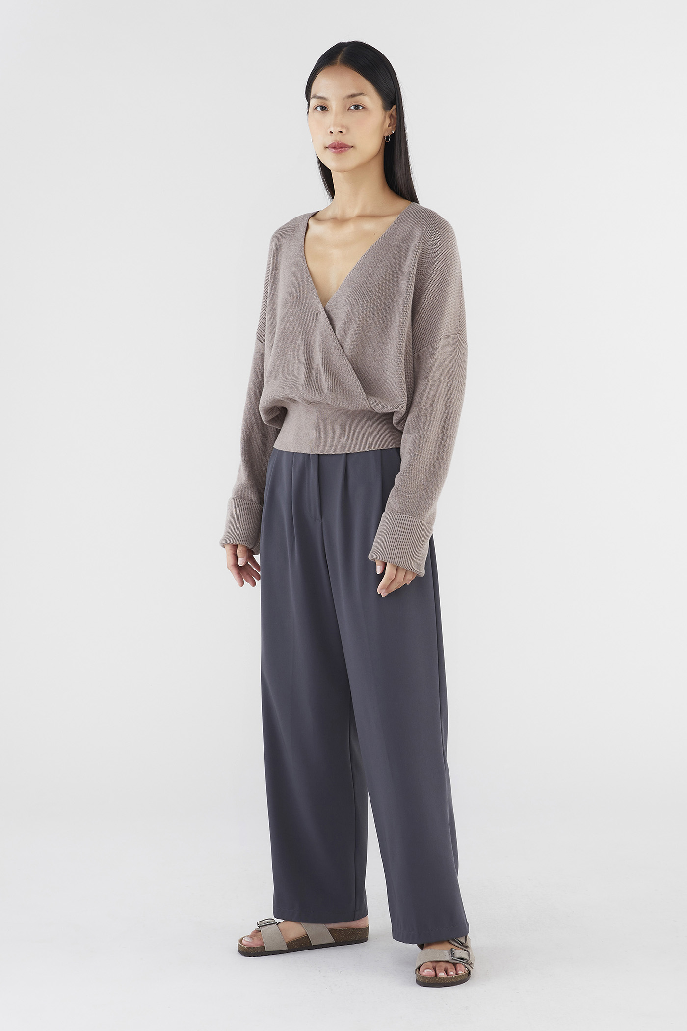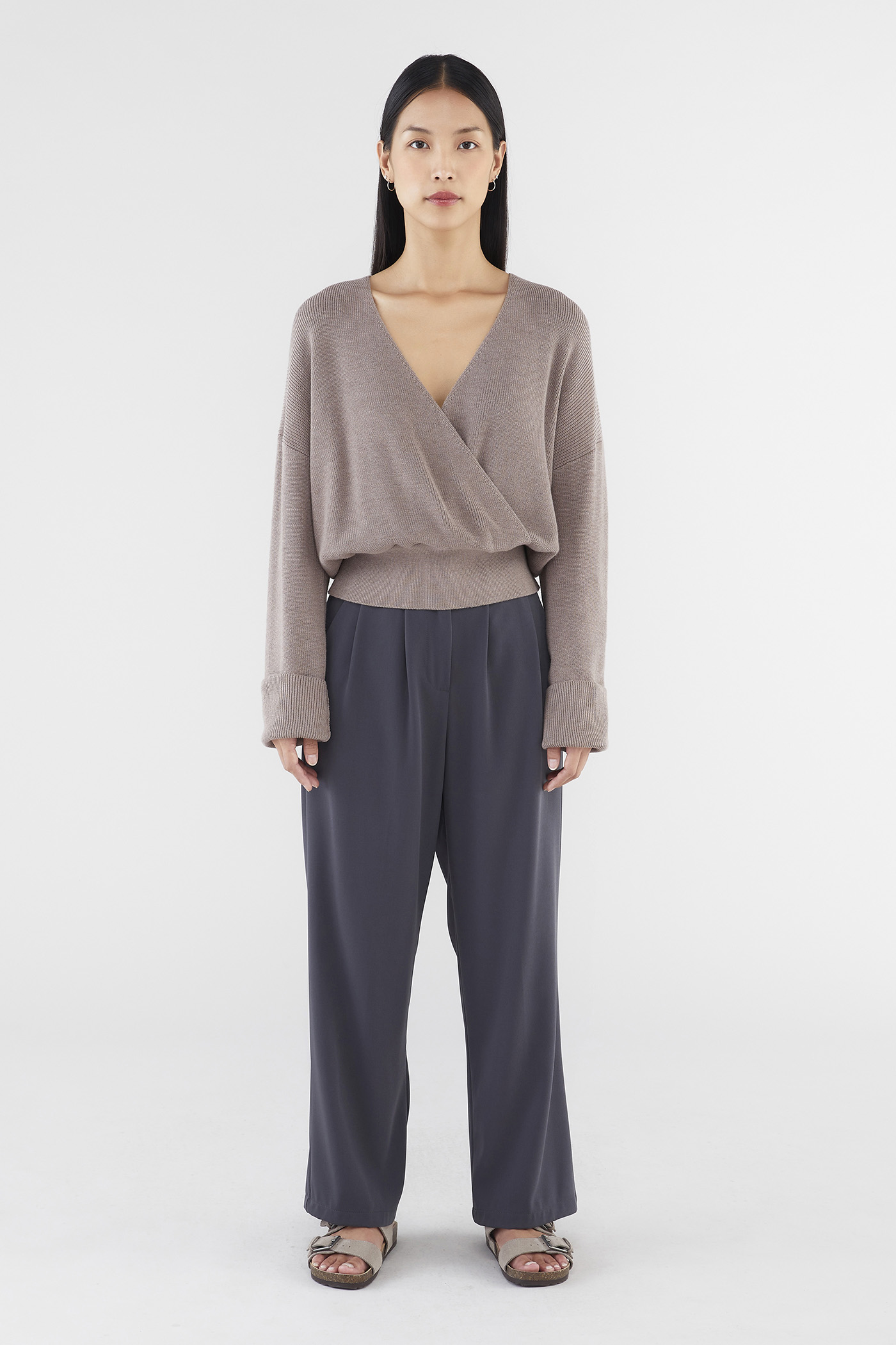 Layers, but make them cosy. Made from soft and cosy knit, this top features extra-long sleeves, a deep, wrap-over neckline and a wide hemline. Worn in a slouchy, oversized fit and slightly cropped length.