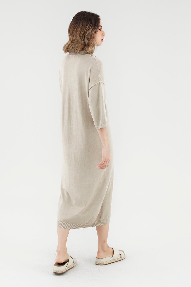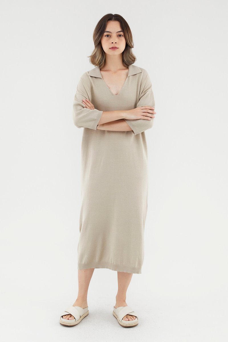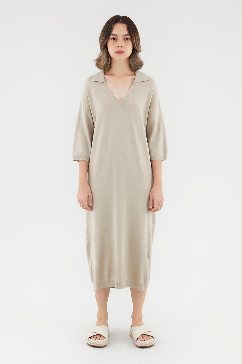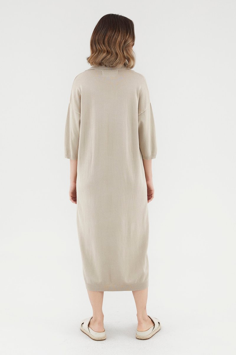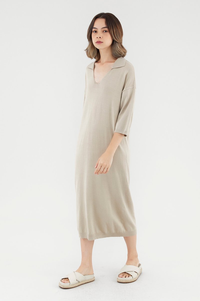 <p><span style="font-weight: 400;">Fabric Composition: 100% Viscose</span></p> <p><span style="font-weight: 400;">Lining: None</span></p> <p><span style="font-weight: 400;">Sheerness: Opaque</span></p> <p><span style="font-weight: 400;">Pockets: None</span></p> <p><span style="font-weight: 400;">Comfort first. Made from soft and stretchy knit fabric, this midi dress features half sleeves, dropped shoulders, a collared V-neckline and a ribbed hemline. Worn in a relaxed, oversized fit. </span></p> <p><span style="font-weight: 400;">Care Instructions: Do not soak / Do not bleach / Handwash or Machine wash on gentle mode / Do not machine dry / Iron using low heat</span></p>