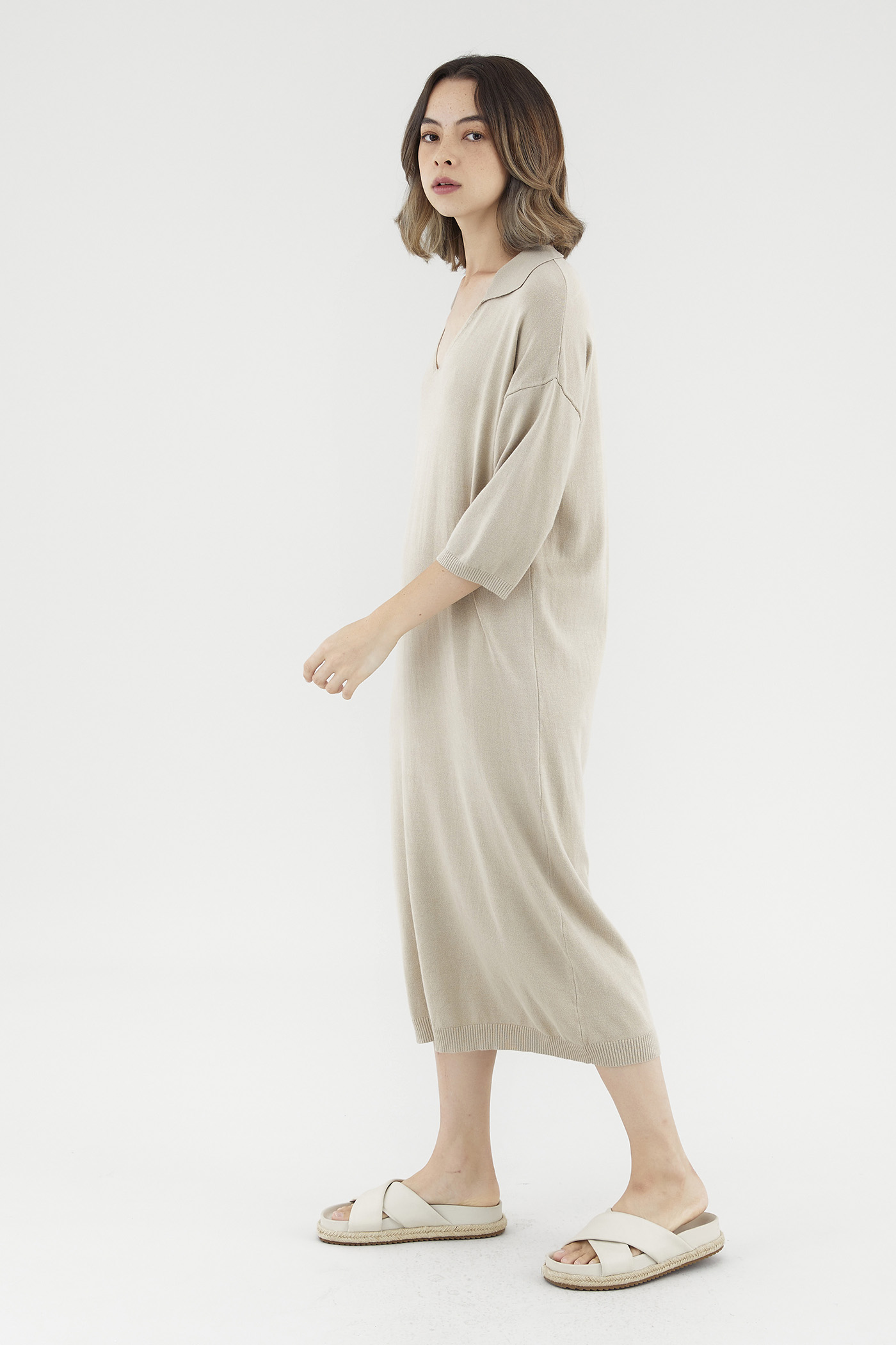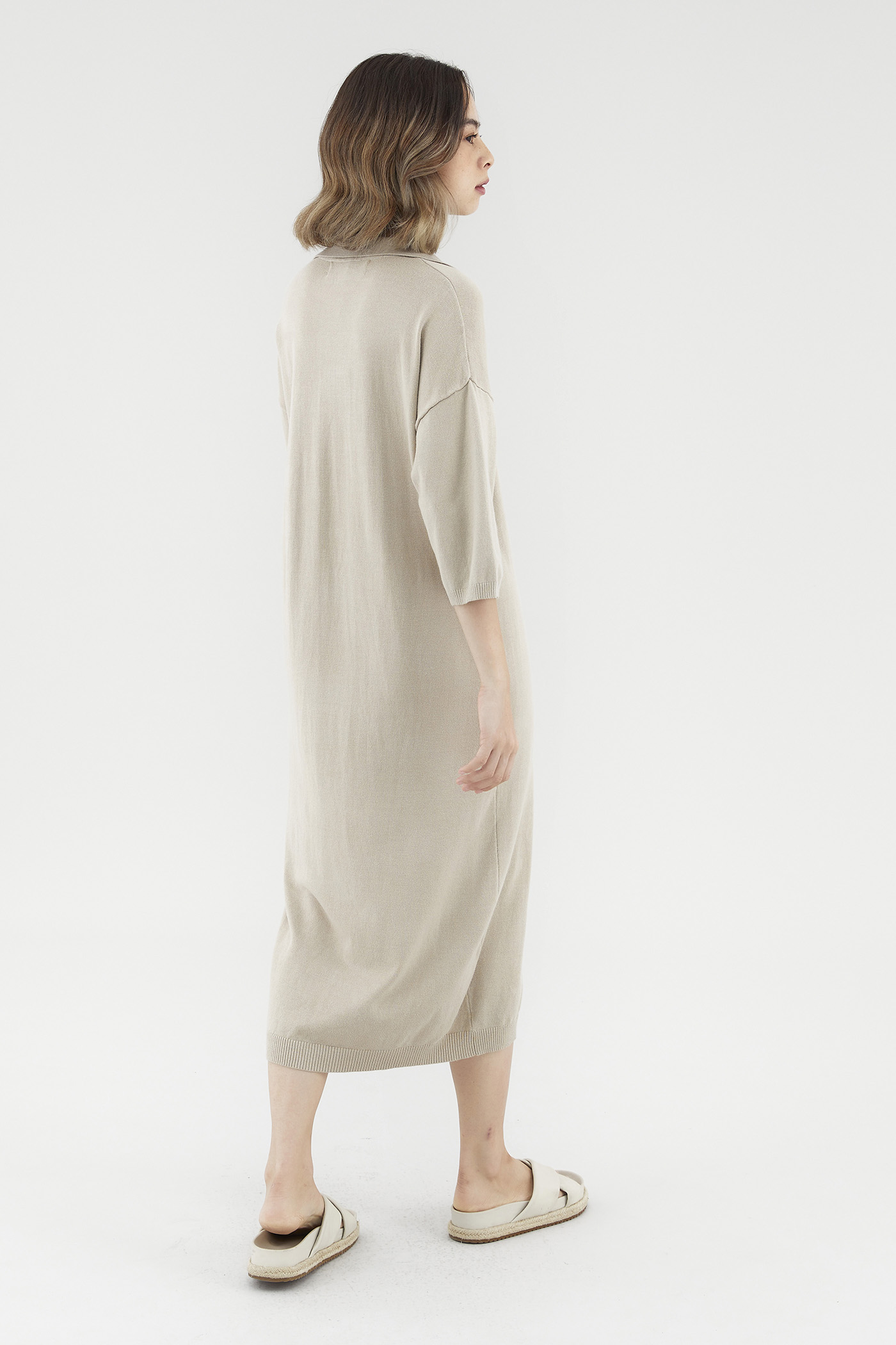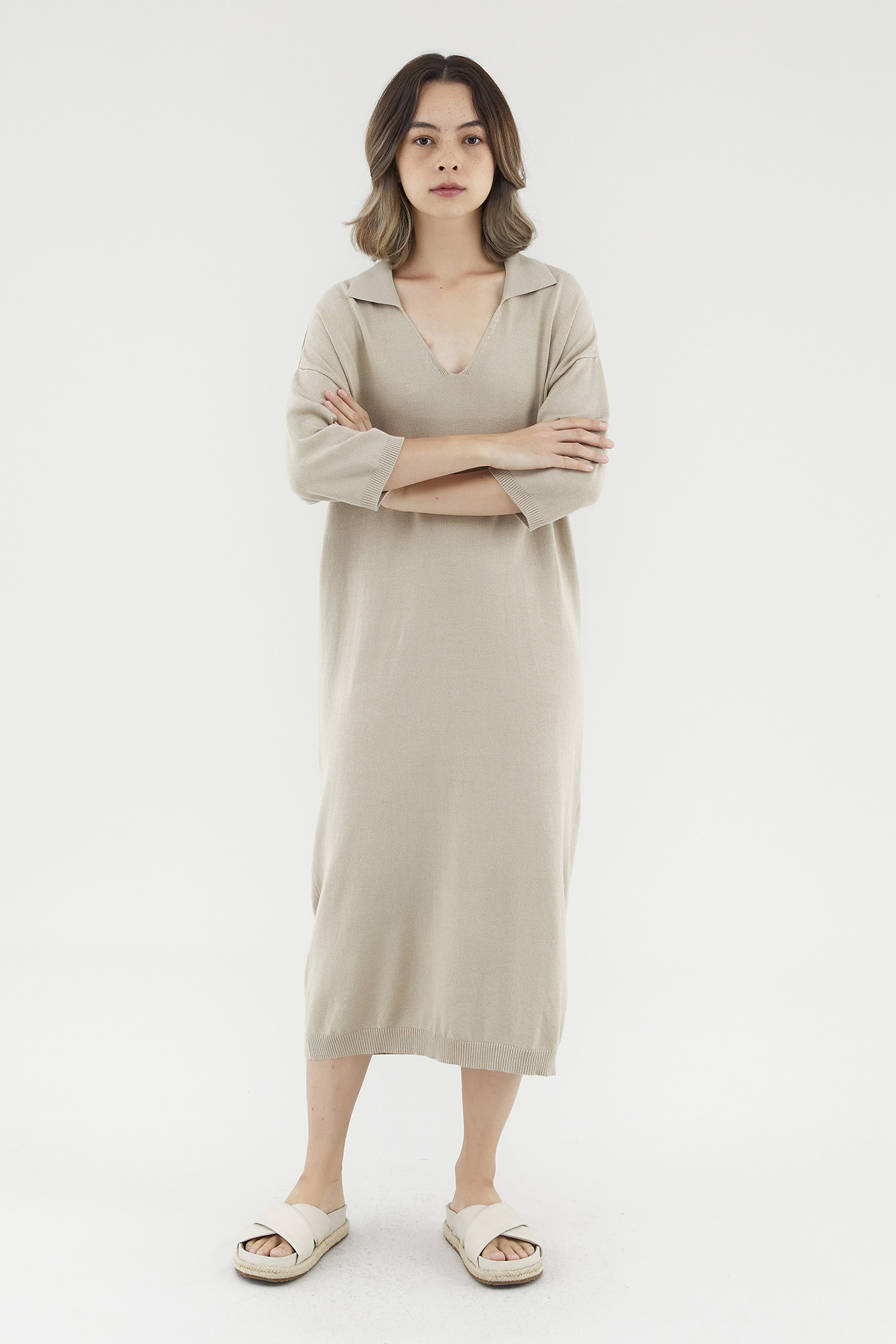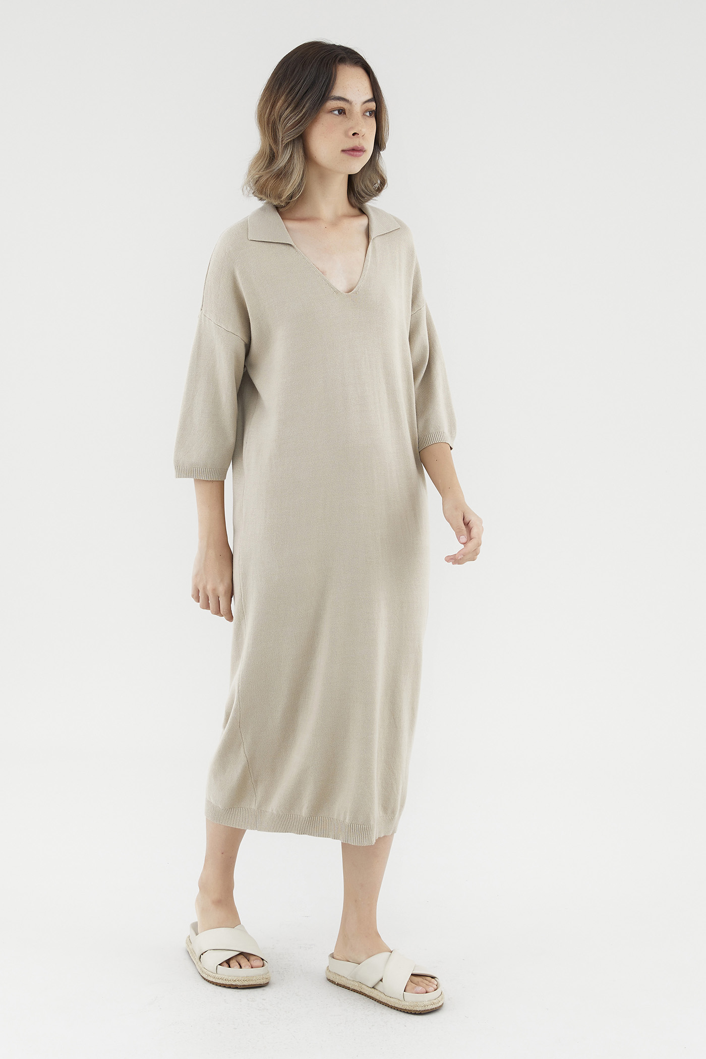 <p><span style="font-weight: 400;">Fabric Composition: 100% Viscose</span></p> <p><span style="font-weight: 400;">Lining: None</span></p> <p><span style="font-weight: 400;">Sheerness: Opaque</span></p> <p><span style="font-weight: 400;">Pockets: None</span></p> <p><span style="font-weight: 400;">Comfort first. Made from soft and stretchy knit fabric, this midi dress features half sleeves, dropped shoulders, a collared V-neckline and a ribbed hemline. Worn in a relaxed, oversized fit. </span></p> <p><span style="font-weight: 400;">Care Instructions: Do not soak / Do not bleach / Handwash or Machine wash on gentle mode / Do not machine dry / Iron using low heat</span></p>
