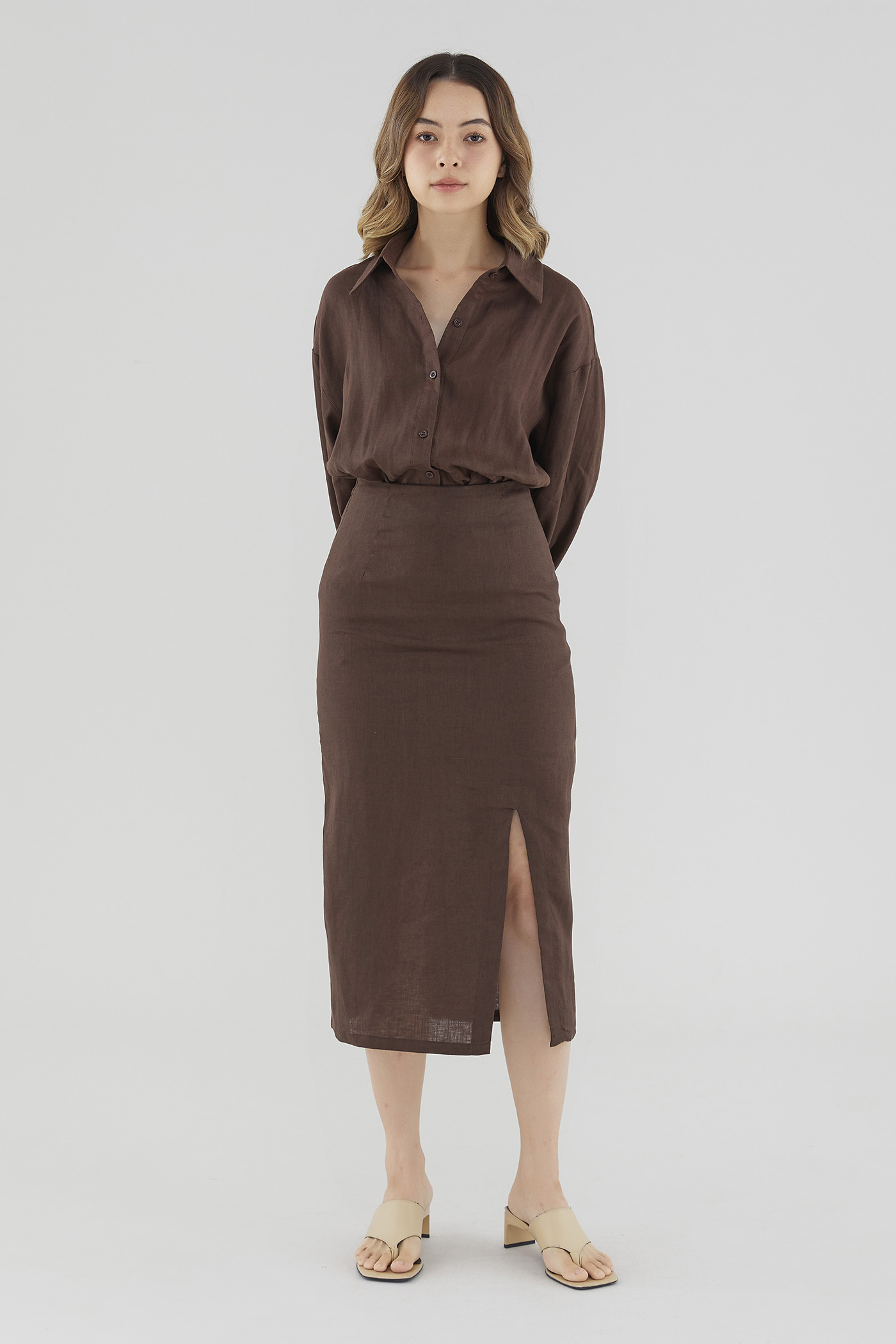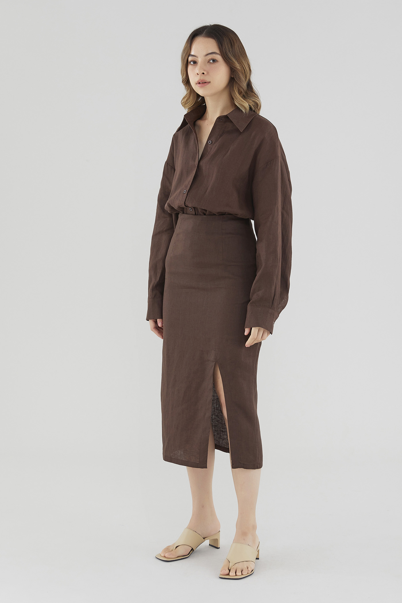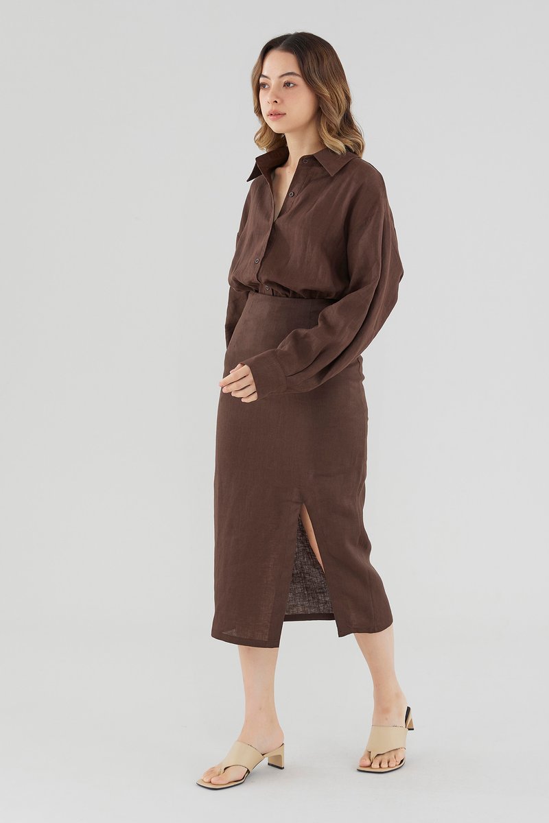 Minimalist-approved. Cut from airy and lightweight 100% linen, this midi skirt features a flattering high waist, slit on the front and zip closure on the back. Fits slim in a sleek slip silhouette.