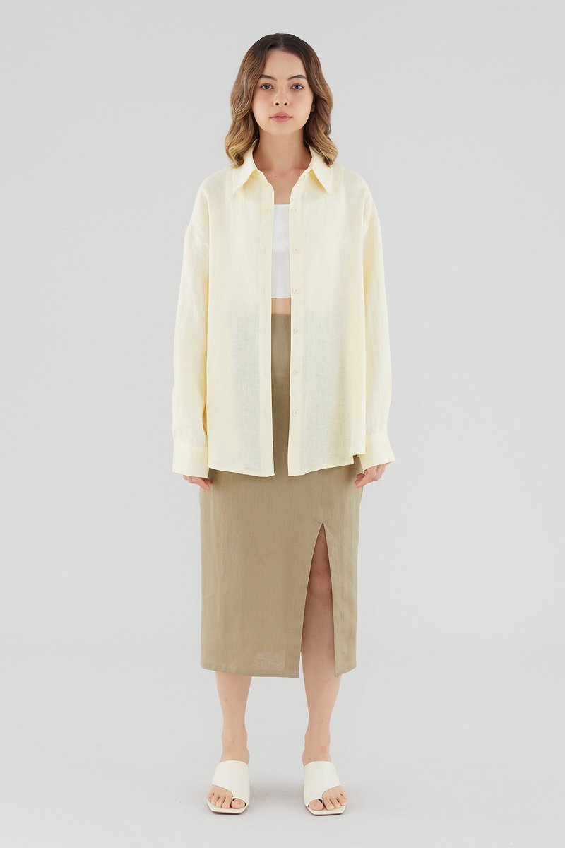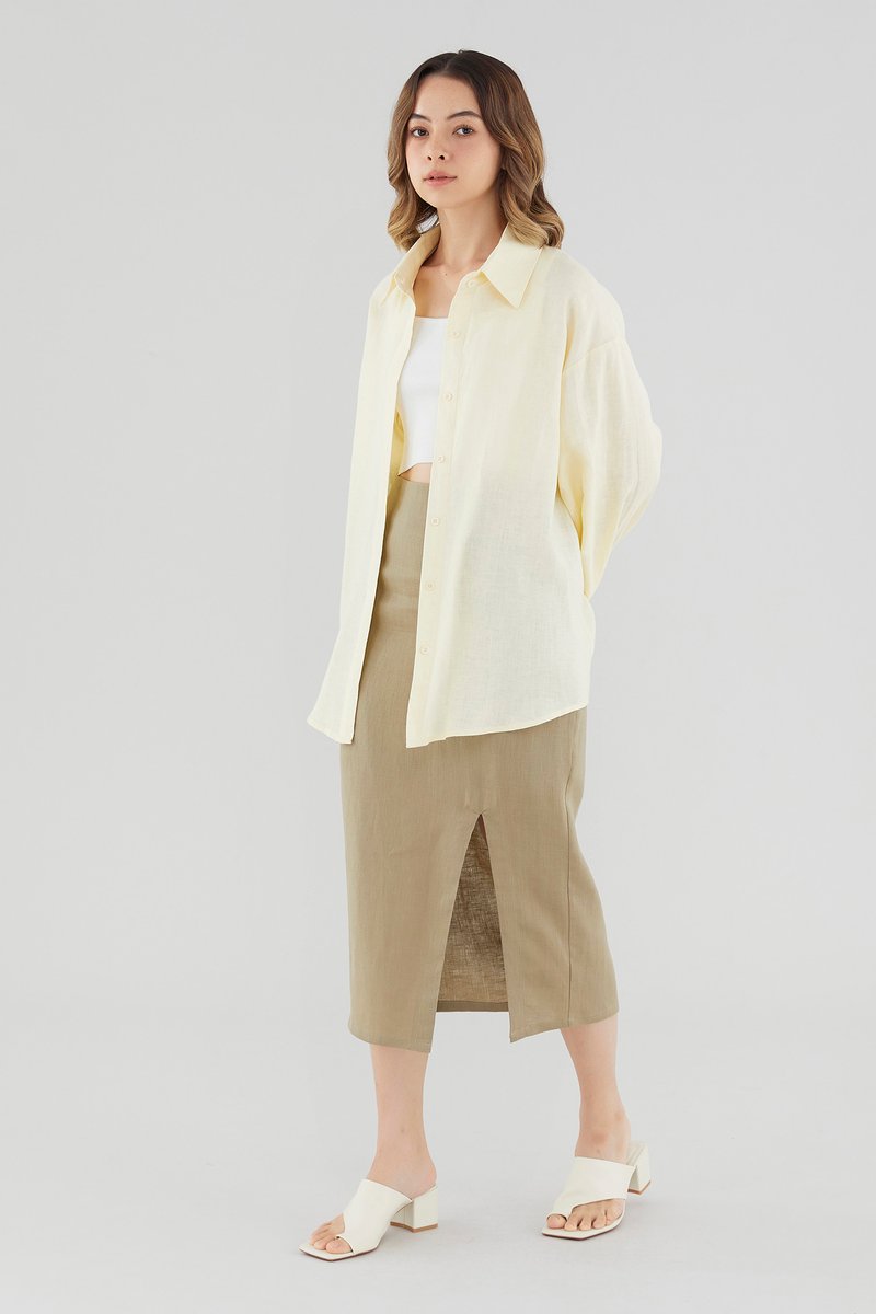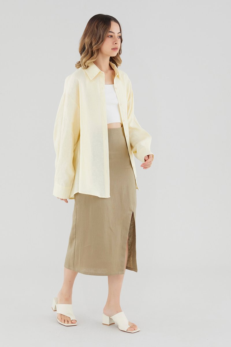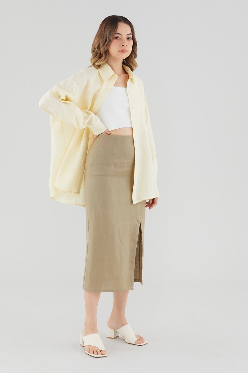 Minimalist-approved. Cut from airy and lightweight 100% linen, this midi skirt features a flattering high waist, slit on the front and zip closure on the back. Fits slim in a sleek slip silhouette.