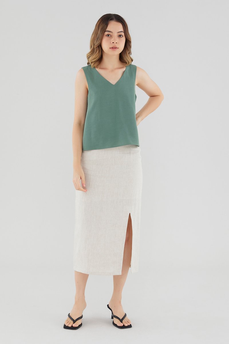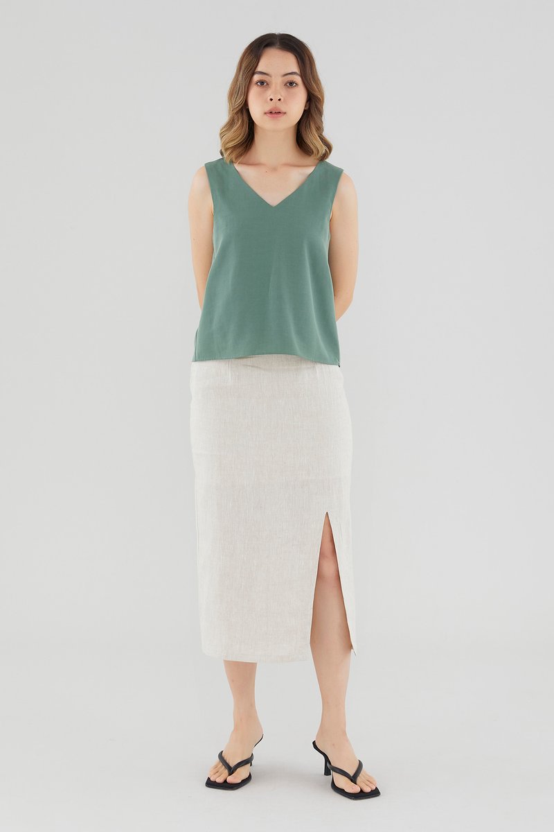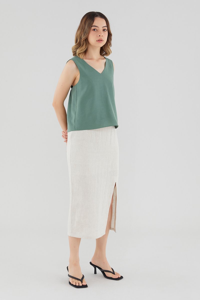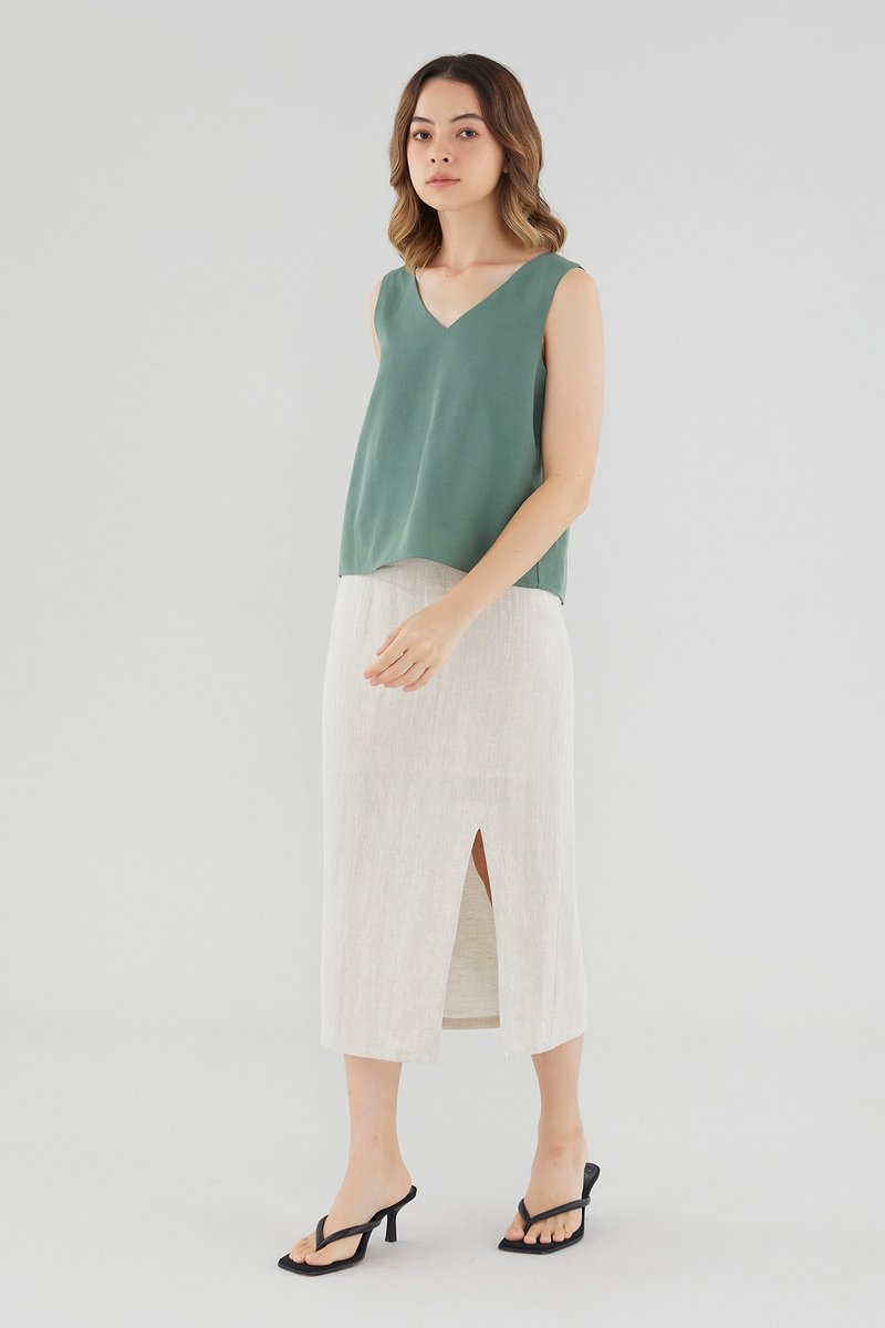 Minimalist-approved. Cut from airy and lightweight 100% linen, this midi skirt features a flattering high waist, slit on the front and zip closure on the back. Fits slim in a sleek slip silhouette.
