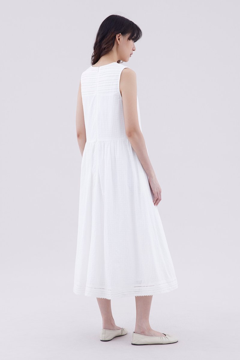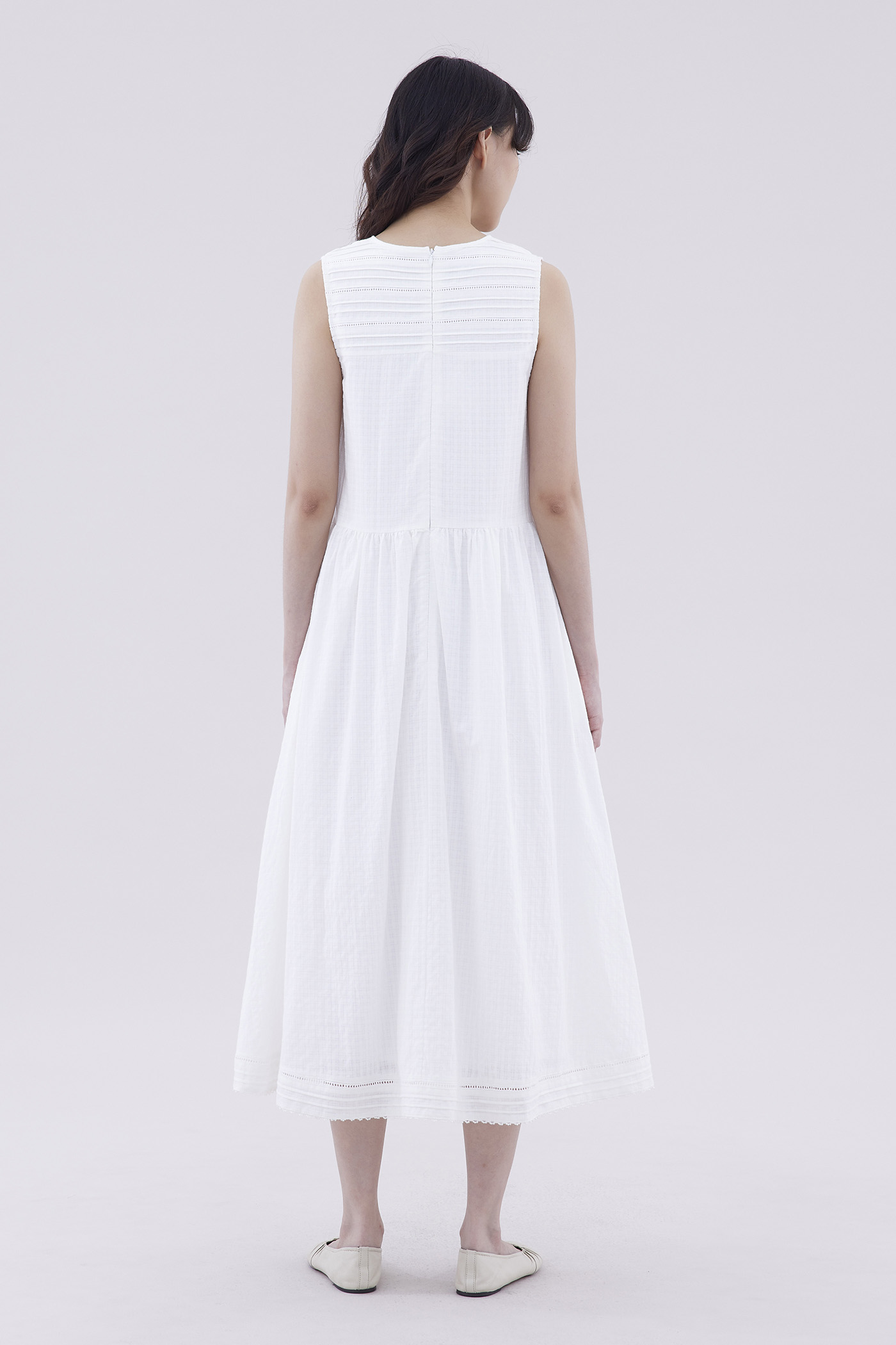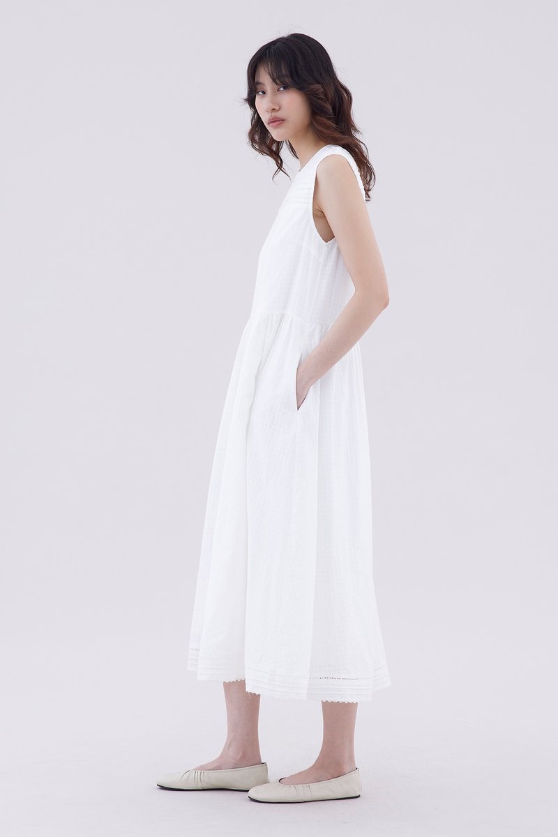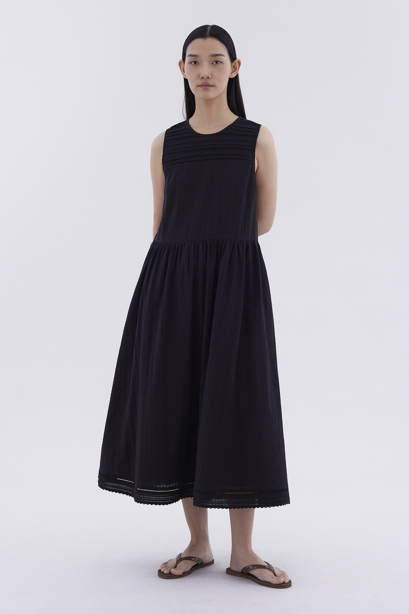 Light textures. Cut from airy and softly structured seersucker cotton, this sleeveless maxi dress features a round neckline, pin-tuck pleats, ladder lace and a back zip closure. Worn in a relaxed fit.