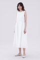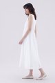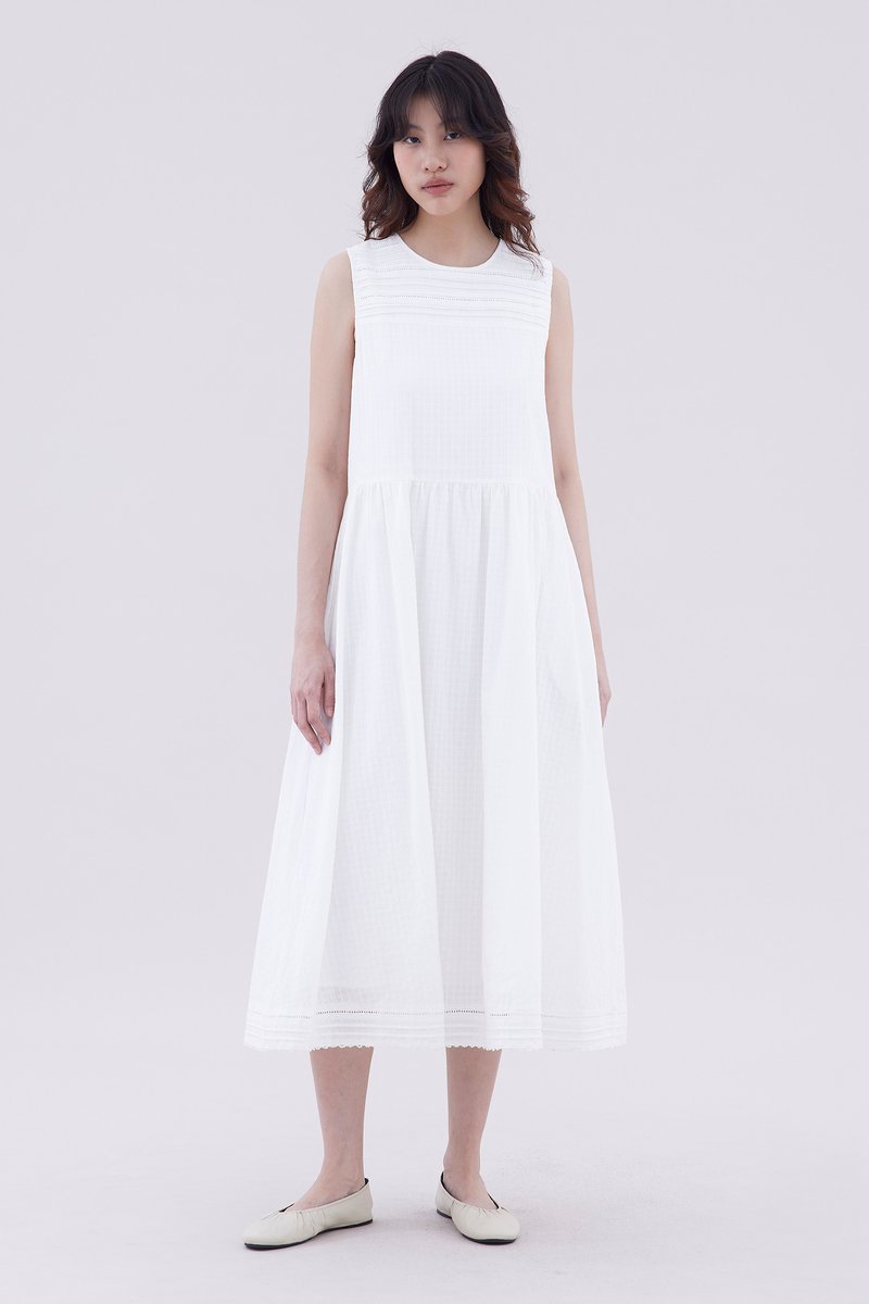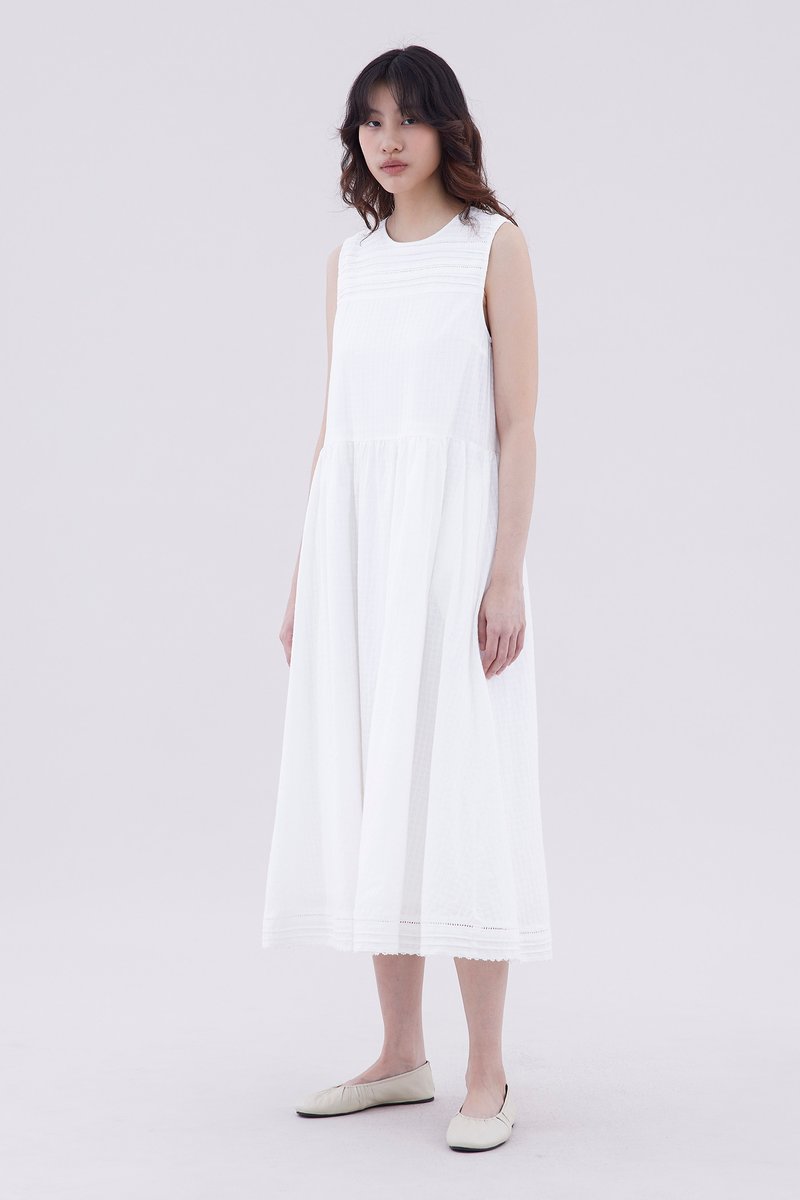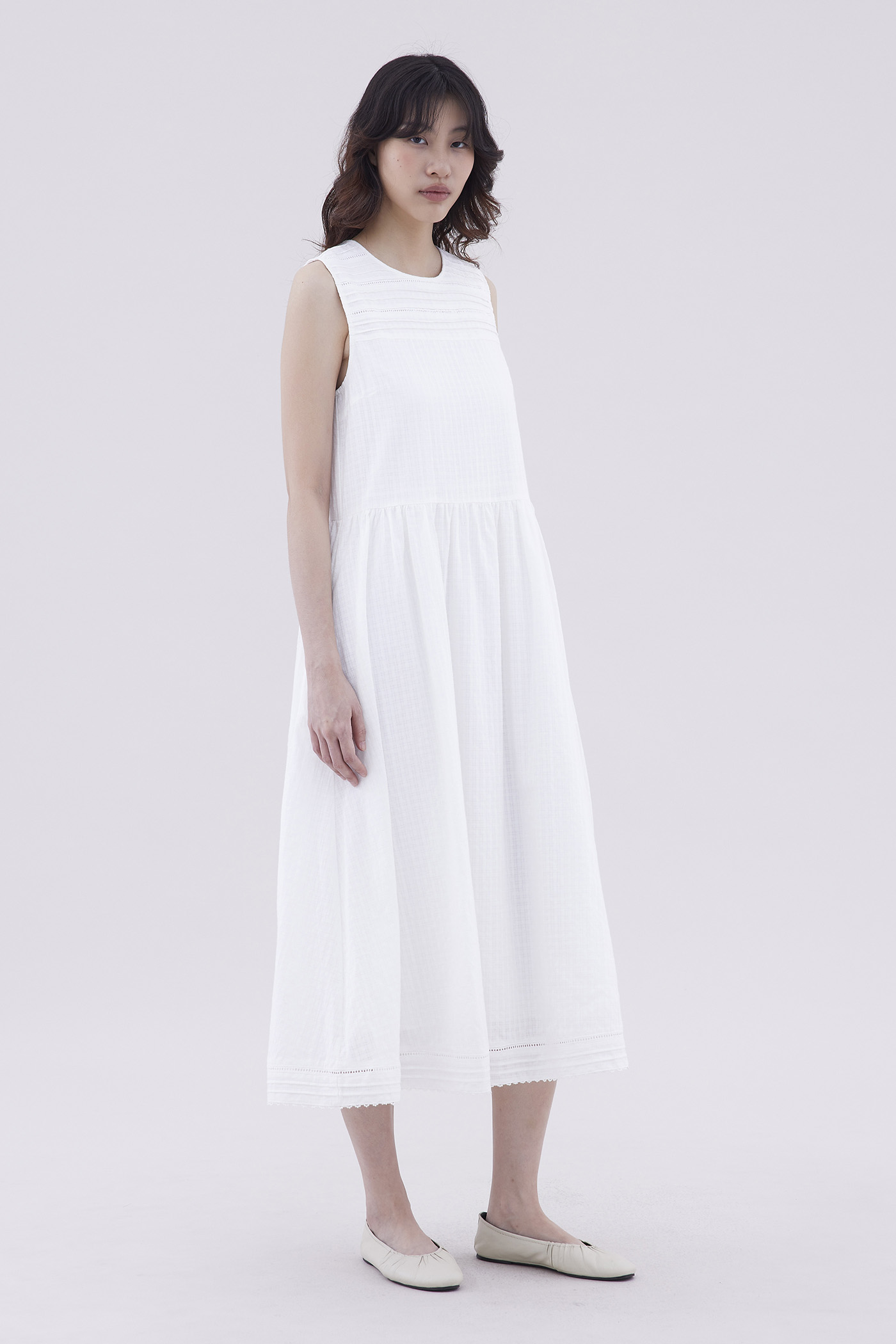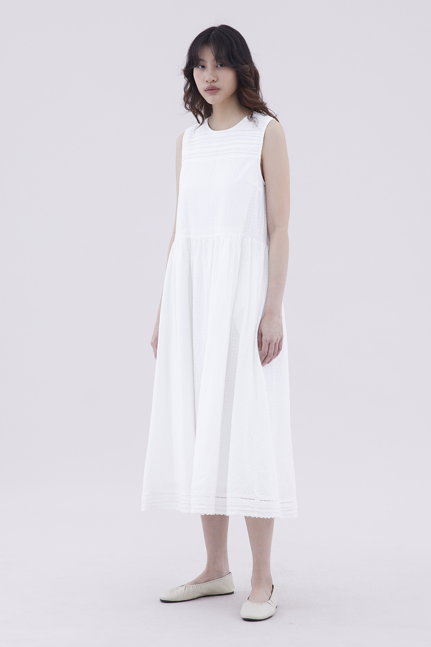 Light textures. Cut from airy and softly structured seersucker cotton, this sleeveless maxi dress features a round neckline, pin-tuck pleats, ladder lace and a back zip closure. Worn in a relaxed fit.