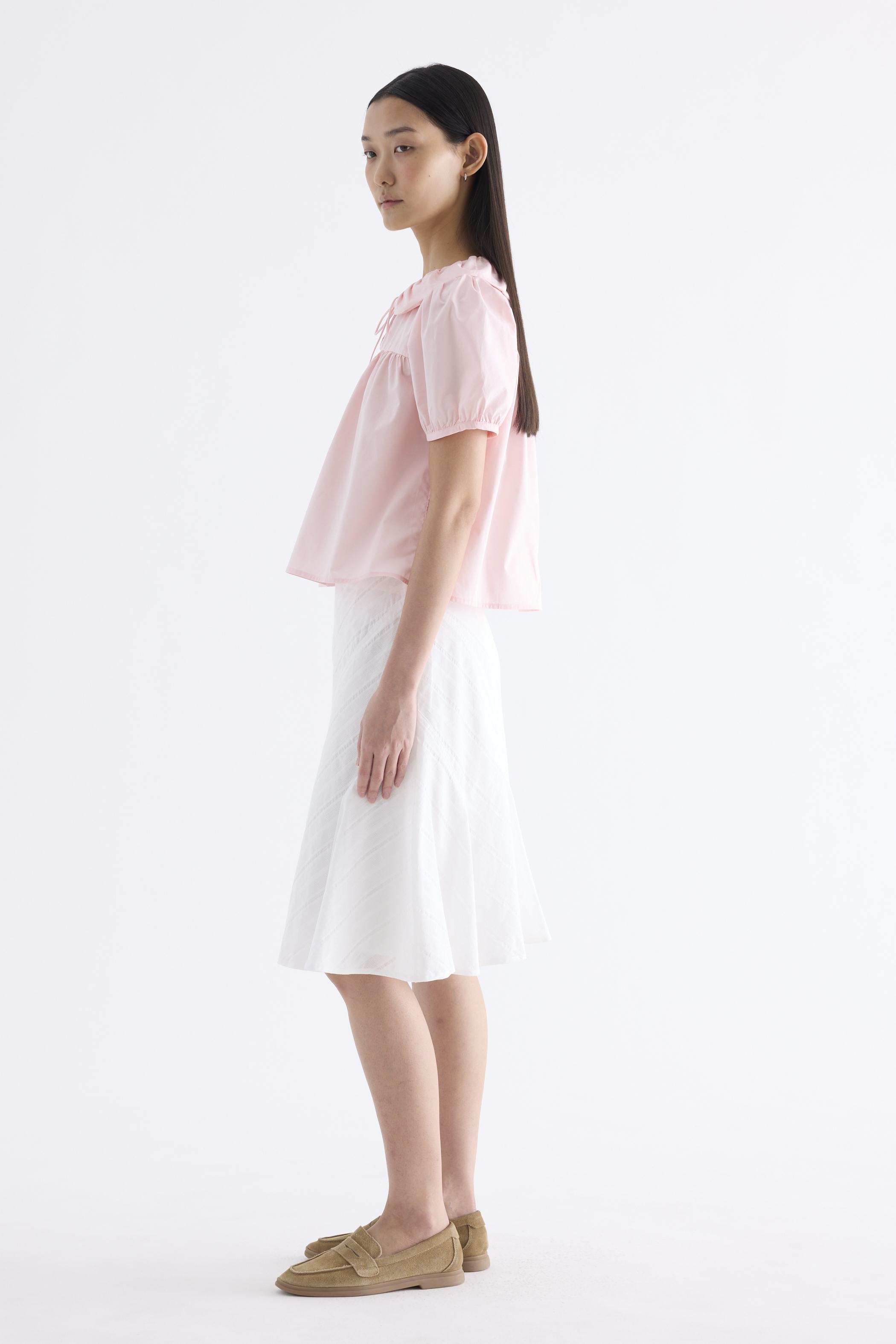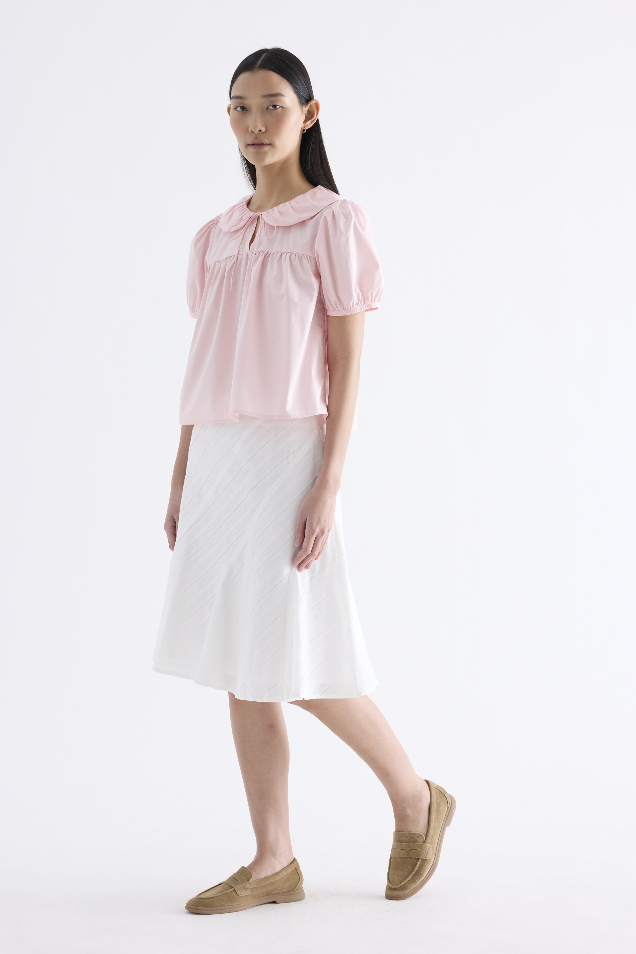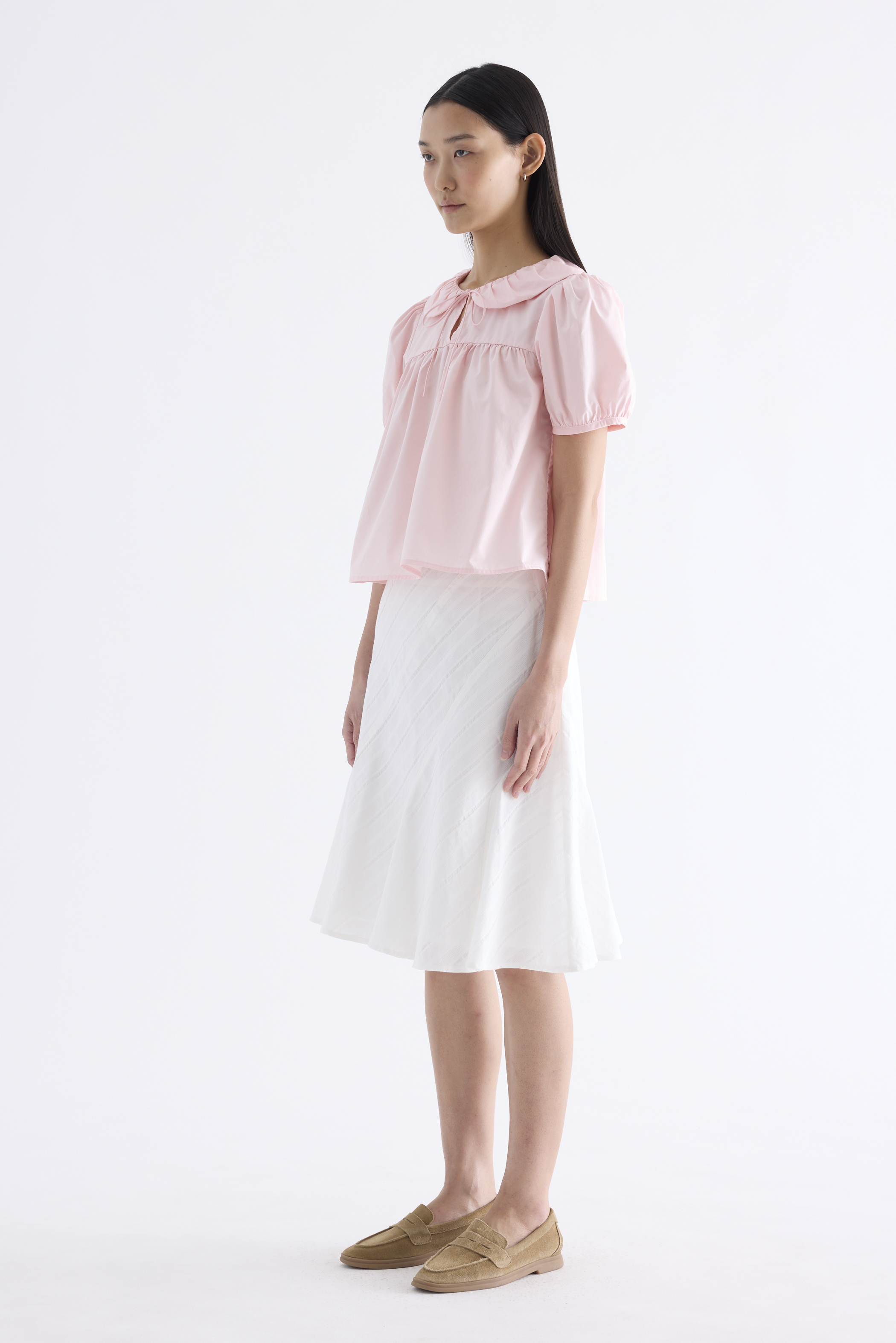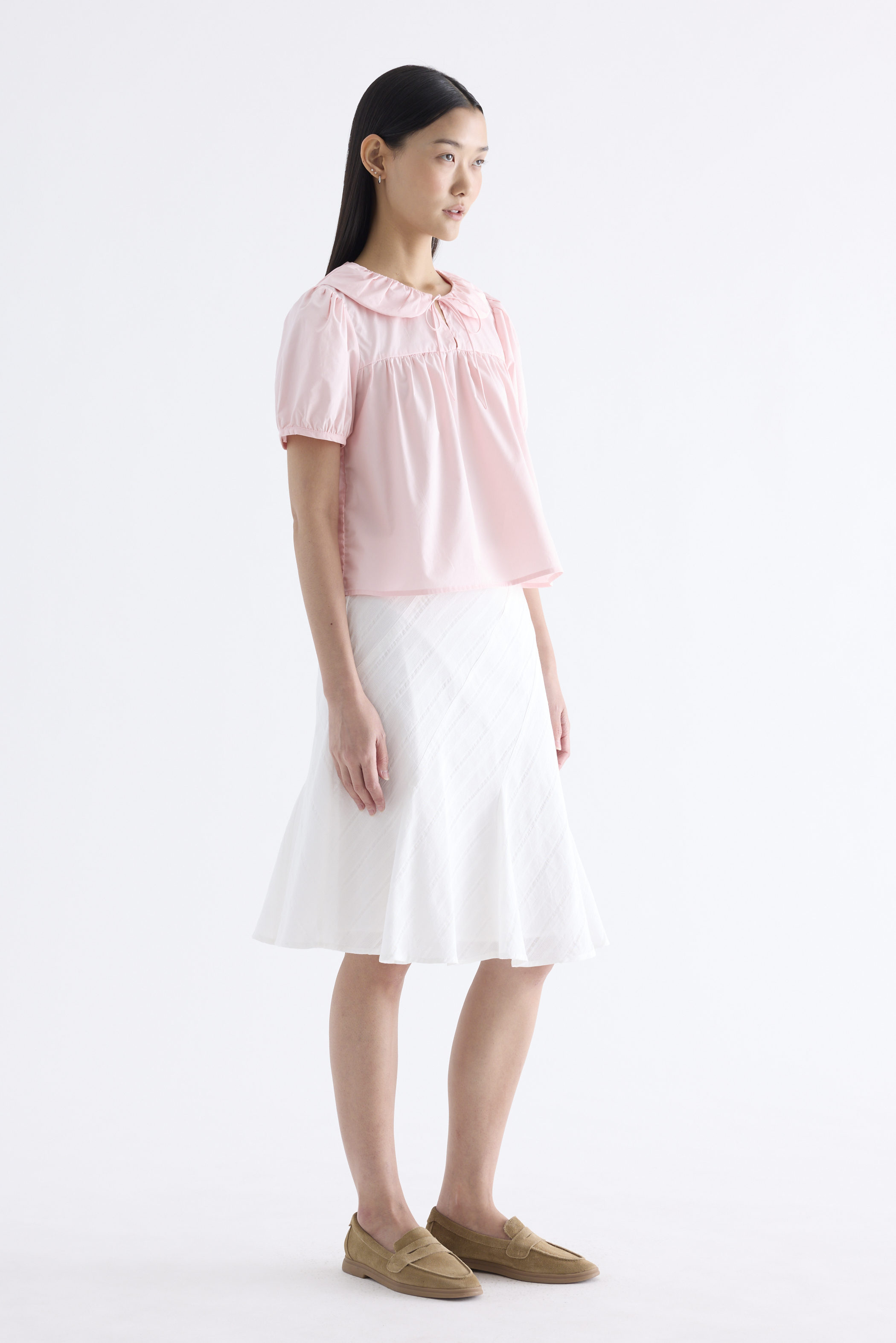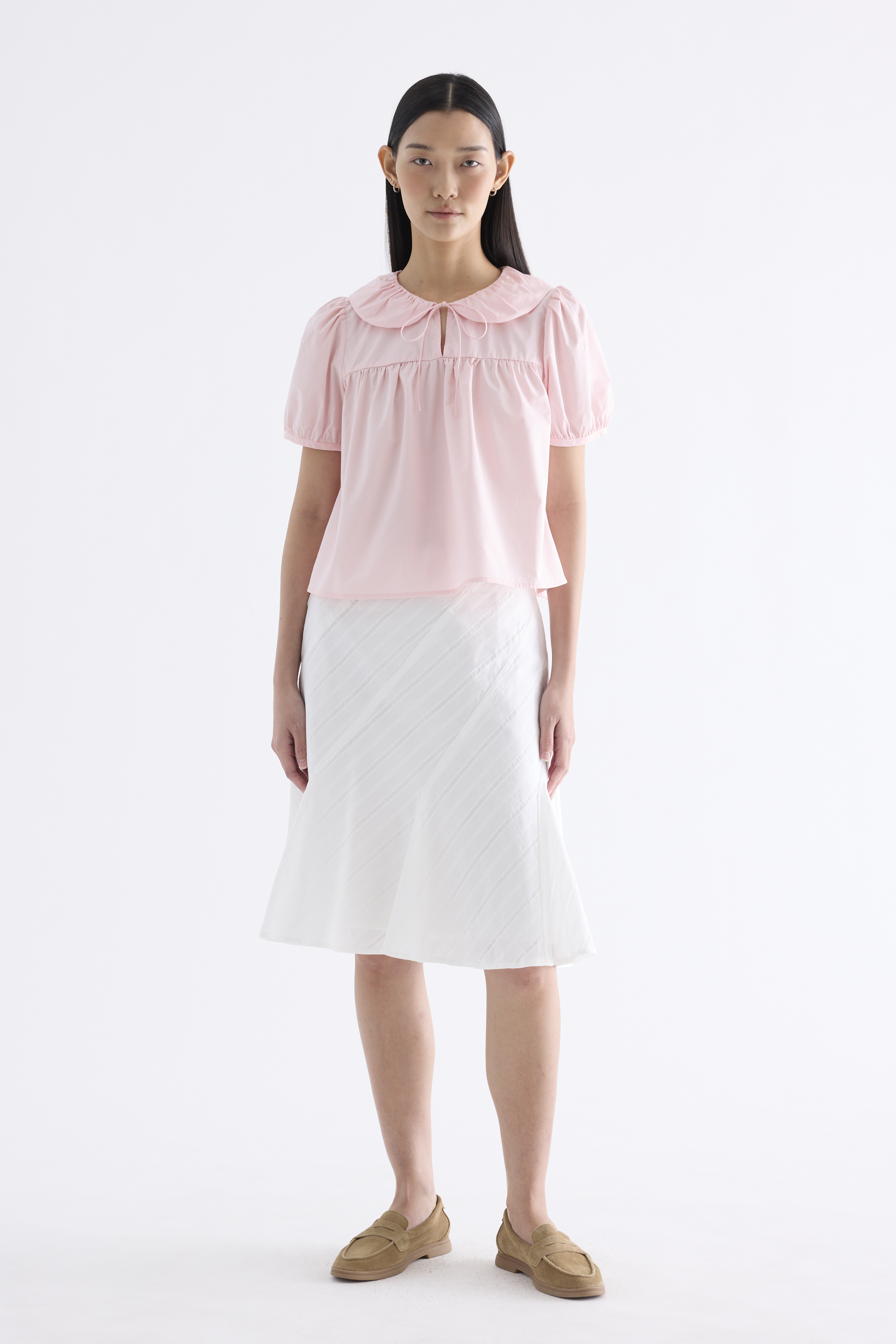 Playful touches. Cut from crisp and softly structured cotton, this blouse features gathered Peter Pan collars, short puffy sleeves and a front keyhole opening with a tie-strap. Fits flared and relaxed.