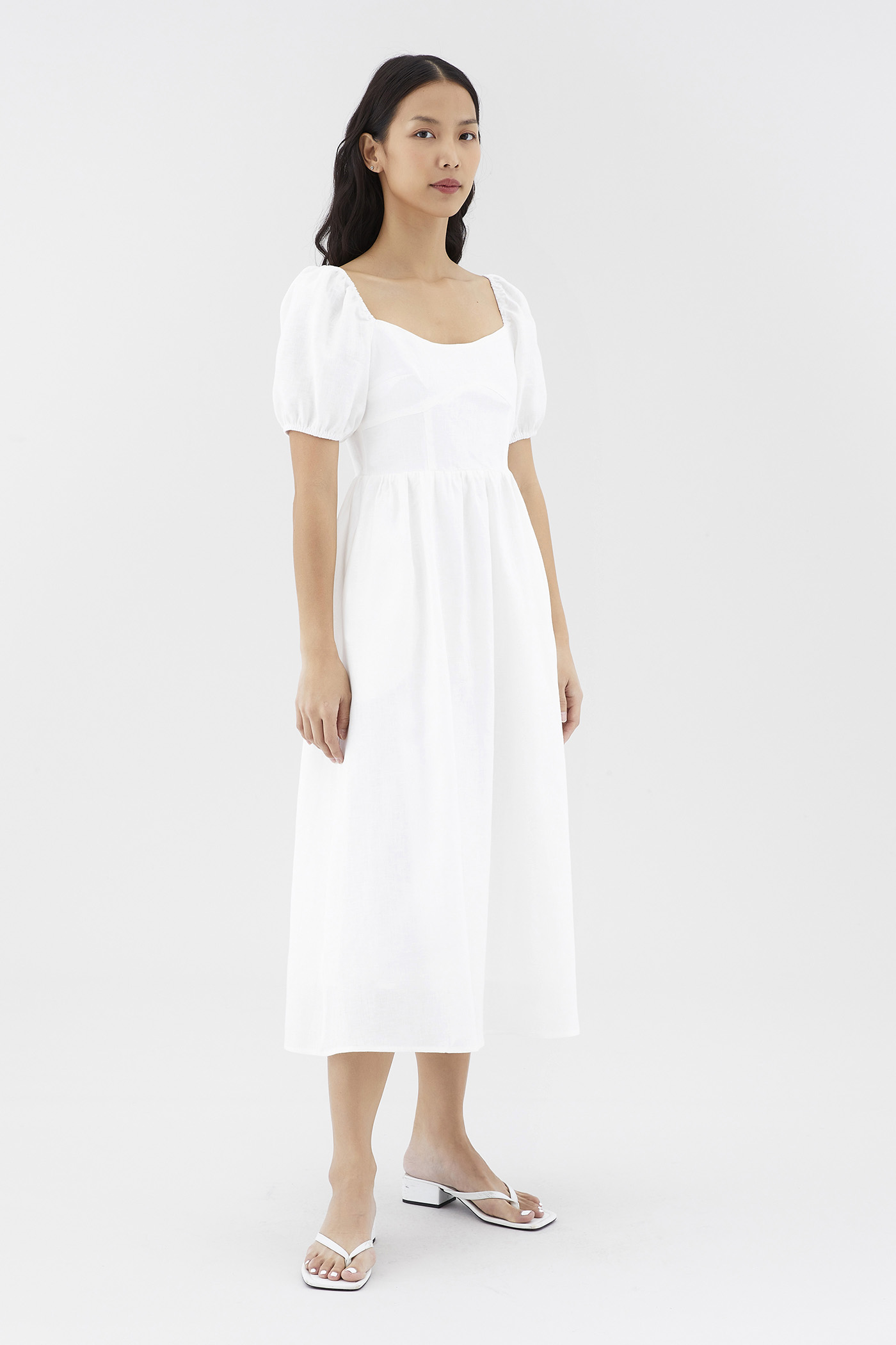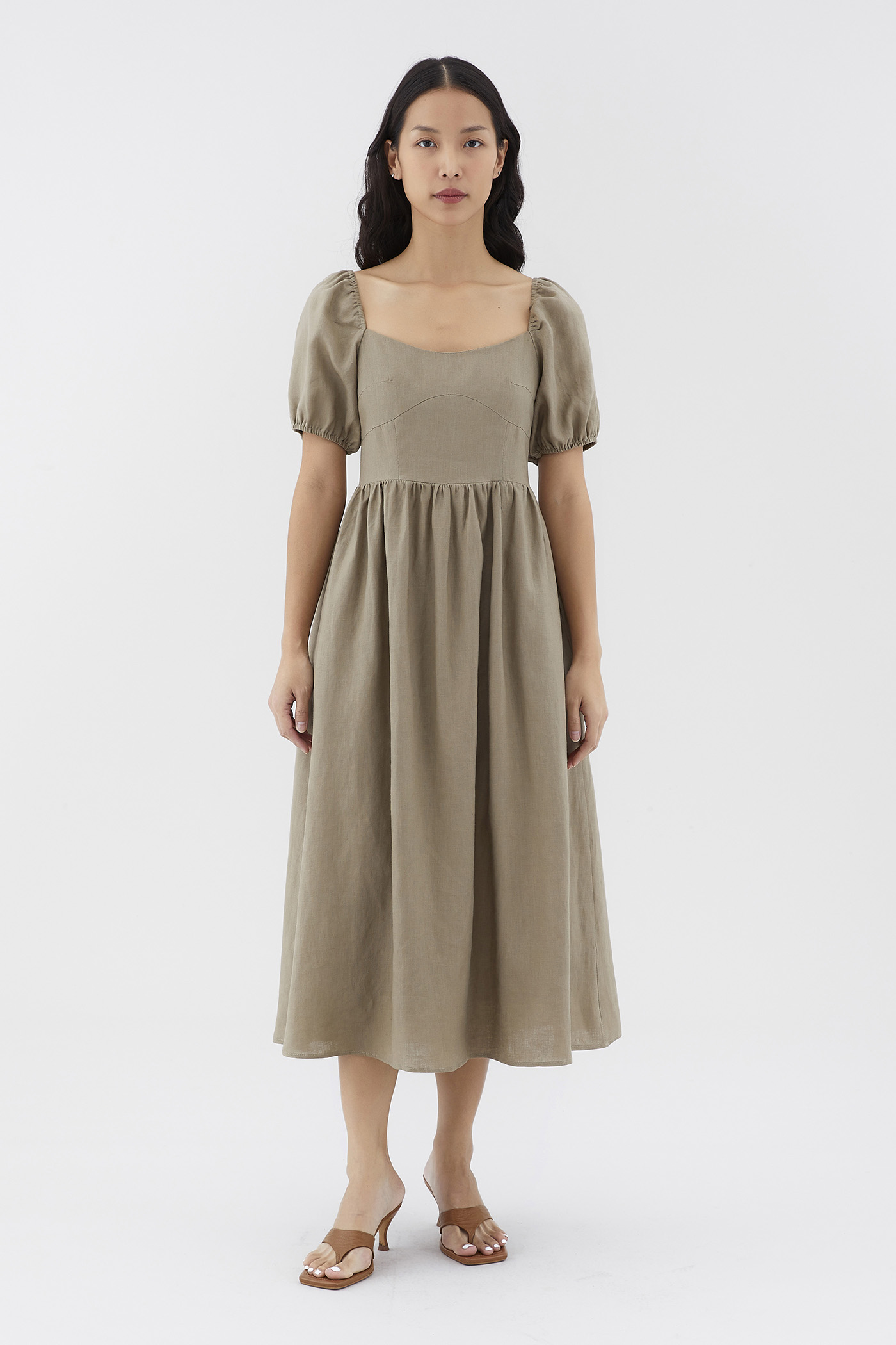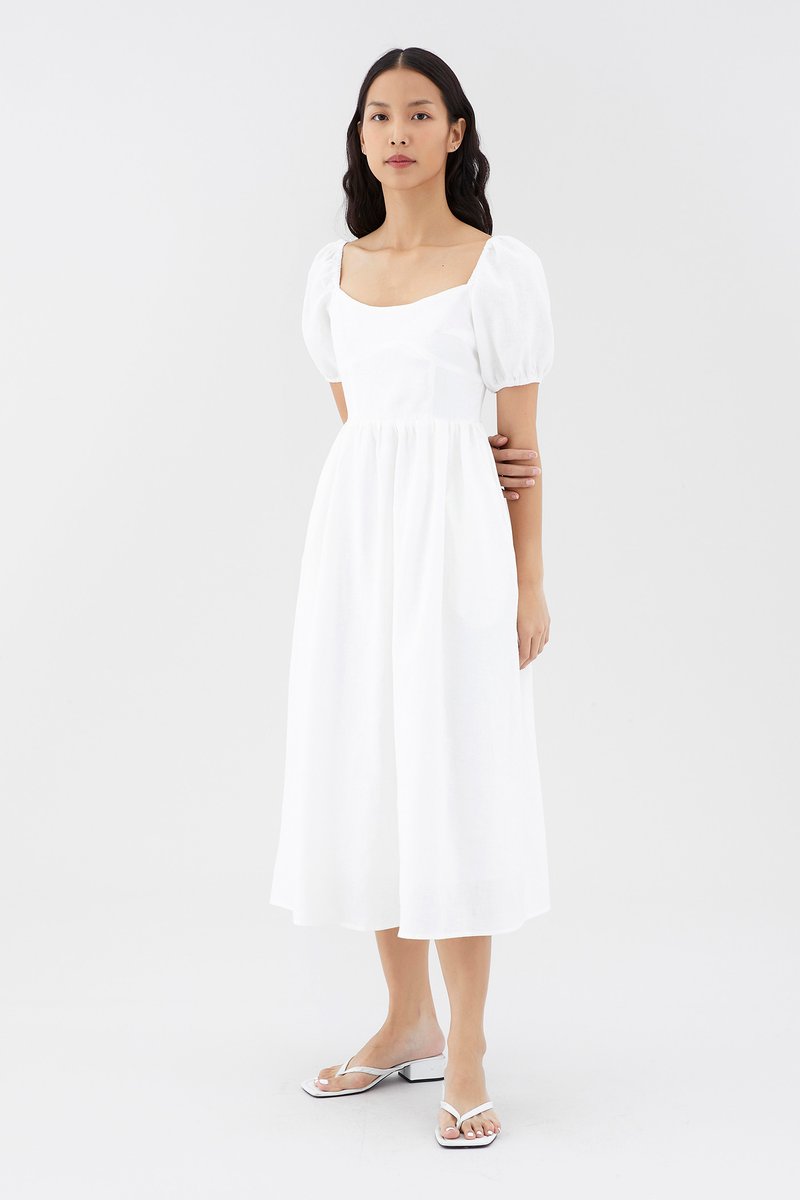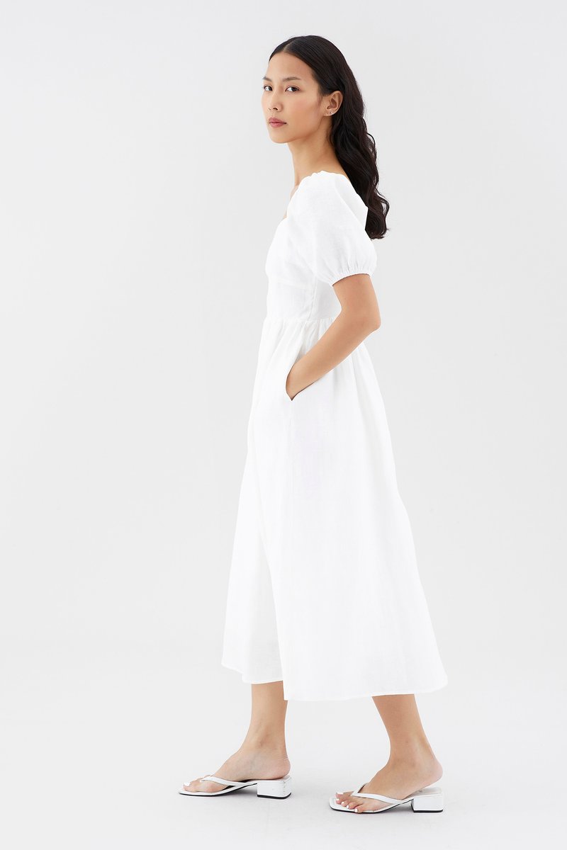 Dress for the sun. Cut from airy and gently tailored 100% linen, this midi dress features a square neckline, short, elasticated puffed sleeves and a back zip closure. Worn in a flattering A-line silhouette that fits slimmer through the bodice before flowing out in a relaxed skirt.