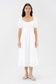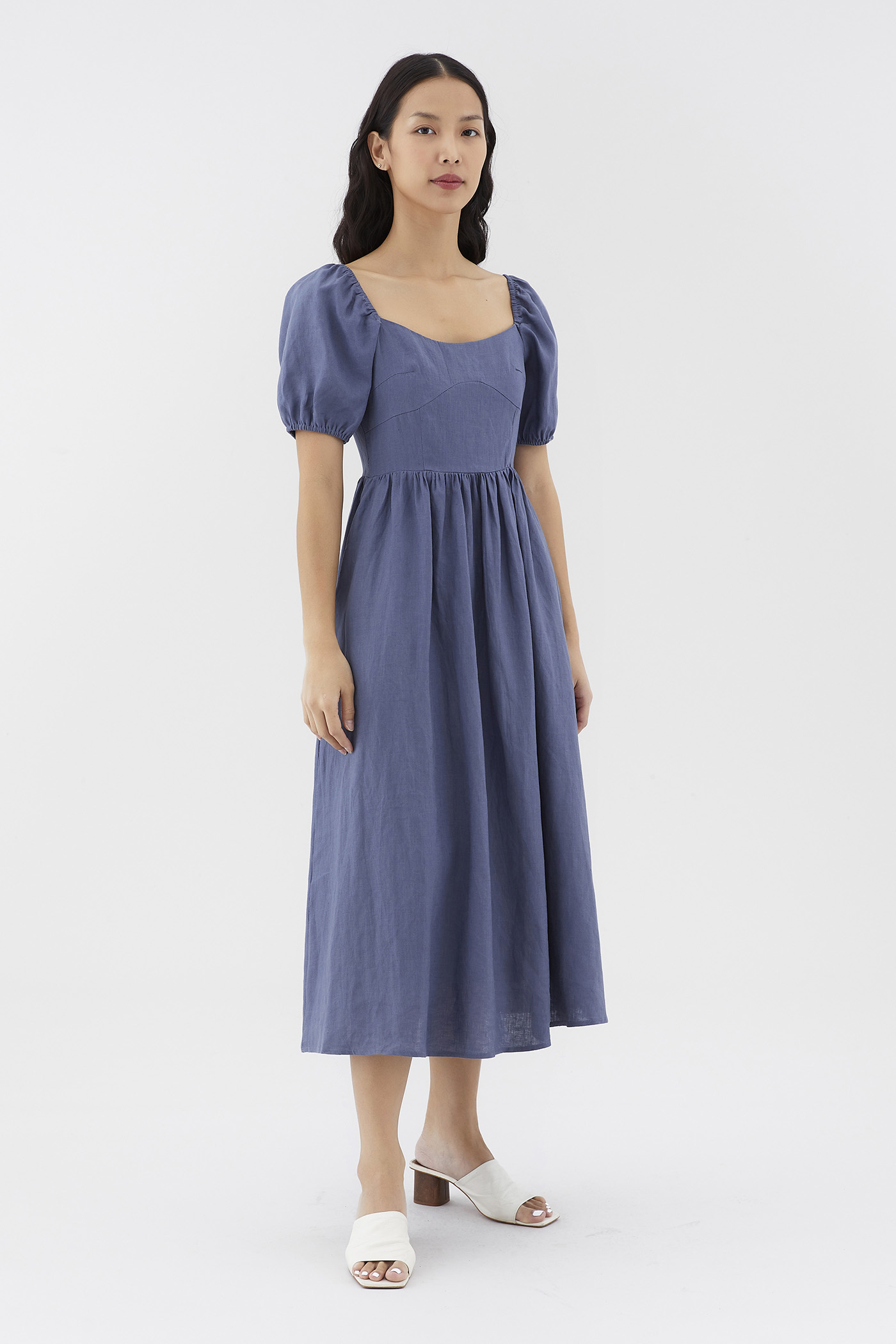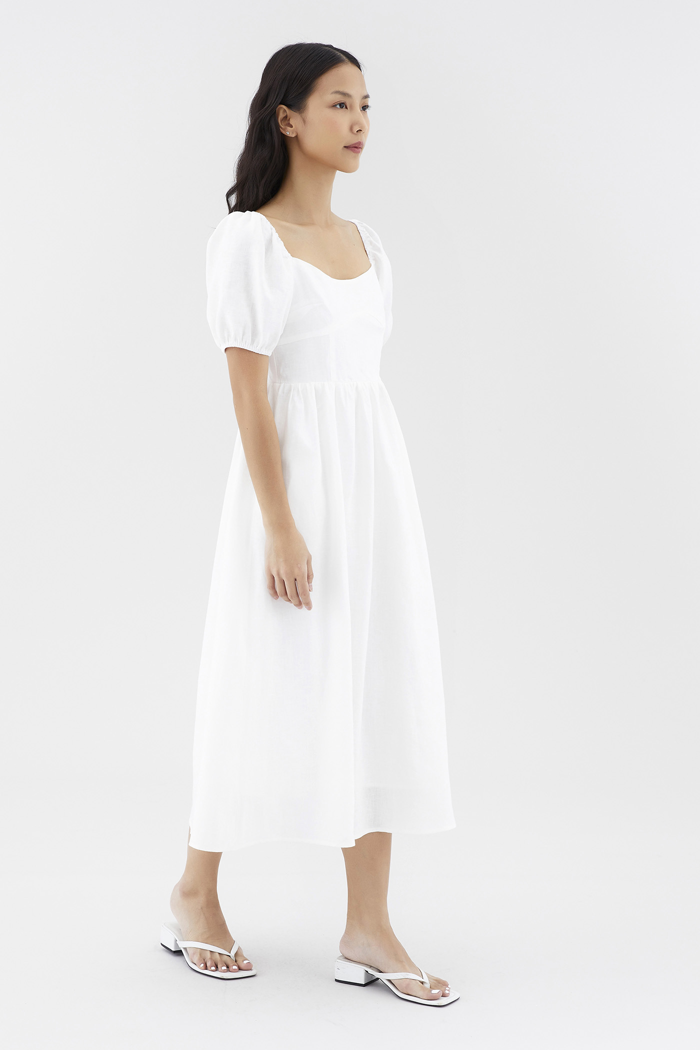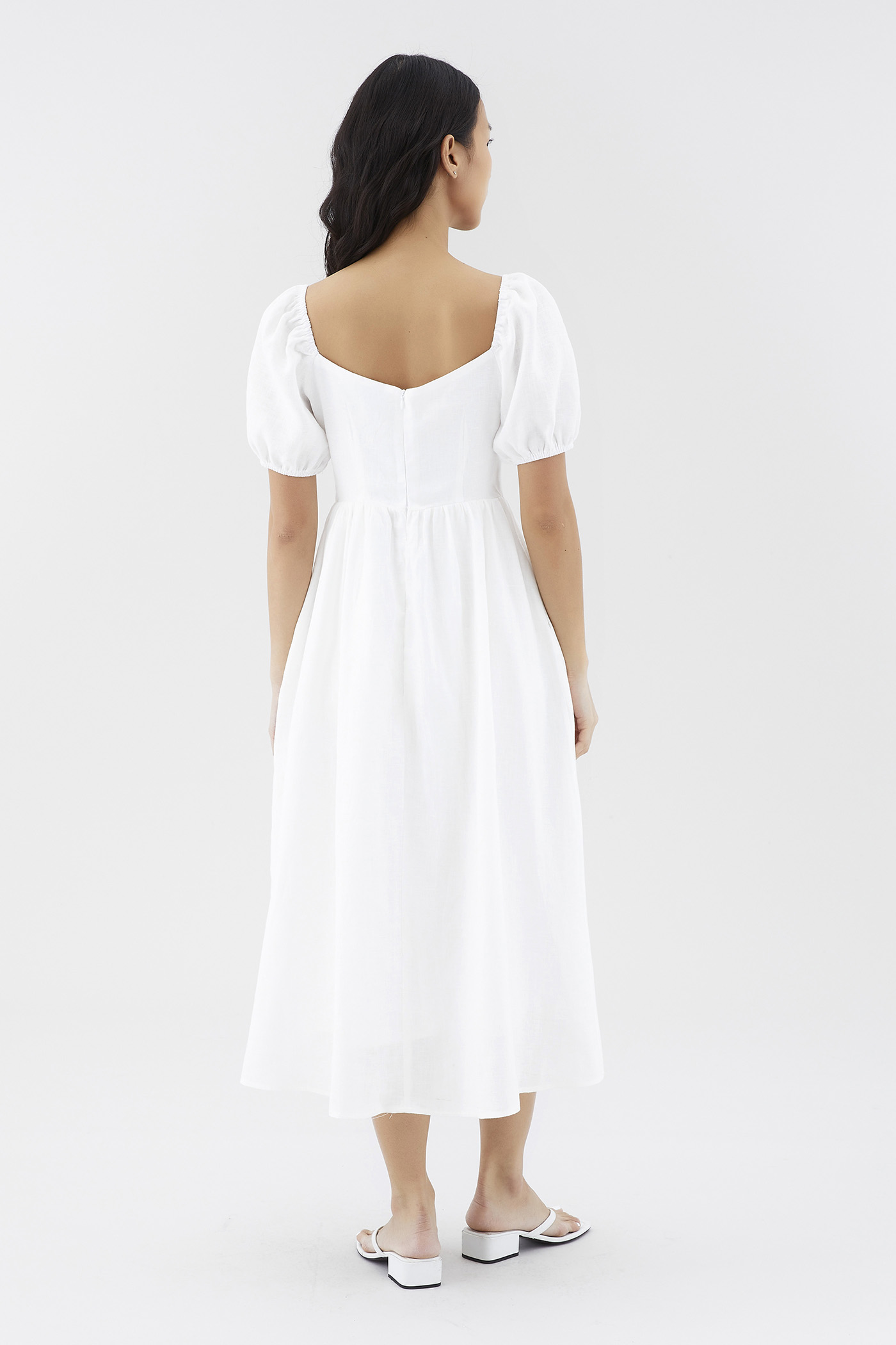 Dress for the sun. Cut from airy and gently tailored 100% linen, this midi dress features a square neckline, short, elasticated puffed sleeves and a back zip closure. Worn in a flattering A-line silhouette that fits slimmer through the bodice before flowing out in a relaxed skirt.