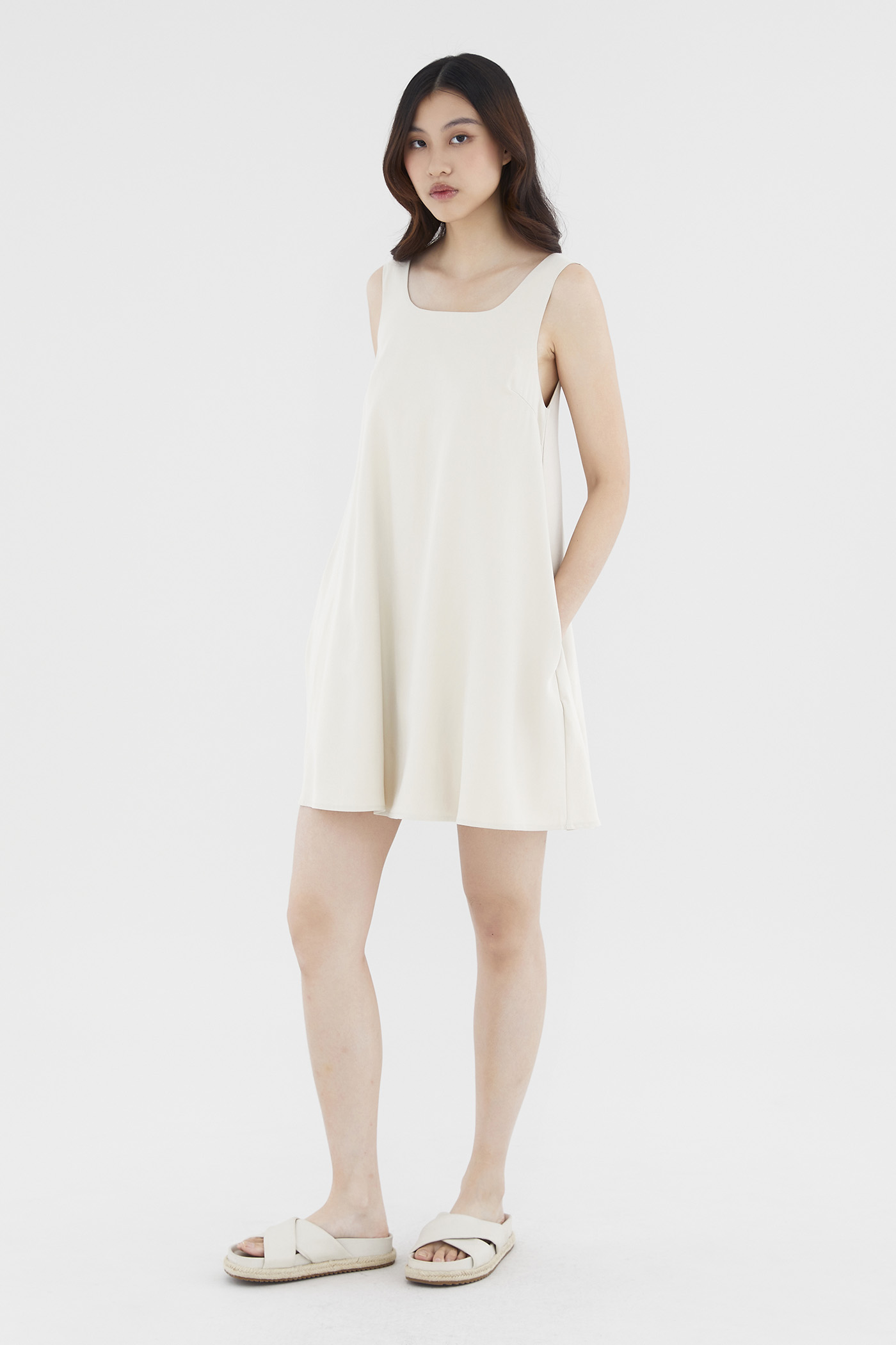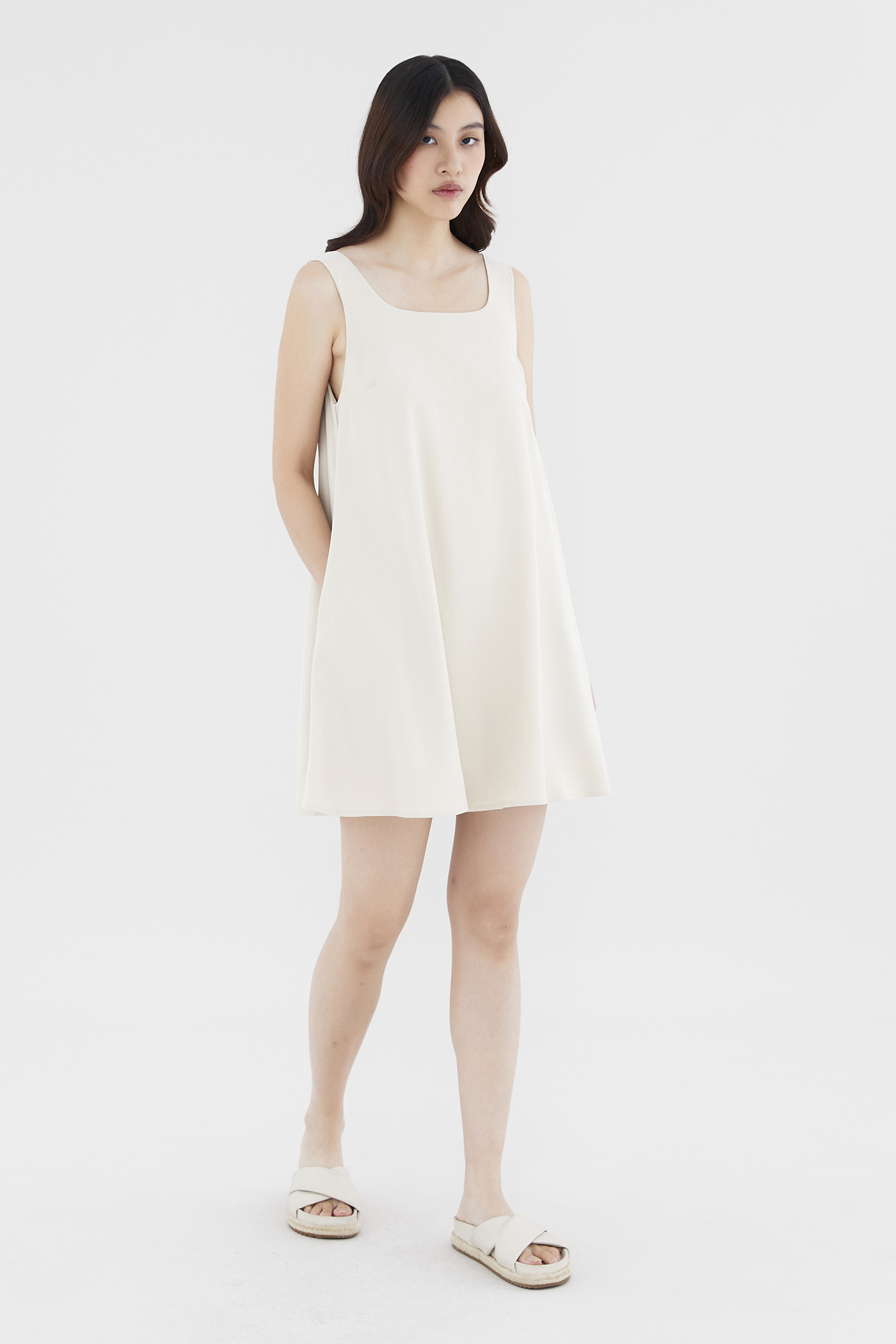 Heatwave approved. Made from soft and smooth fabric, this sleeveless mini dress features a square neckline, wide shoulder straps and a back zip closure. Worn in a relaxed waistless silhouette.