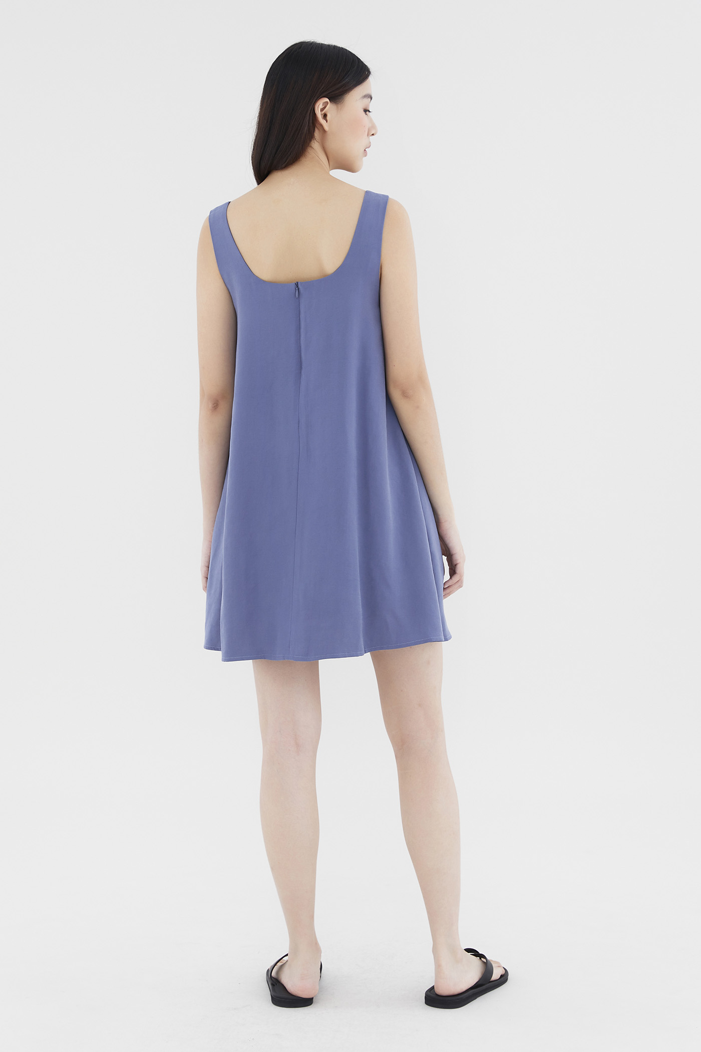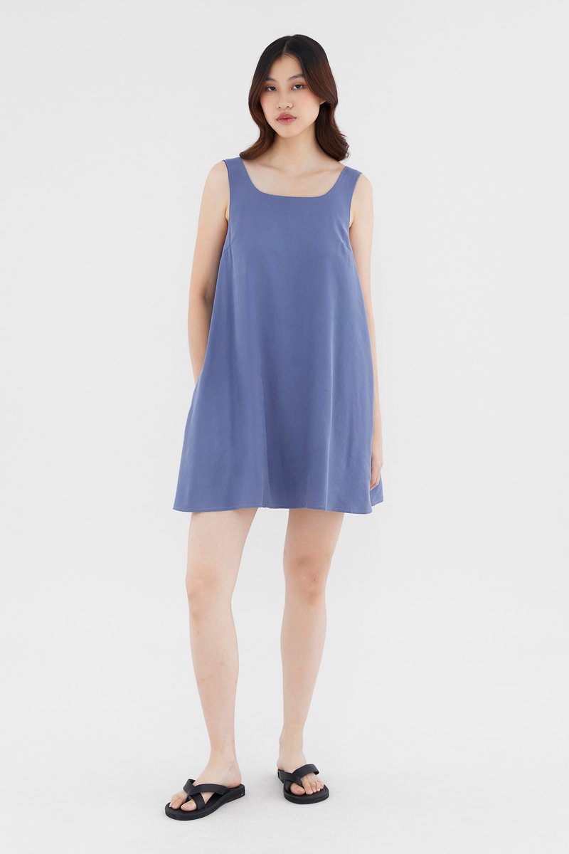 Heatwave approved. Made from soft and smooth fabric, this sleeveless mini dress features a square neckline, wide shoulder straps and a back zip closure. Worn in a relaxed waistless silhouette.