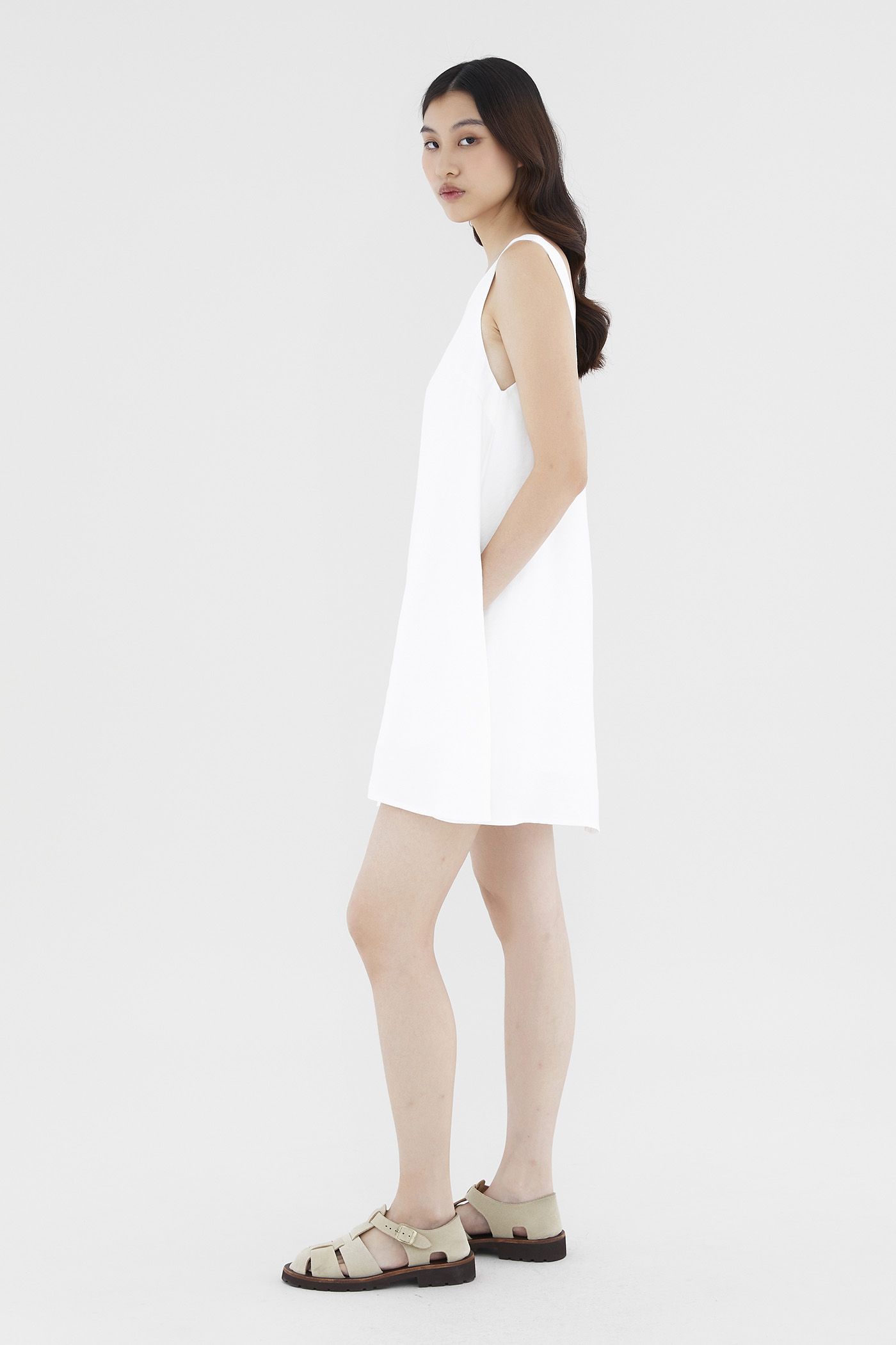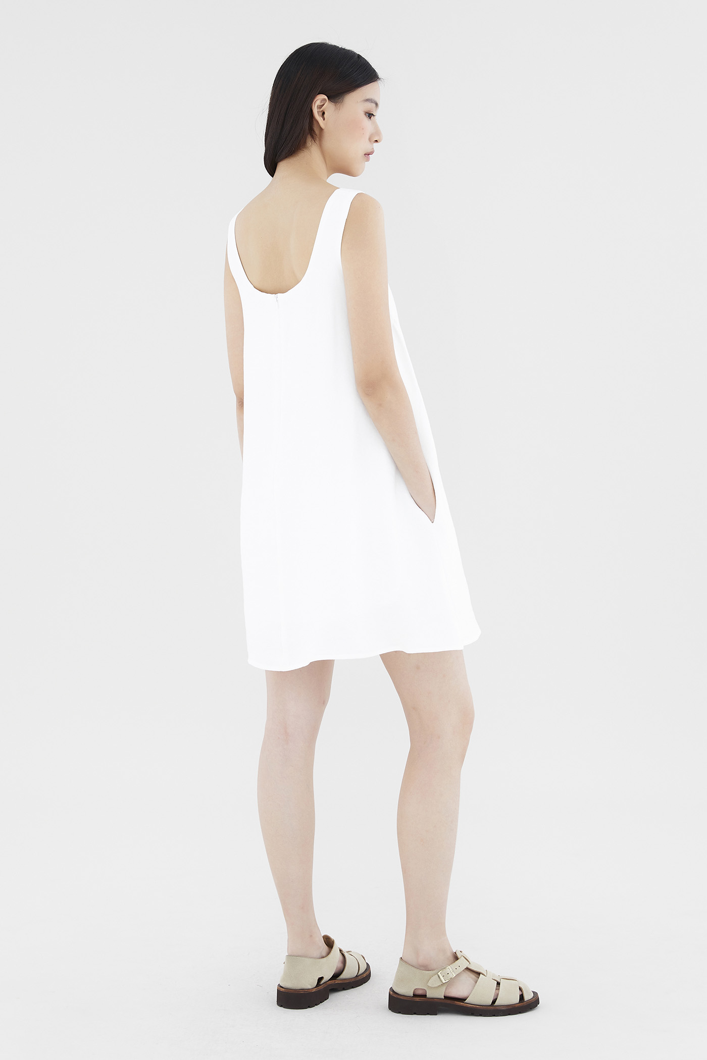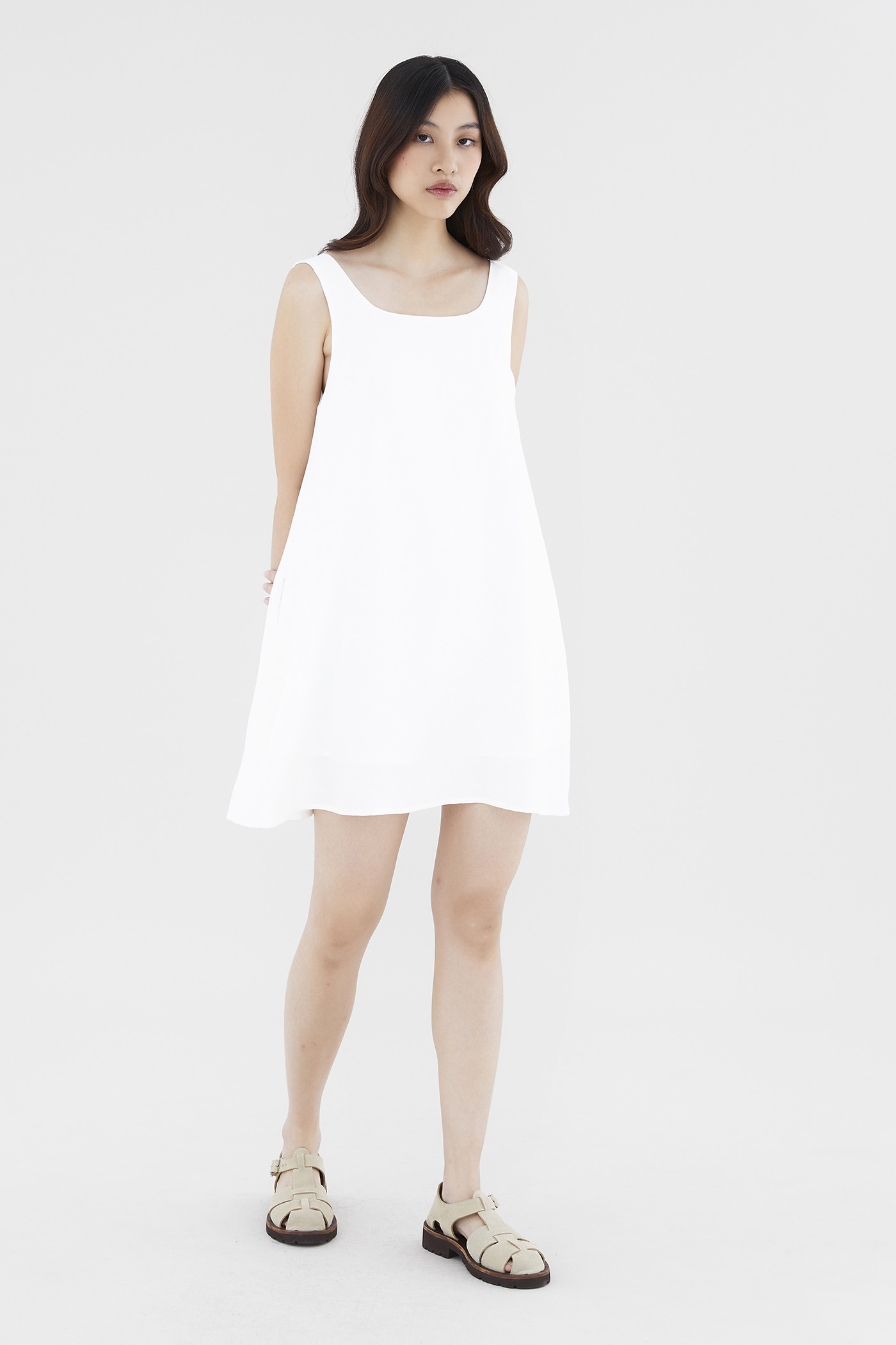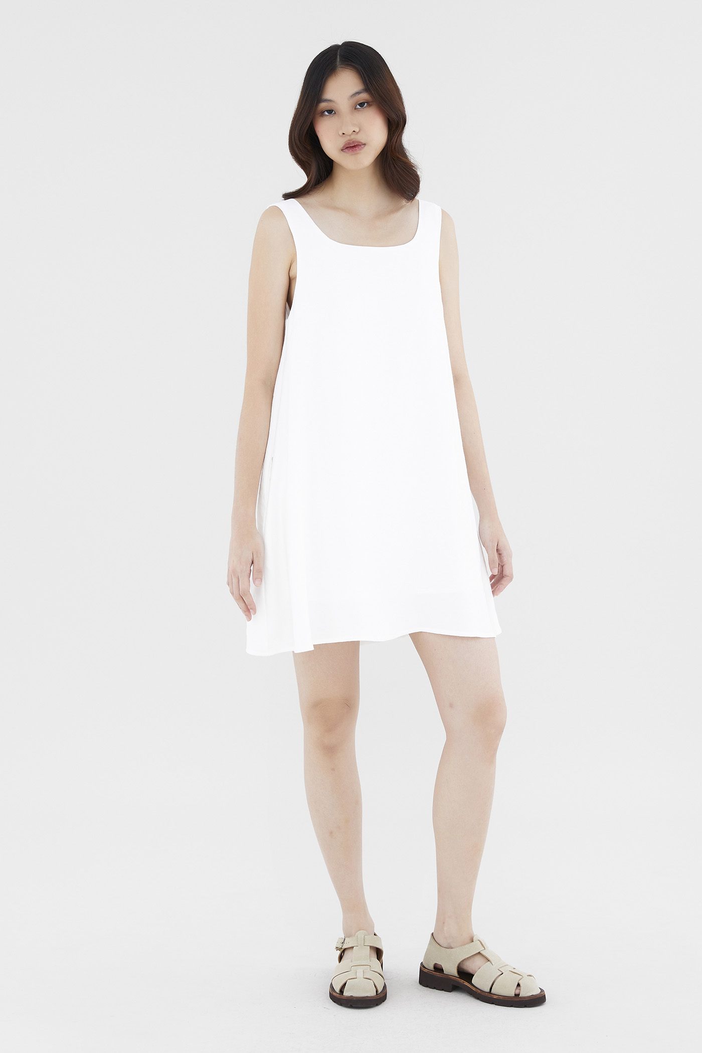 Heatwave approved. Made from soft and smooth fabric, this sleeveless mini dress features a square neckline, wide shoulder straps and a back zip closure. Worn in a relaxed waistless silhouette.