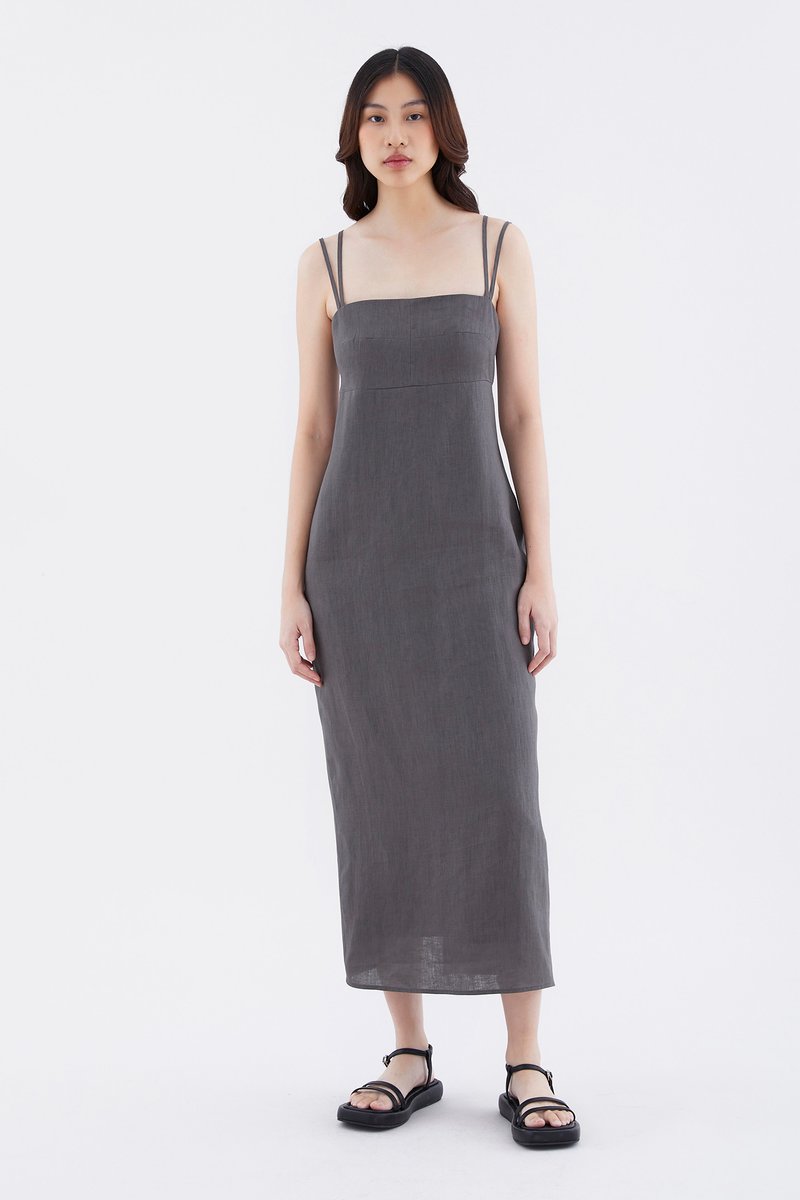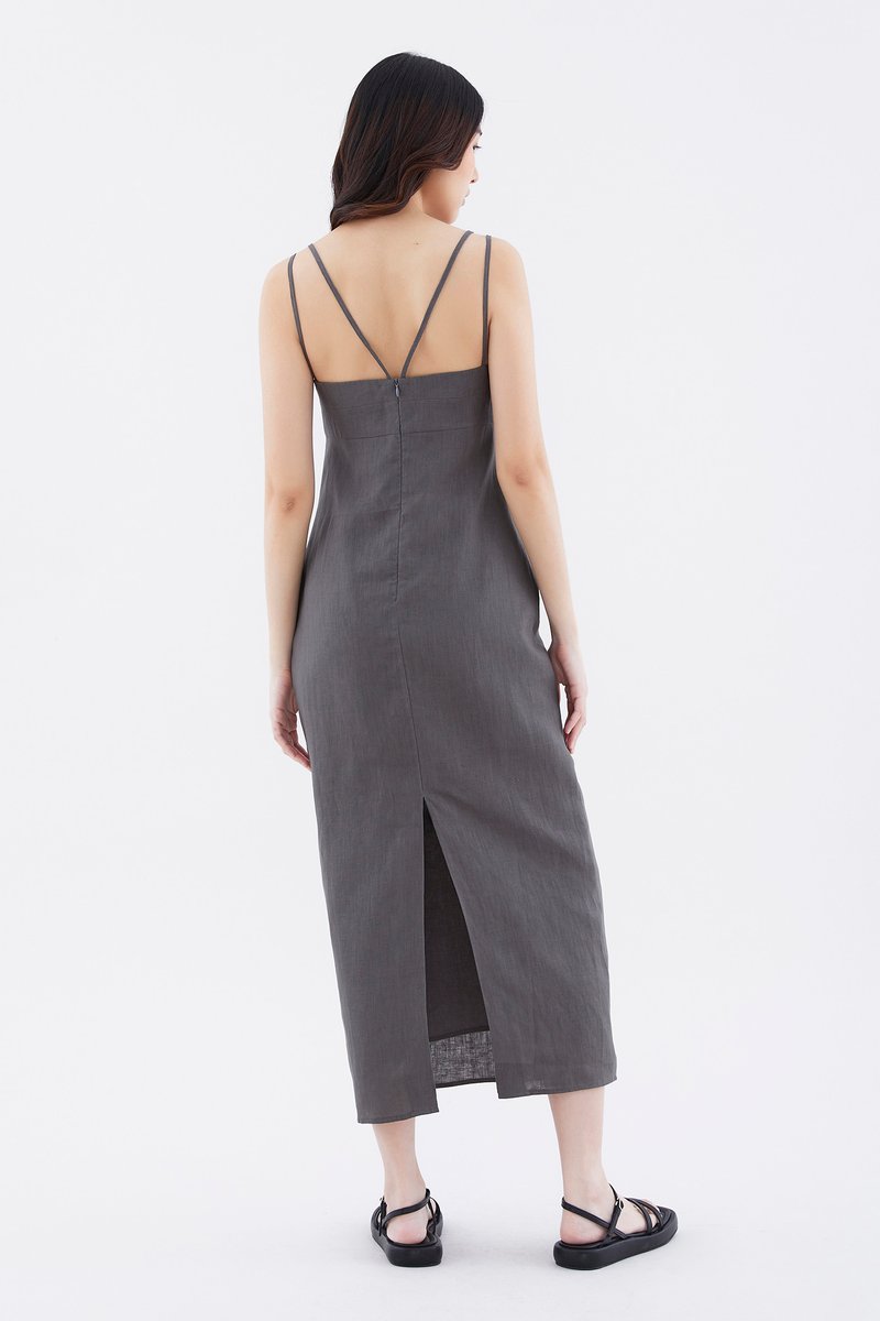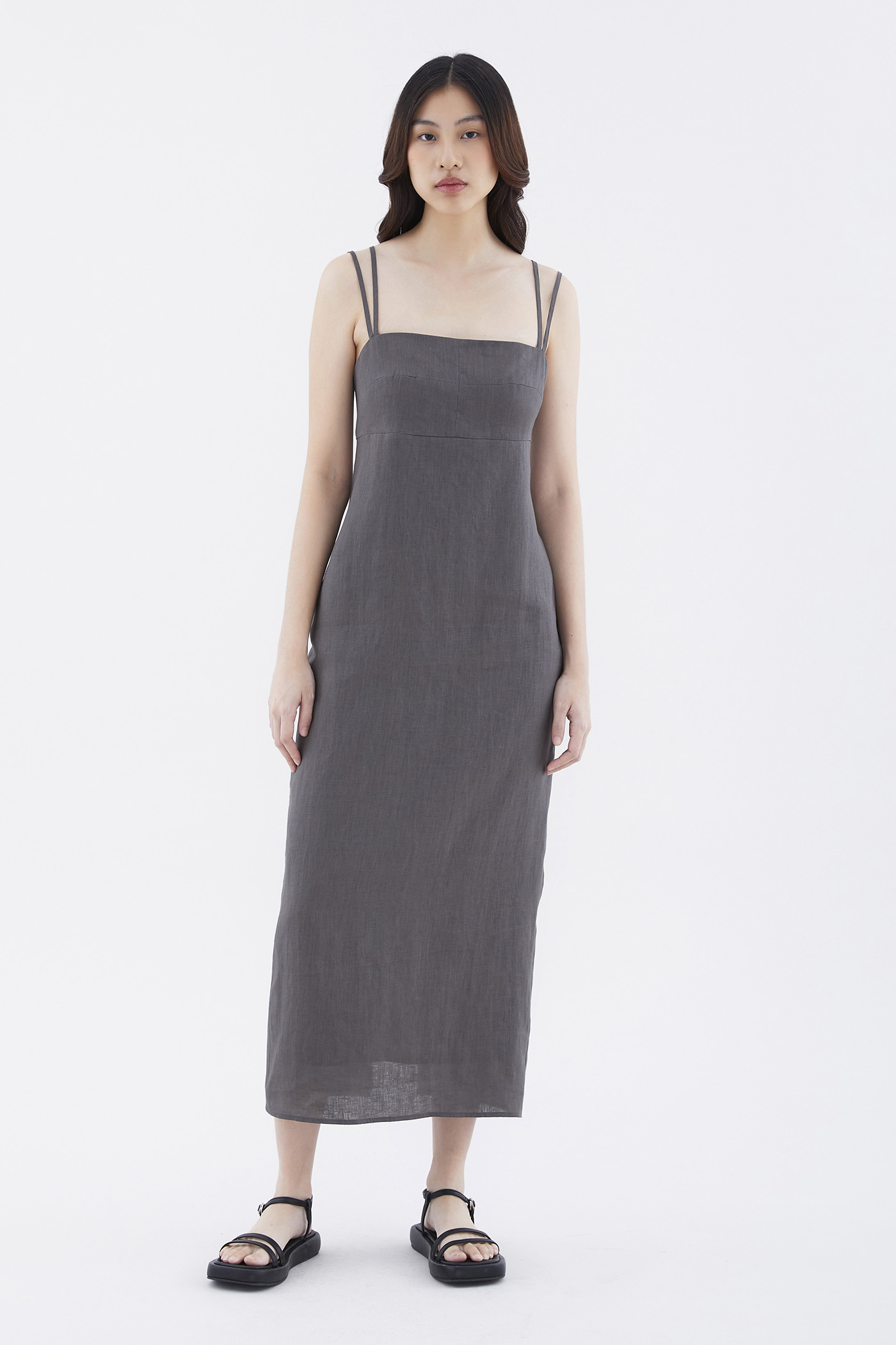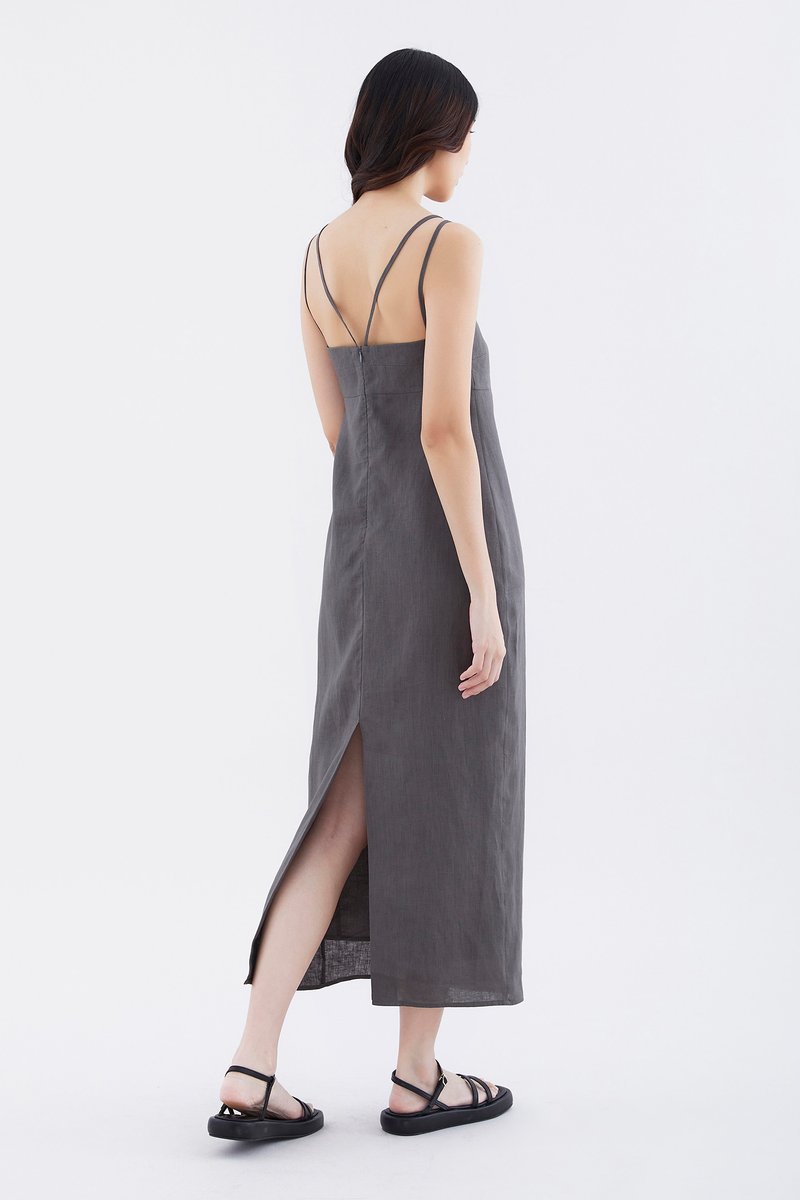 Get strappy. Cut from airy and gently tailored linen, this sleeveless maxi dress features a straight neckline, a panelled bust, a skirt slit and double non-adjustable shoulder straps that connect in a V-shape at the back. Fits slim with a back zip closure.