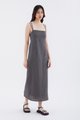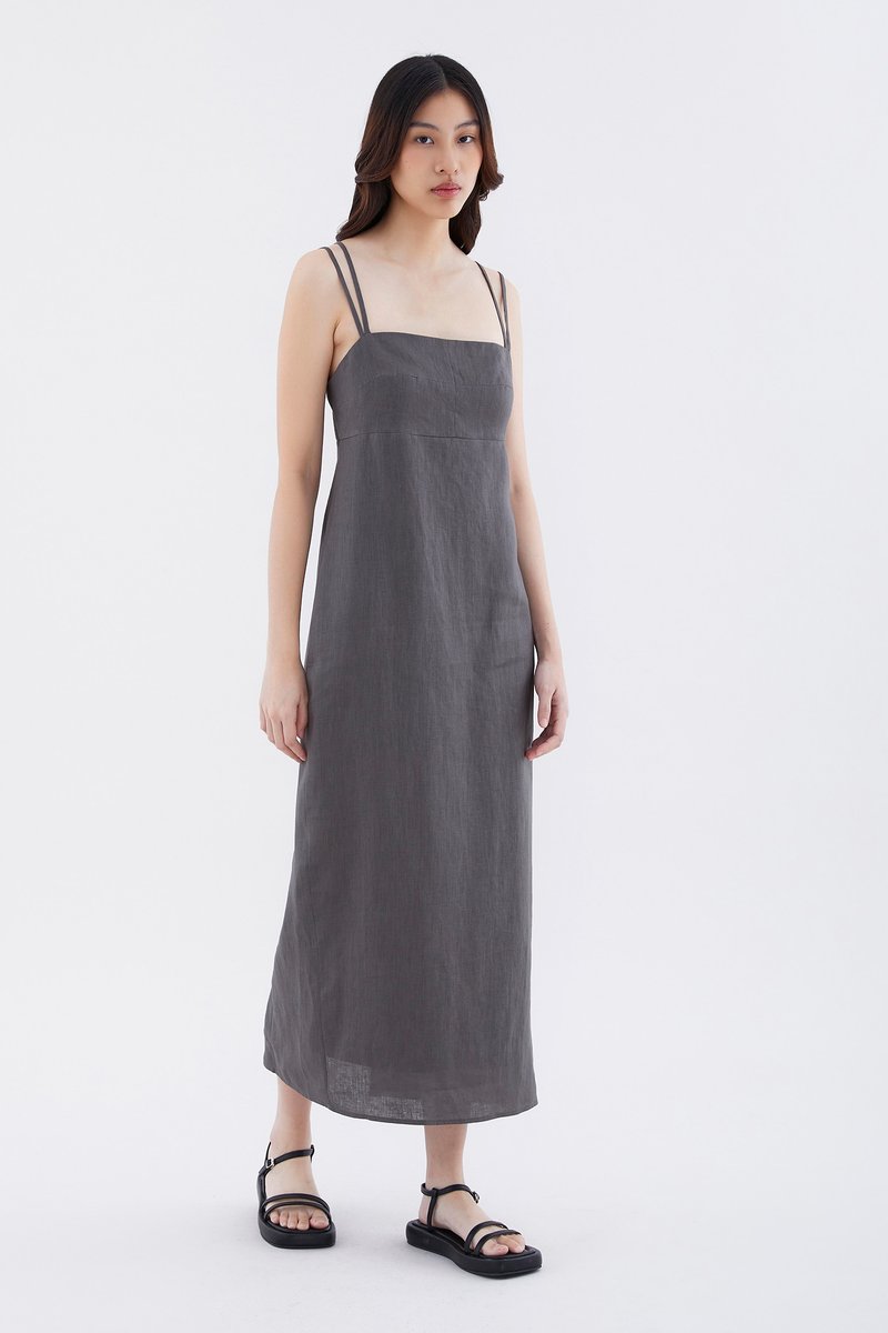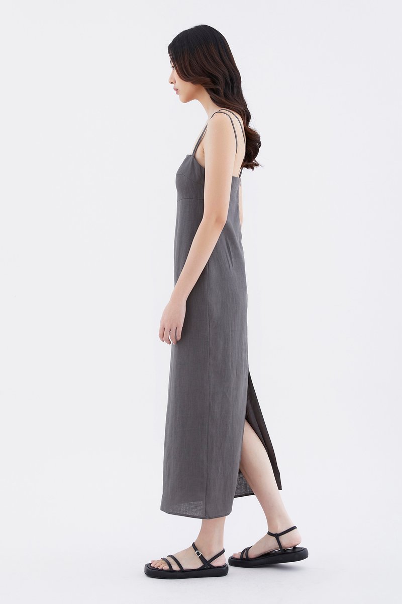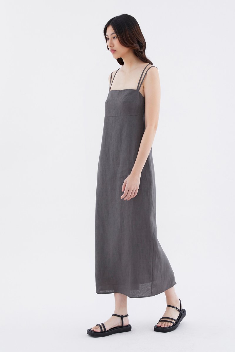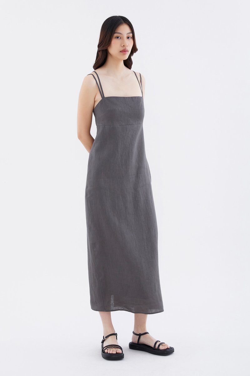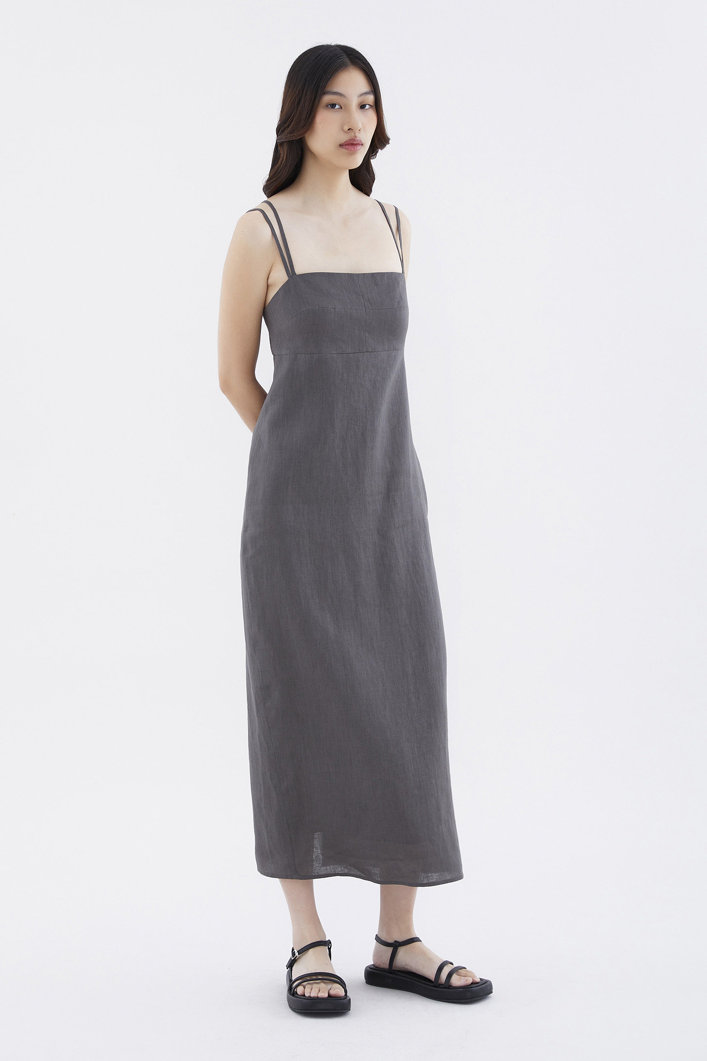 Get strappy. Cut from airy and gently tailored linen, this sleeveless maxi dress features a straight neckline, a panelled bust, a skirt slit and double non-adjustable shoulder straps that connect in a V-shape at the back. Fits slim with a back zip closure.