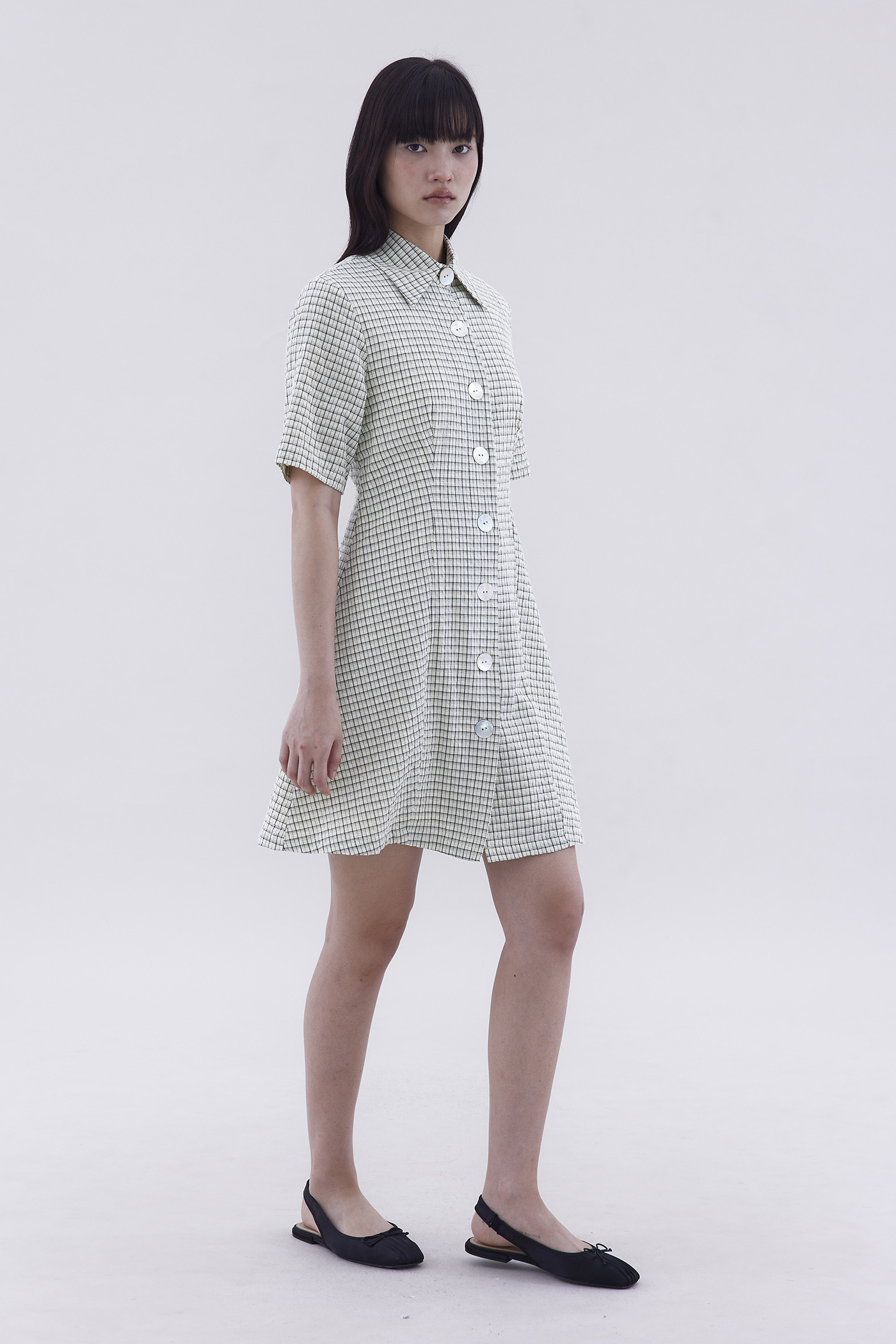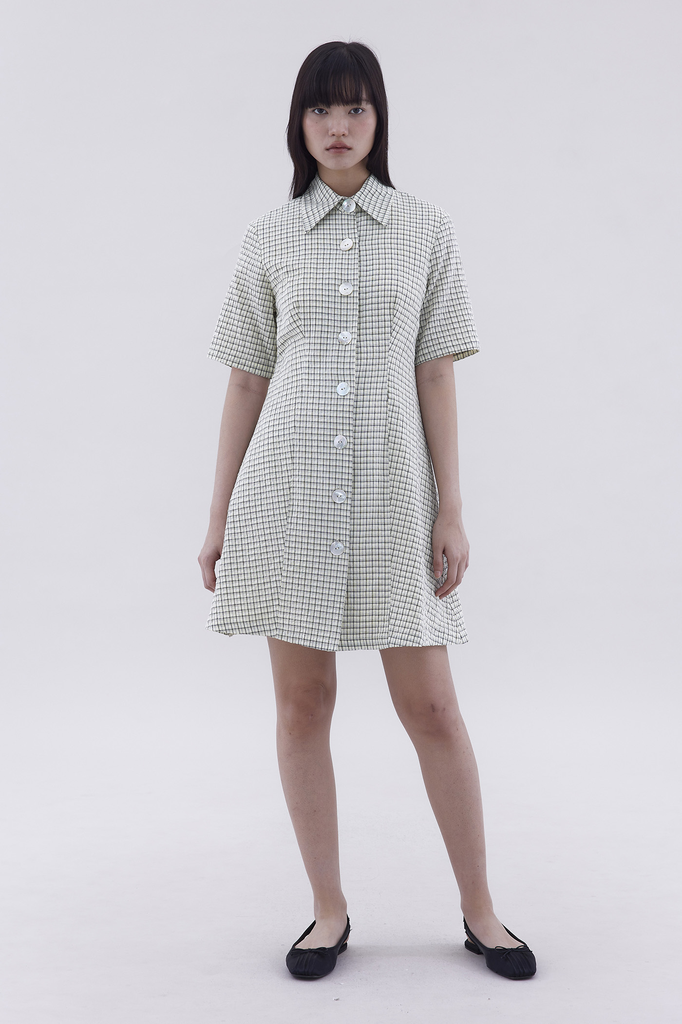 Preppy. Cut from textured and lightweight fabric, this shirt dress features a collared neckline, short sleeves and a button-down front. Fits slim and above the knee.