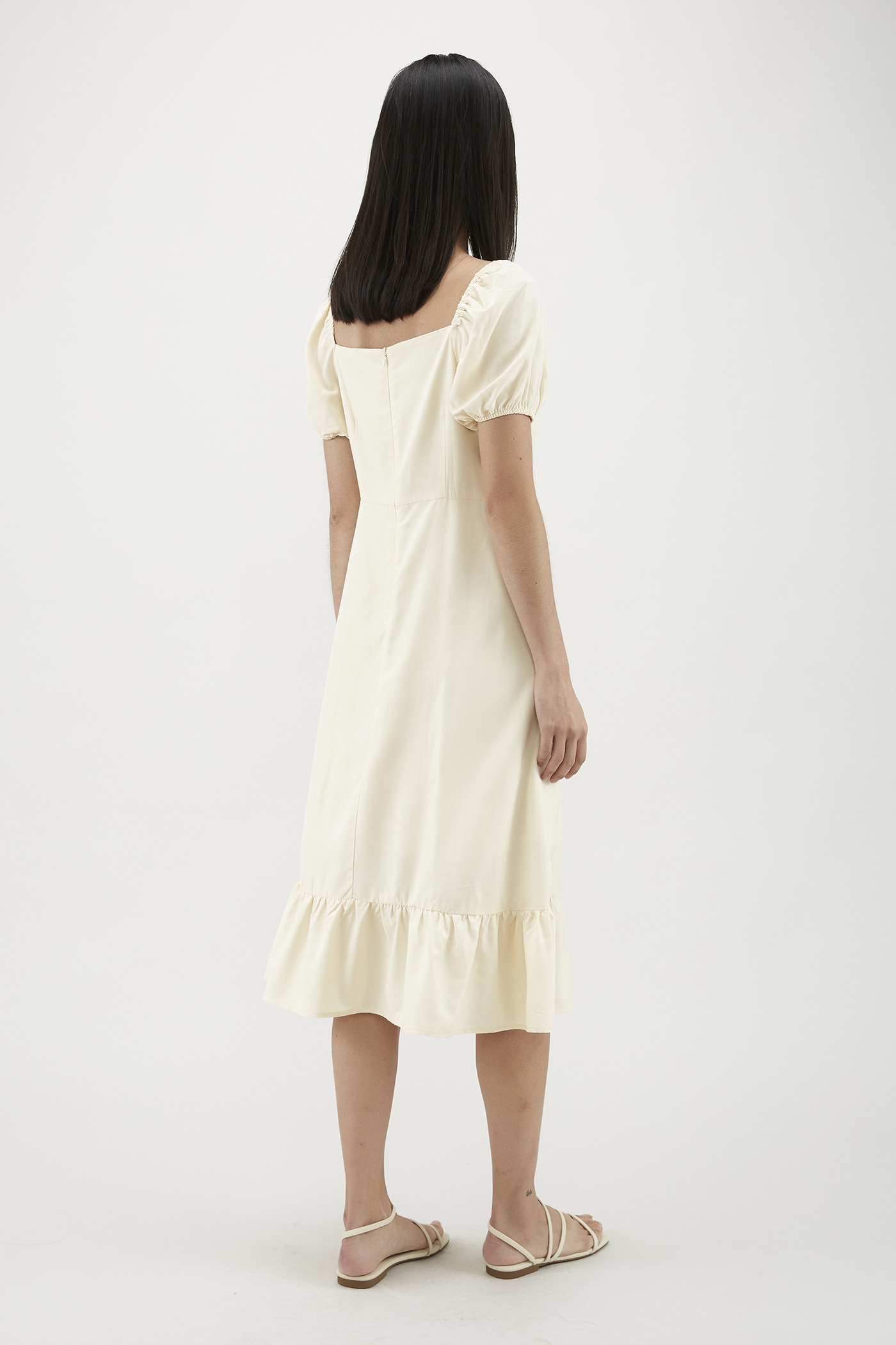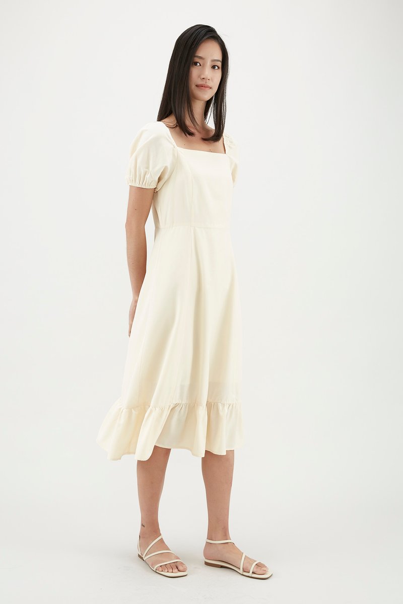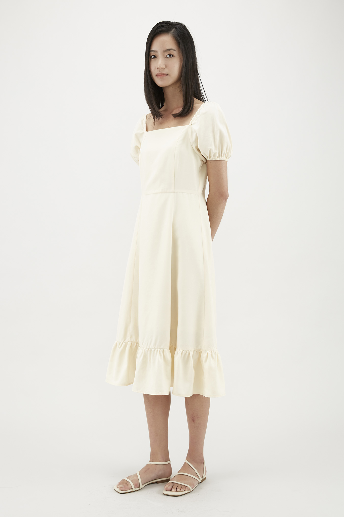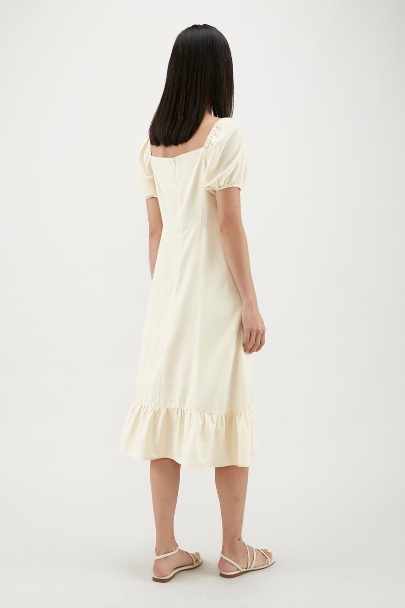 A touch of volume. Cut from non-stretch and fully lined fabric, this midi dress flaunts short puffed sleeves, a square neckline, elasticated shoulders and a ruffled hem. Fits slim in a midi length, with a zip closure on the back.
