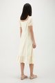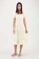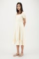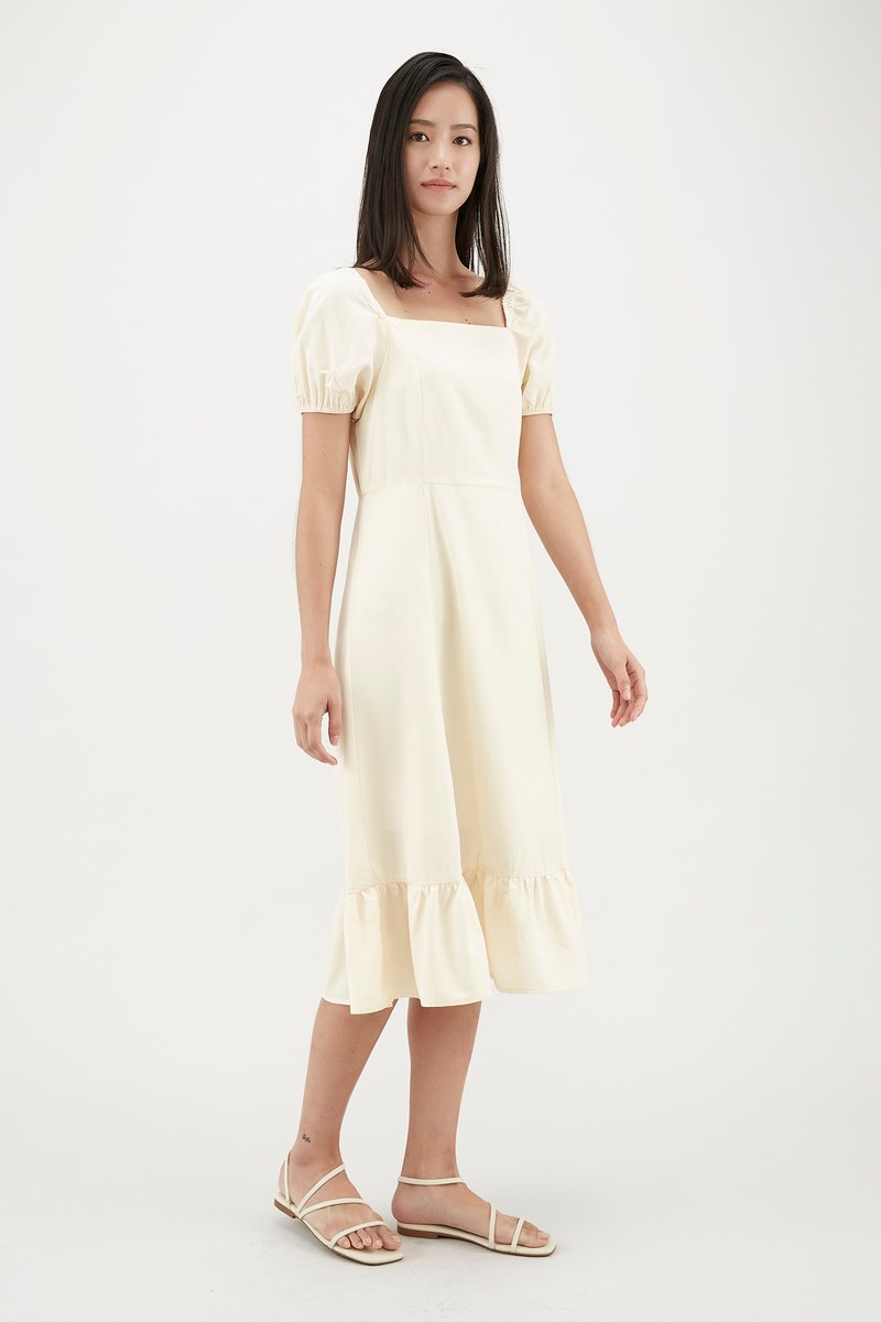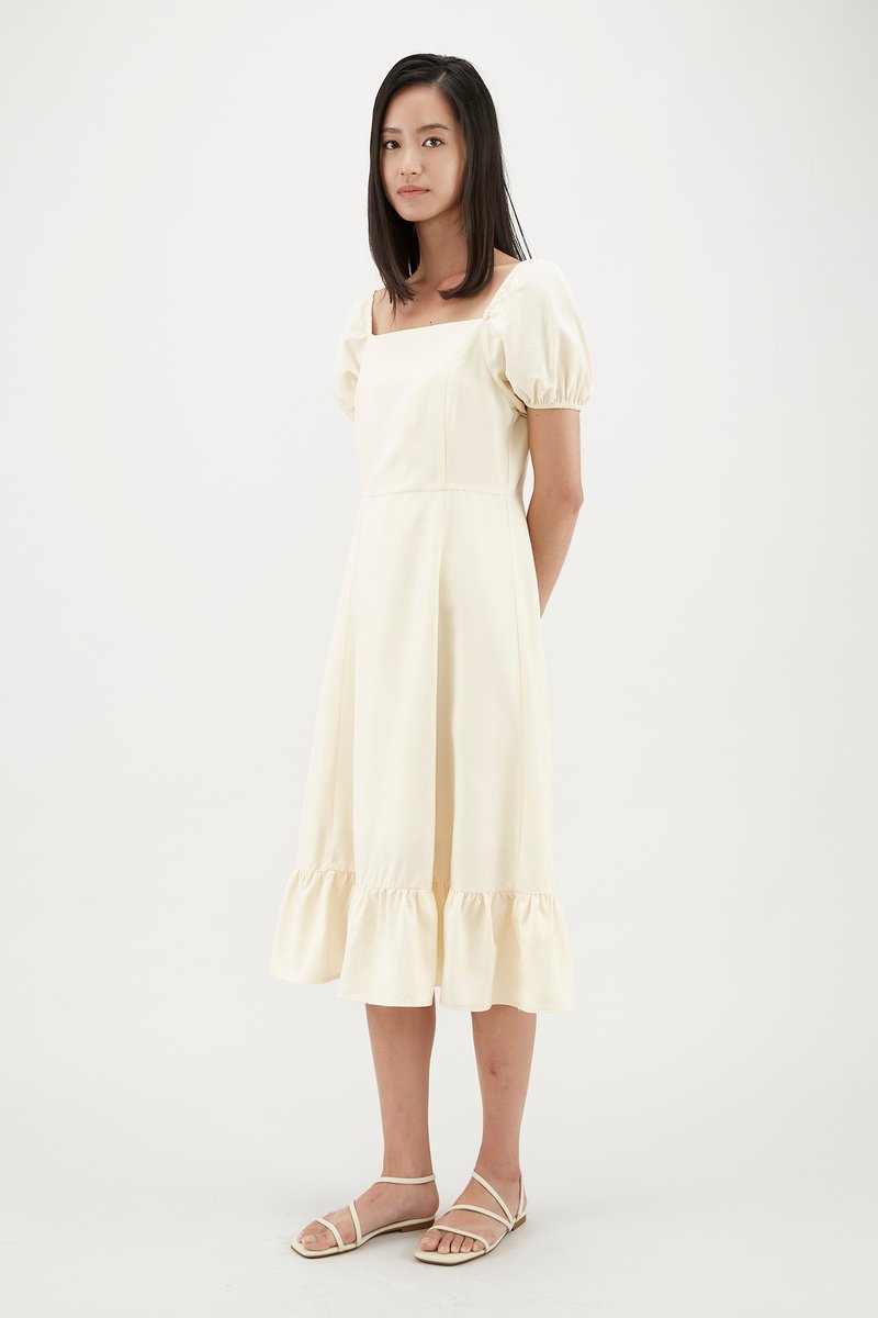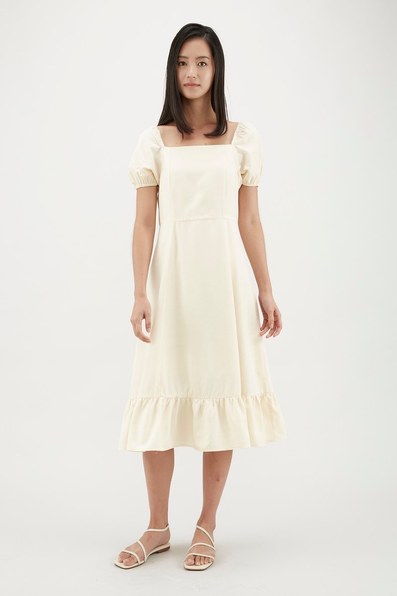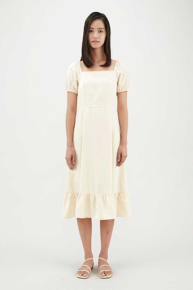 A touch of volume. Cut from non-stretch and fully lined fabric, this midi dress flaunts short puffed sleeves, a square neckline, elasticated shoulders and a ruffled hem. Fits slim in a midi length, with a zip closure on the back.