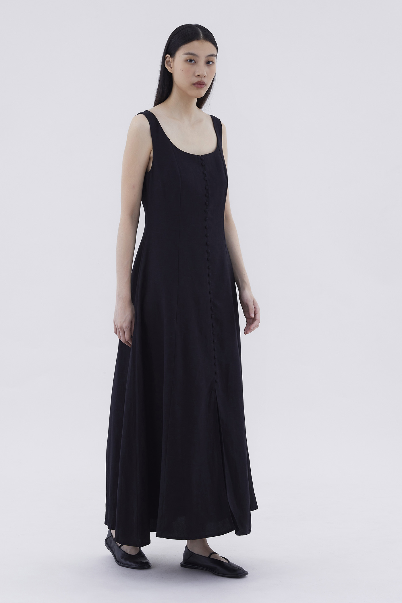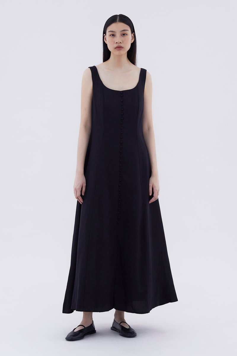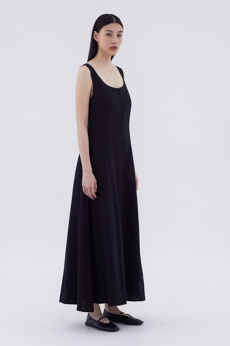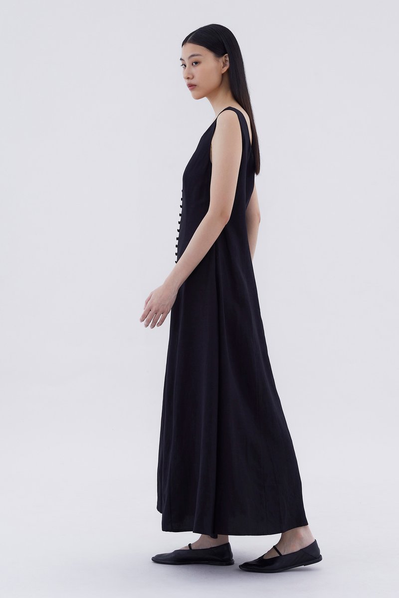 Keep it together. Made from smooth and non-stretch fabric, this sleeveless maxi dress features a wide angular neckline, side zip closure as well as a slit and decorative loop buttons at the front. Fits slimmer through the bodice before flowing out at the waist in a relaxed skirt.