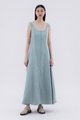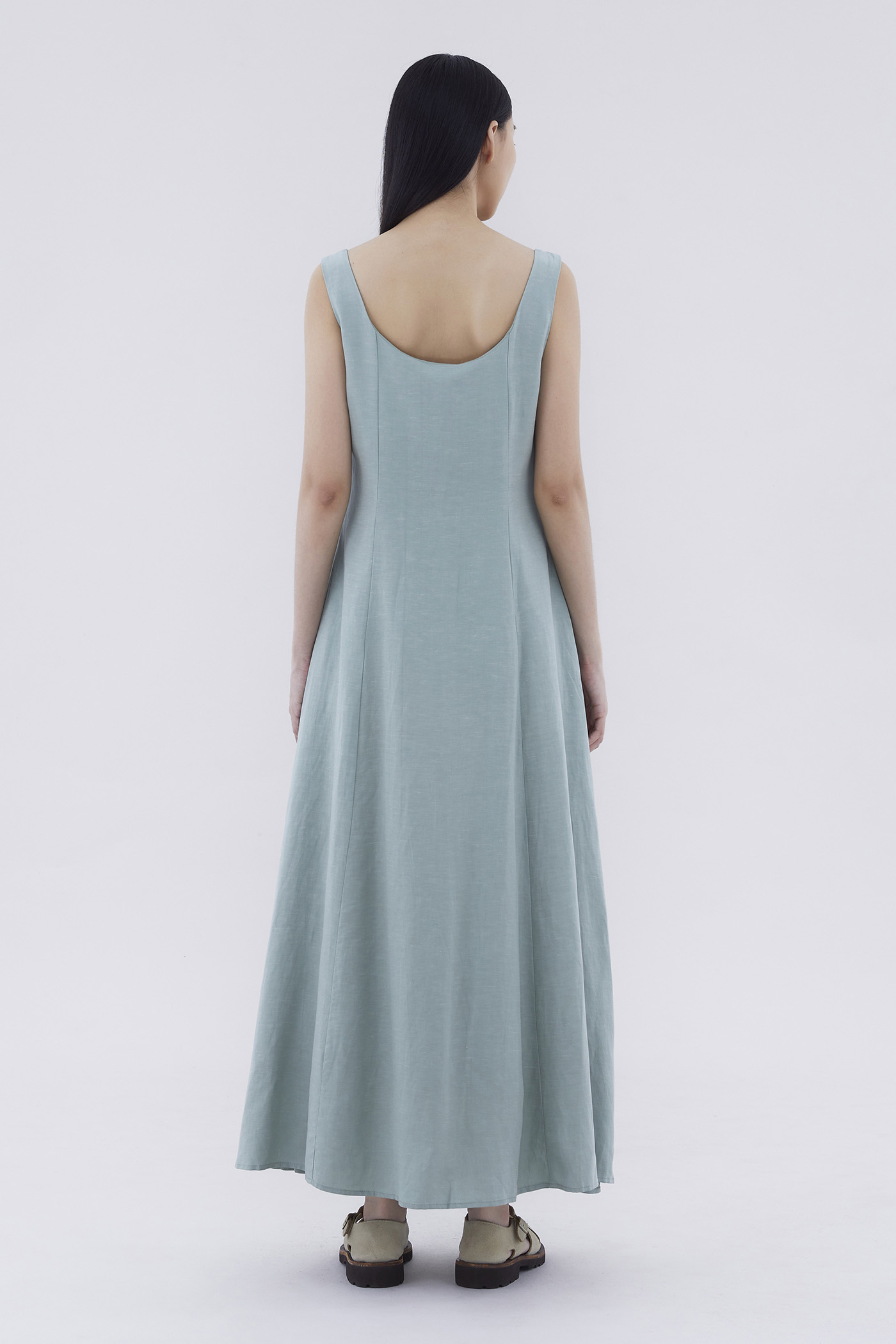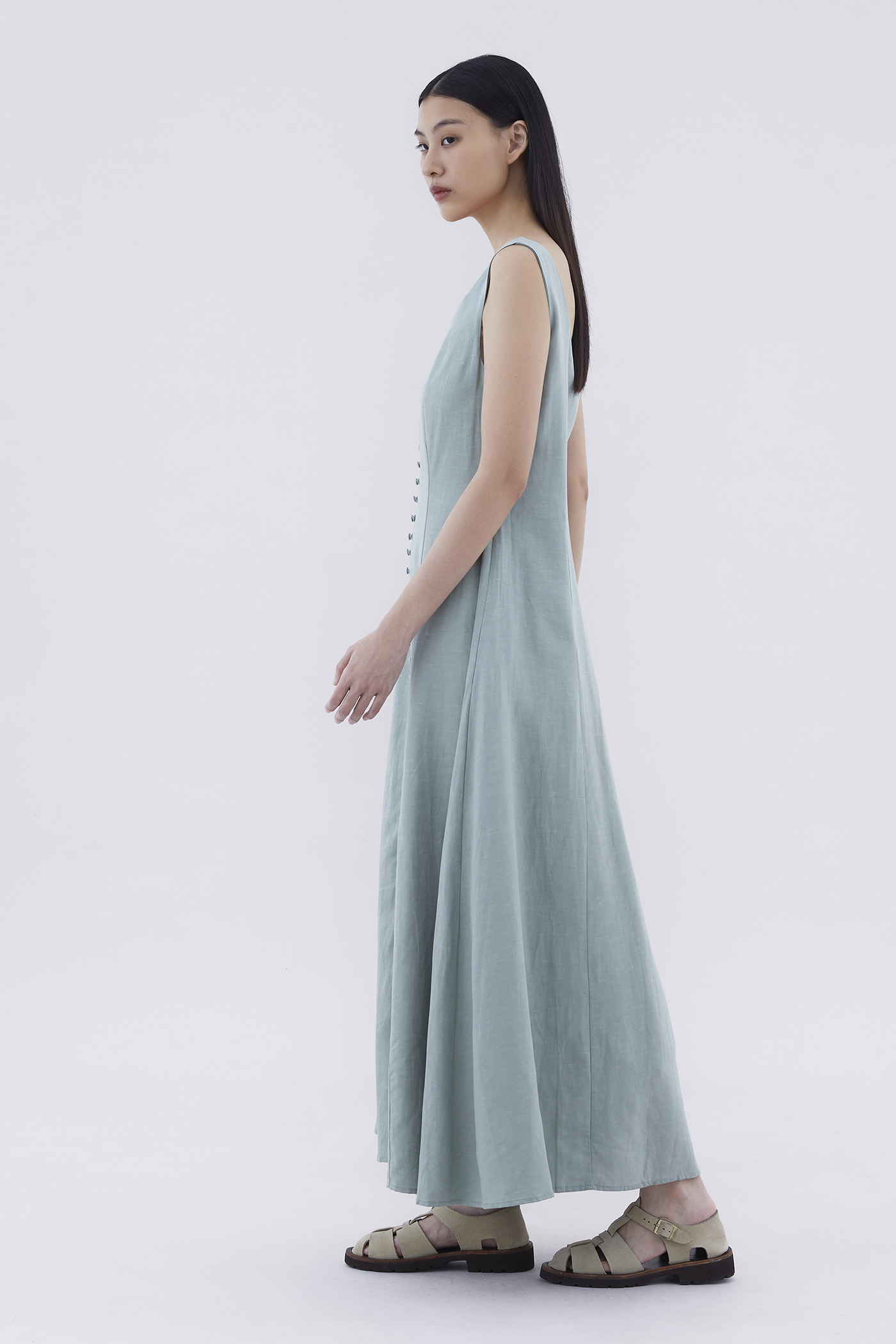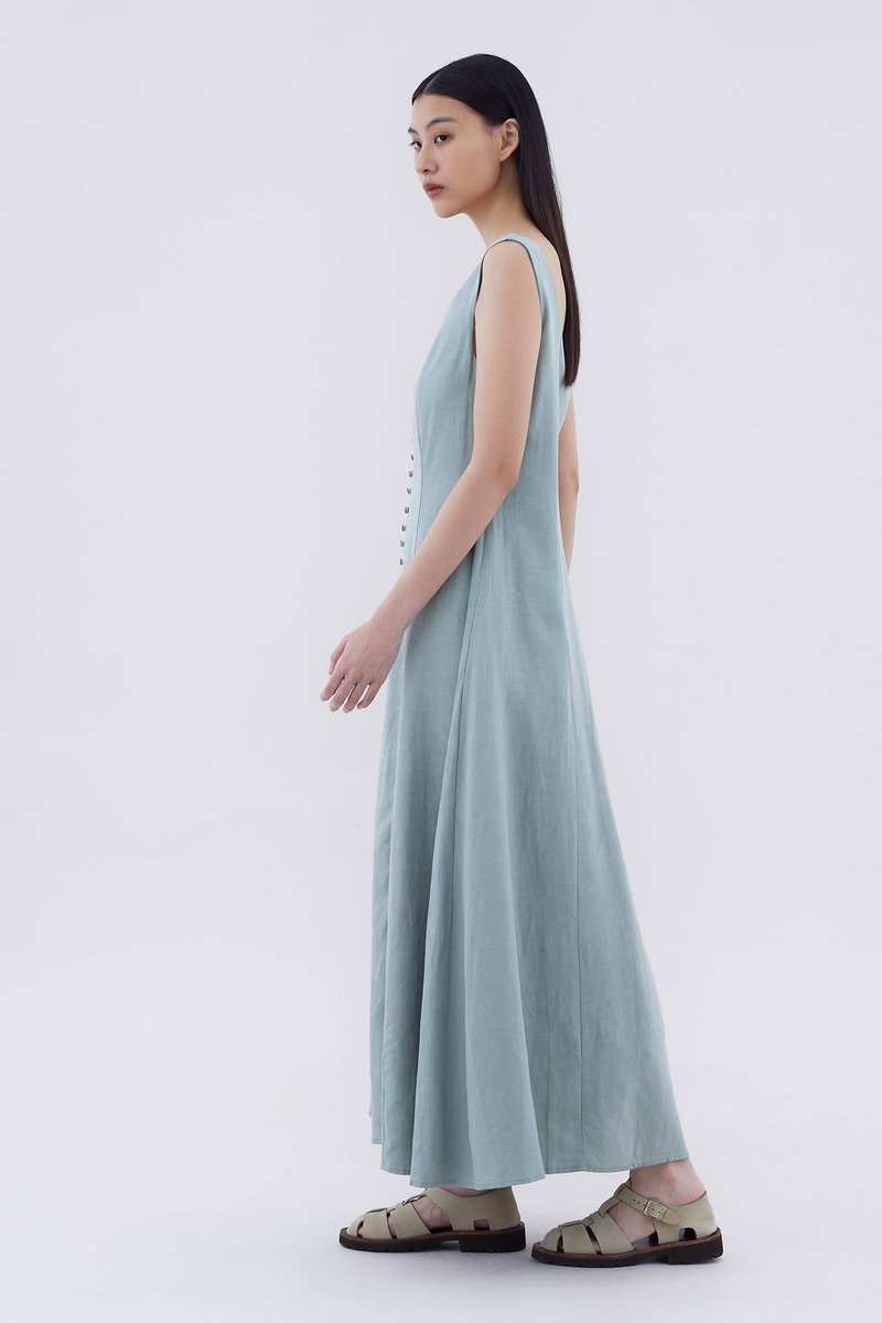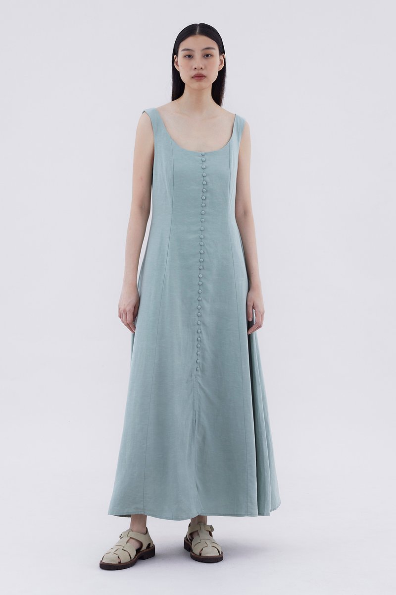Keep it together. Made from smooth and non-stretch fabric, this sleeveless maxi dress features a wide angular neckline, side zip closure as well as a slit and decorative loop buttons at the front. Fits slimmer through the bodice before flowing out at the waist in a relaxed skirt.