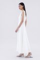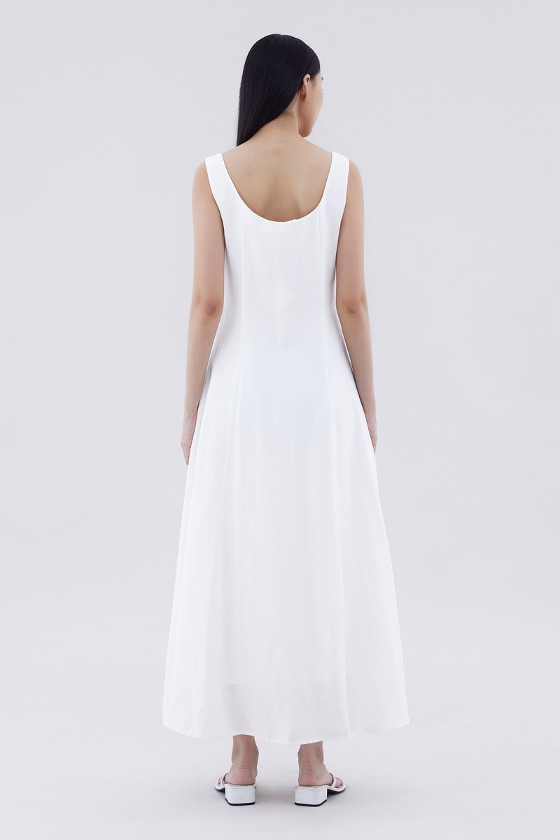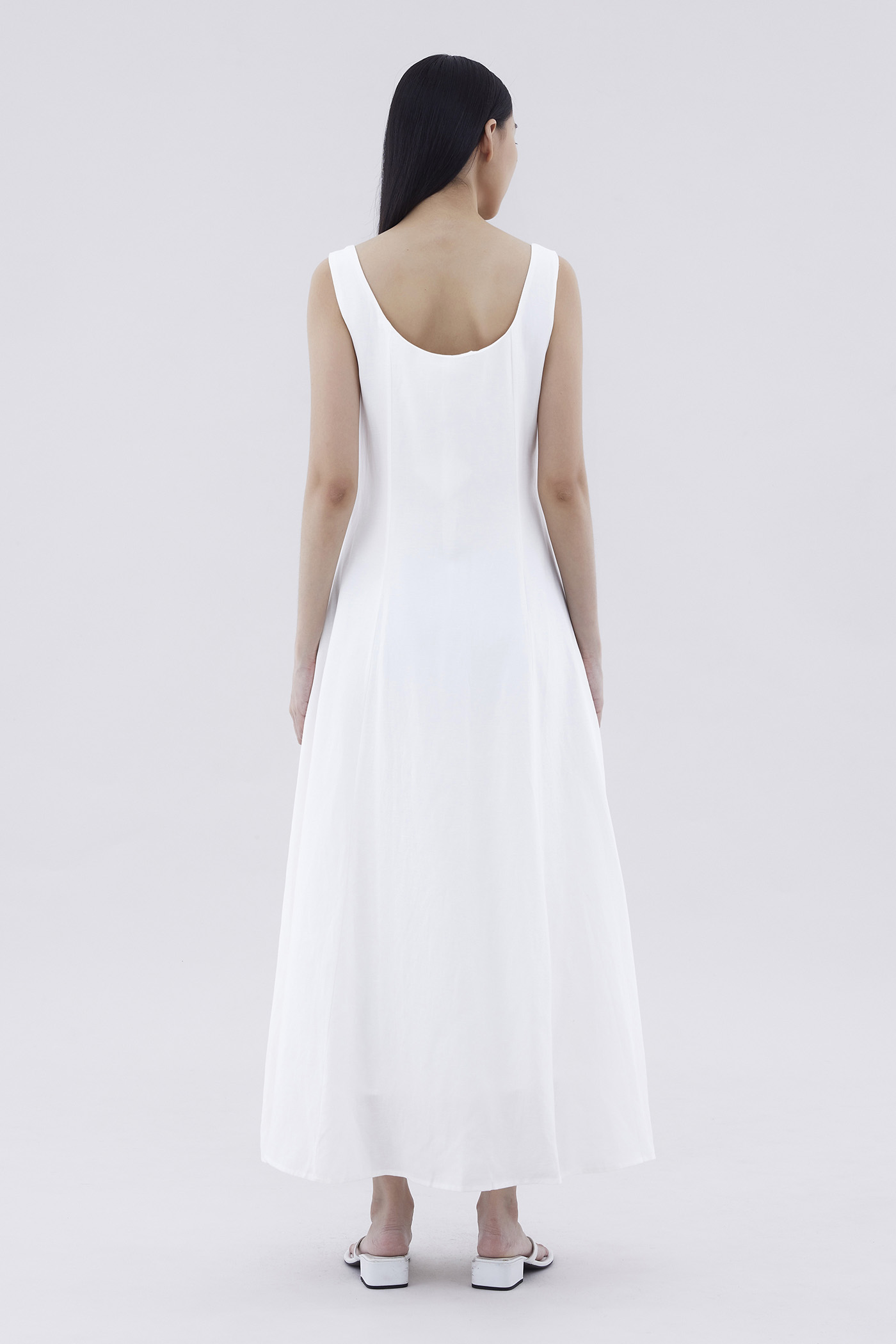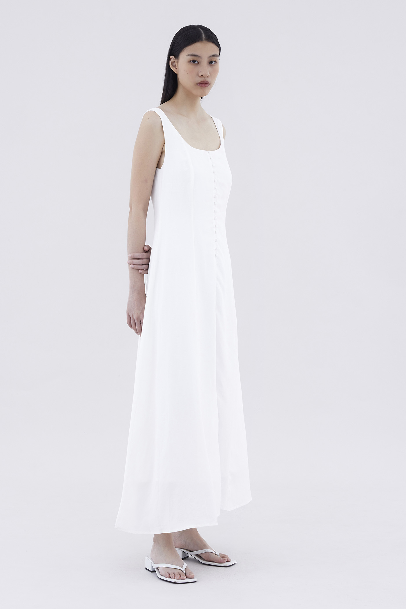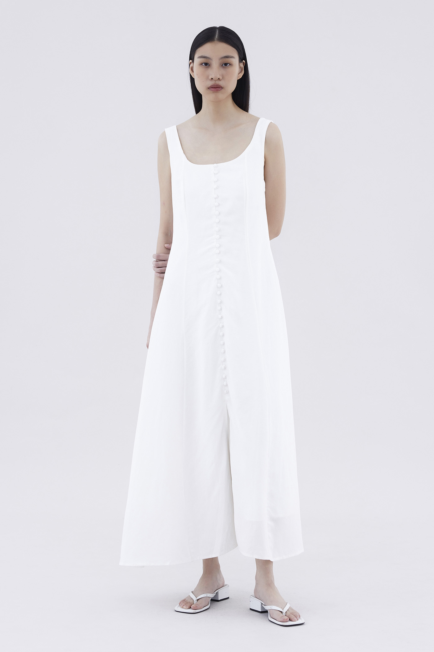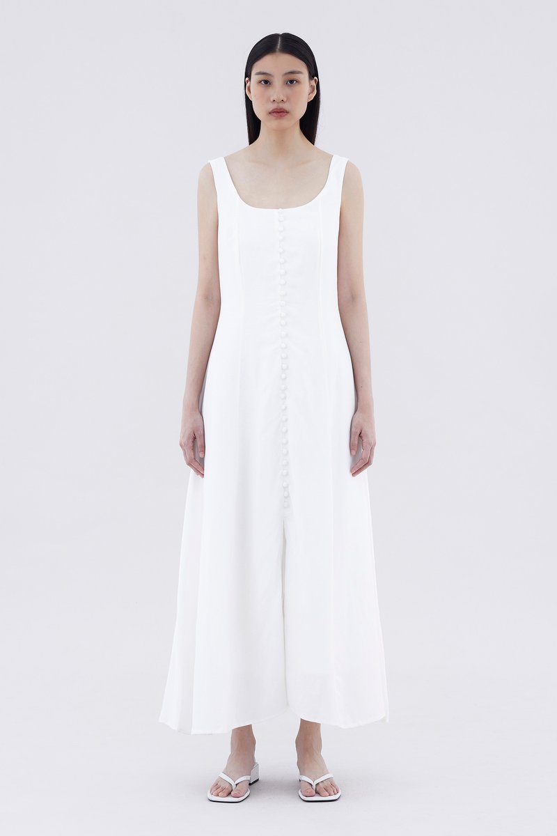 Keep it together. Made from smooth and non-stretch fabric, this sleeveless maxi dress features a wide angular neckline, side zip closure as well as a slit and decorative loop buttons at the front. Fits slimmer through the bodice before flowing out at the waist in a relaxed skirt.