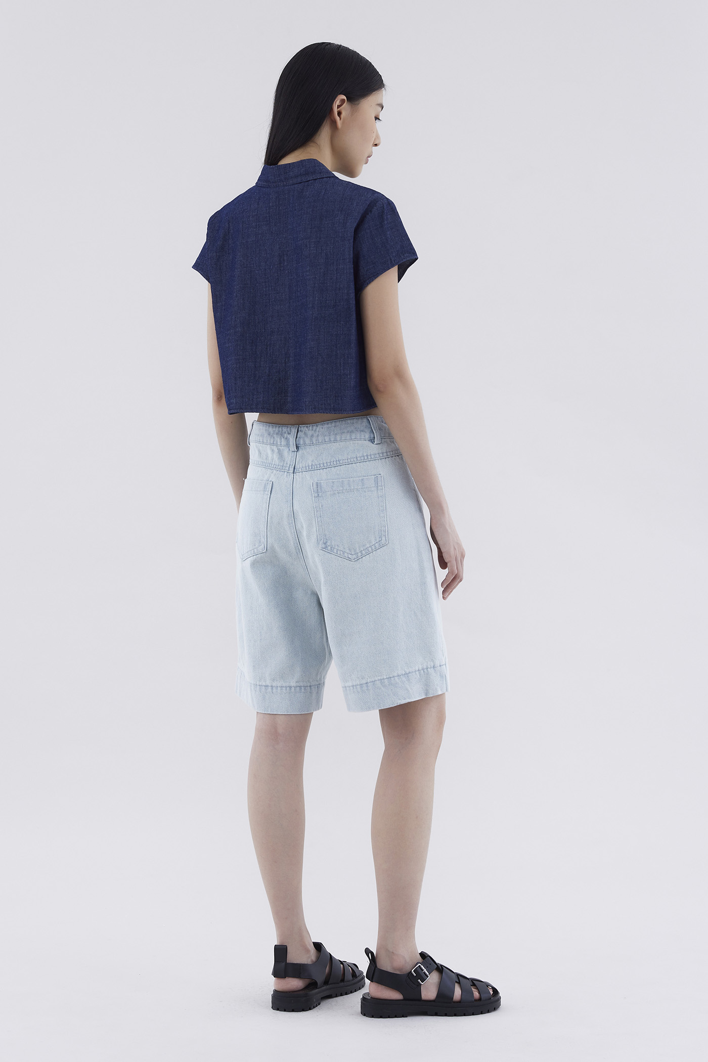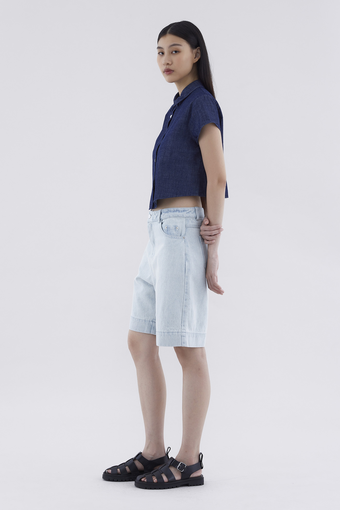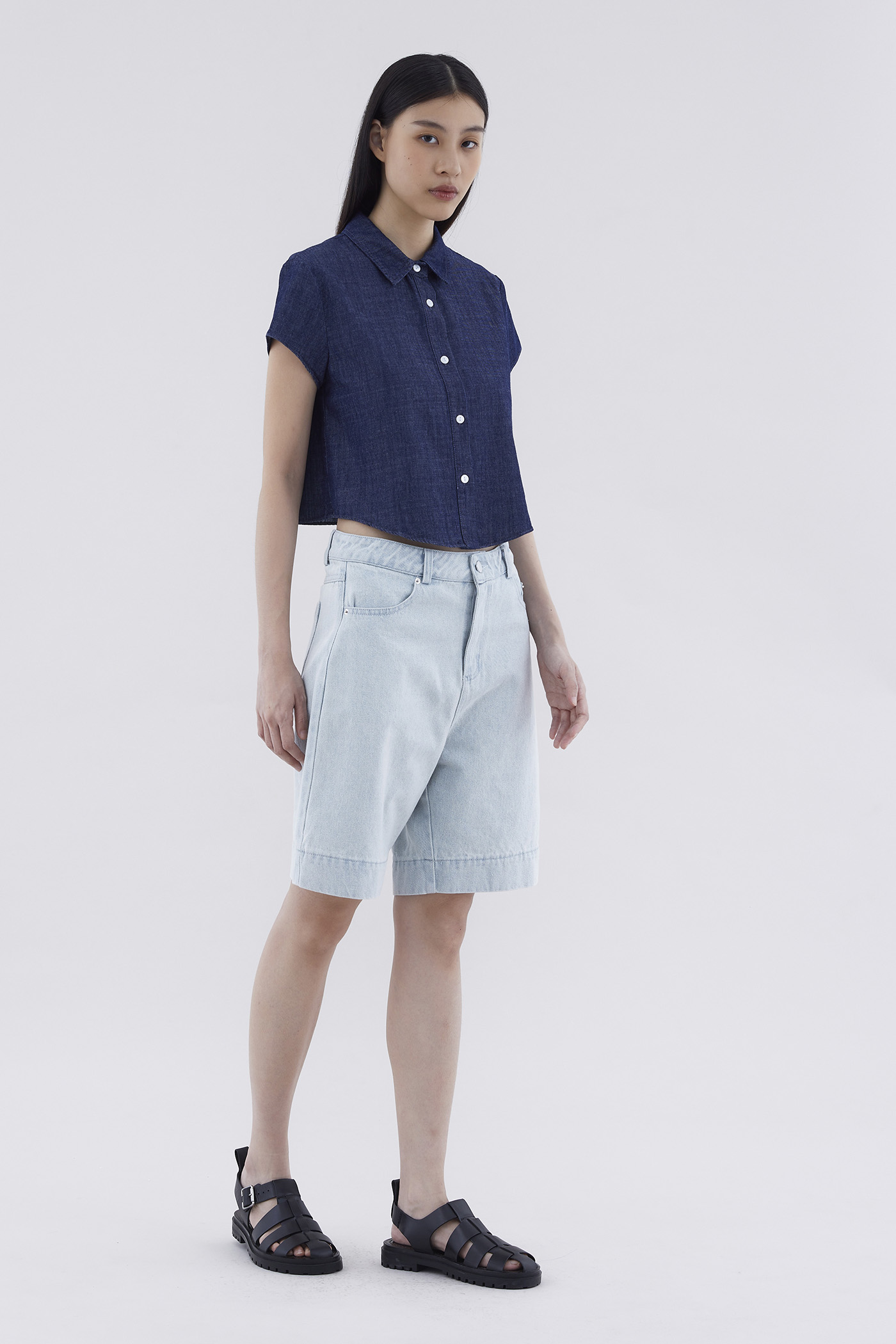 Somewhere in the middle. Cut from softly structured cotton denim, these mid-waisted bermuda bottoms feature belt loops, relaxed straight legs, and a front zip and button closure.