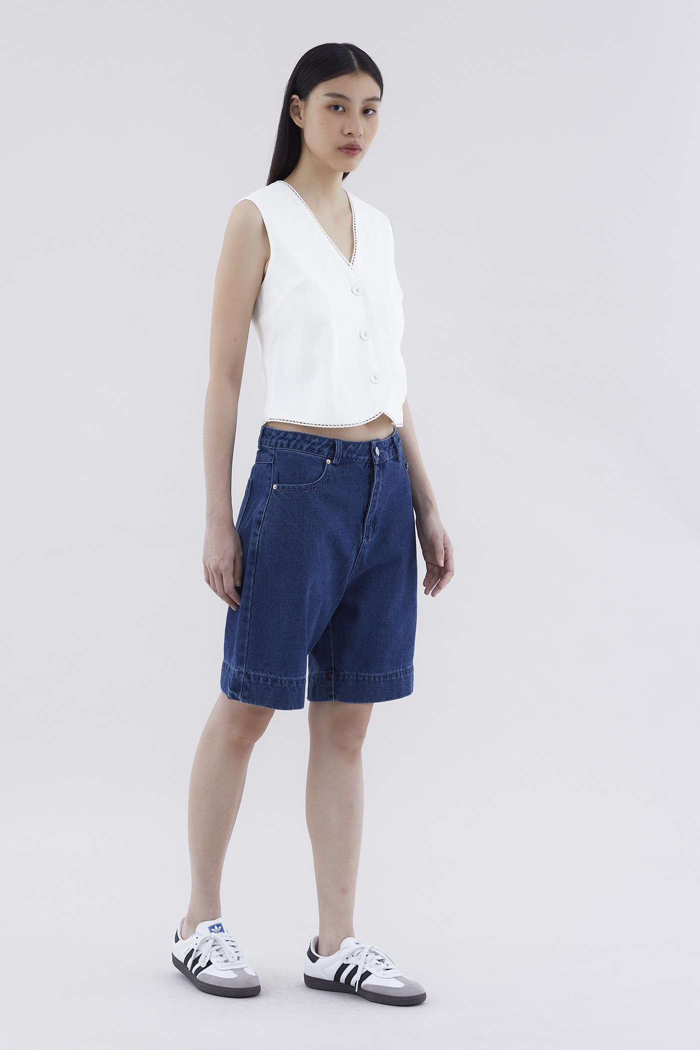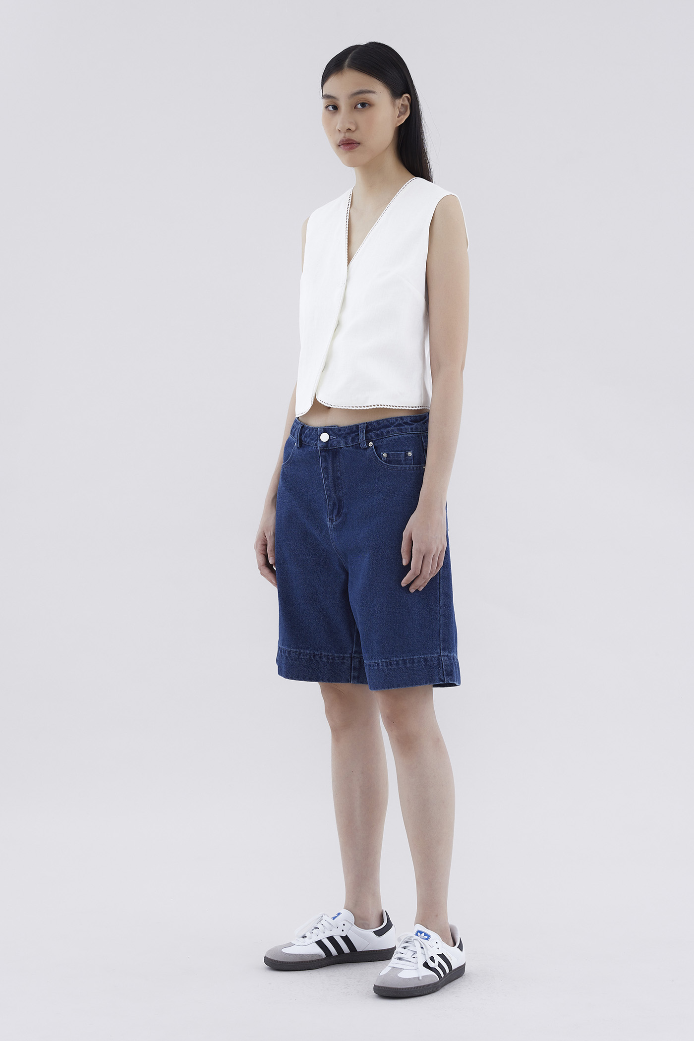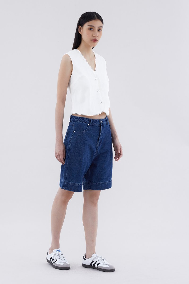 Somewhere in the middle. Cut from softly structured cotton denim, these mid-waisted bermuda bottoms feature belt loops, relaxed straight legs, and a front zip and button closure.