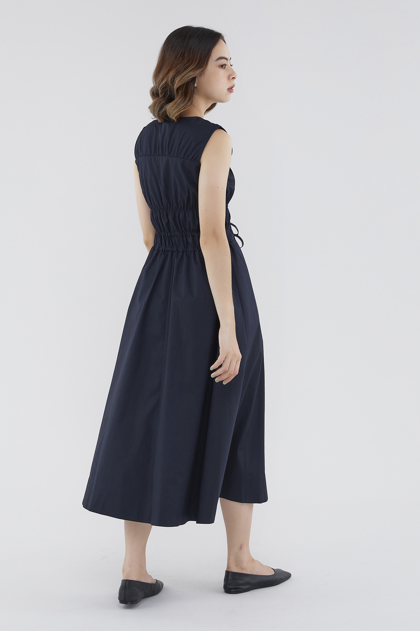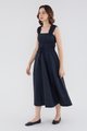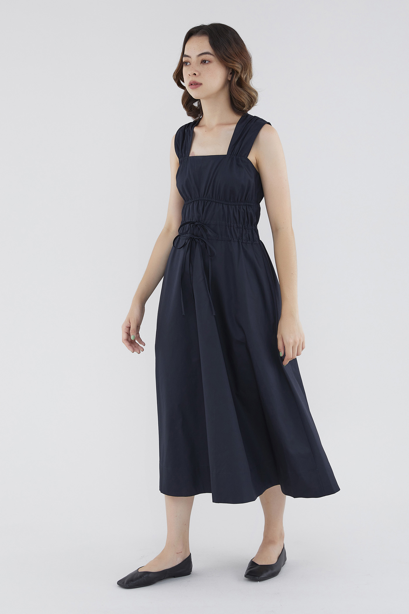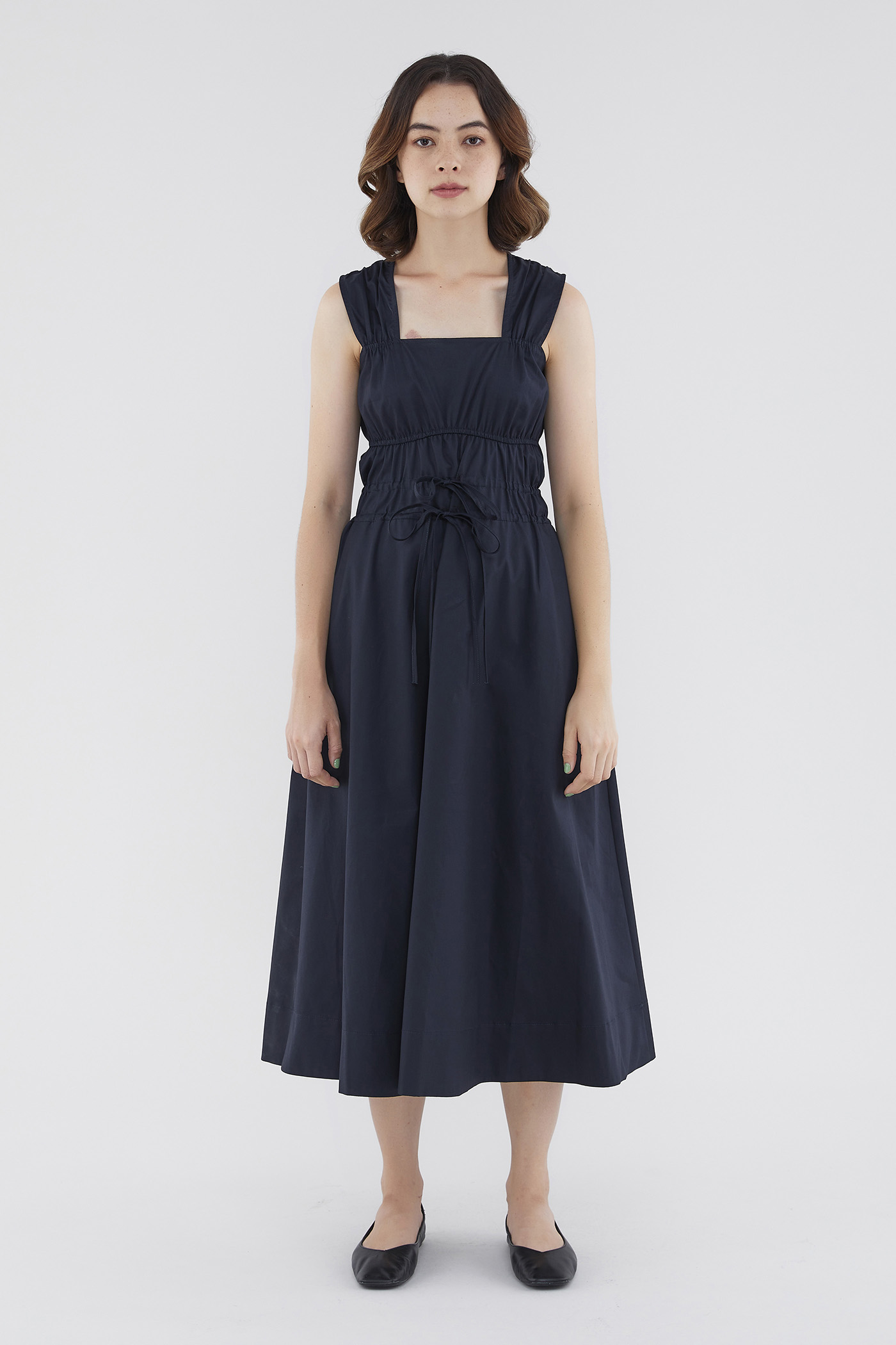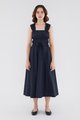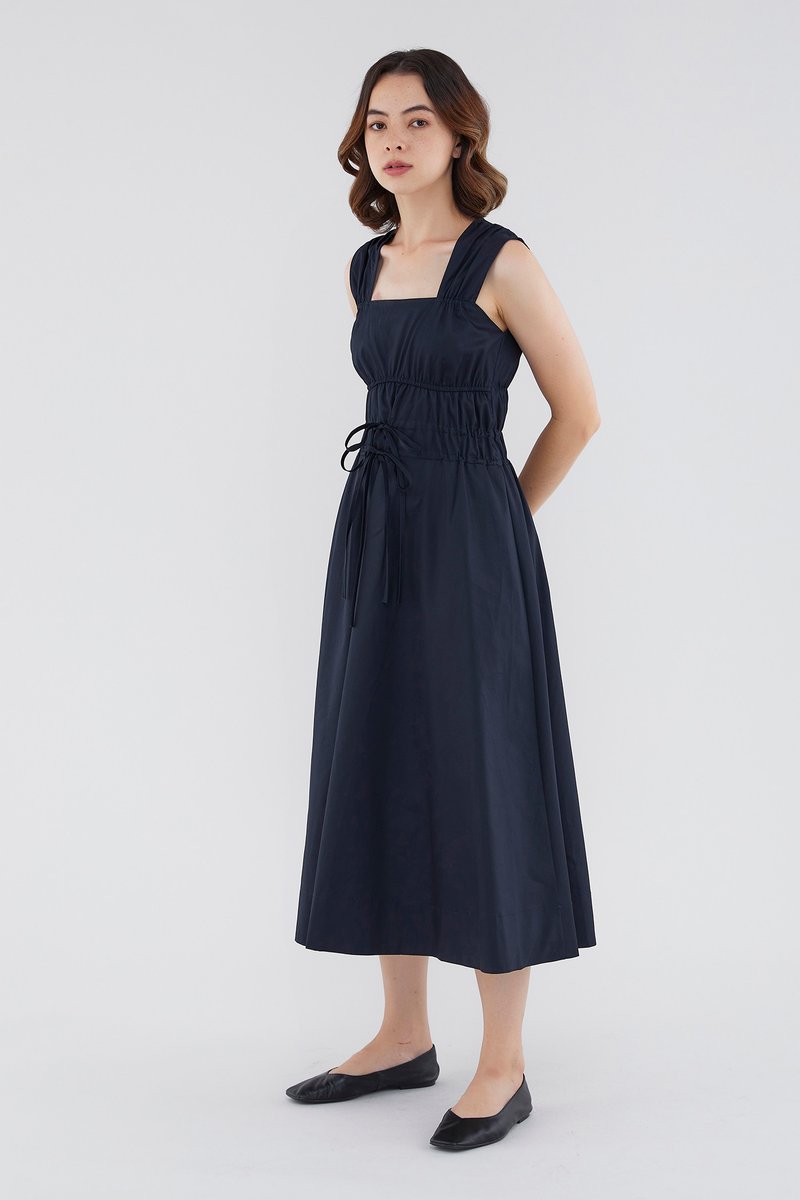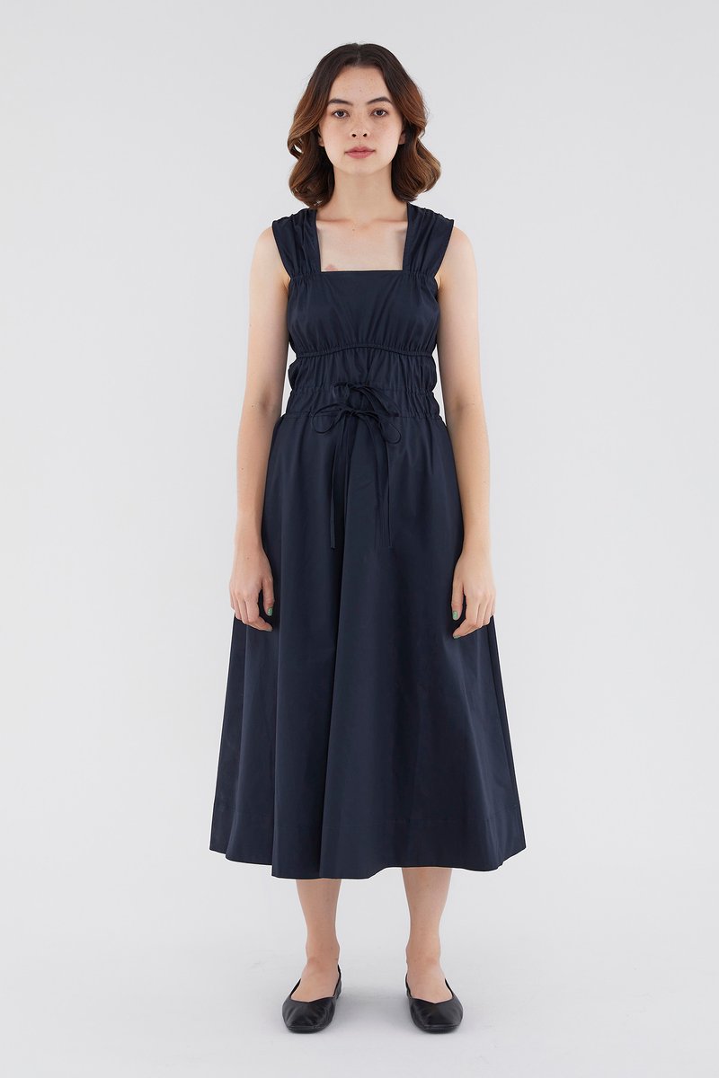 <p><span style="font-weight: 400;">Fabric Composition: 100% Cotton </span></p> <p><span style="font-weight: 400;">Lining: Full</span></p> <p><span style="font-weight: 400;">Sheerness: Opaque </span></p> <p><span style="font-weight: 400;">Pockets: None</span></p> <p><span style="font-weight: 400;">Double the details. Cut from crisp and non-stretch fabric, this sleeveless midi dress features a square neckline, wide shoulder straps, an elasticated band beneath the bust, a ruched bodice and double, adjustable tie-straps at its waist. Worn in a relaxed fit.</span></p> <p><span style="font-weight: 400;">Care Instructions: Do not soak / Do not bleach / Handwash or Machine wash on gentle mode / Do not machine dry / Iron using low heat</span></p>