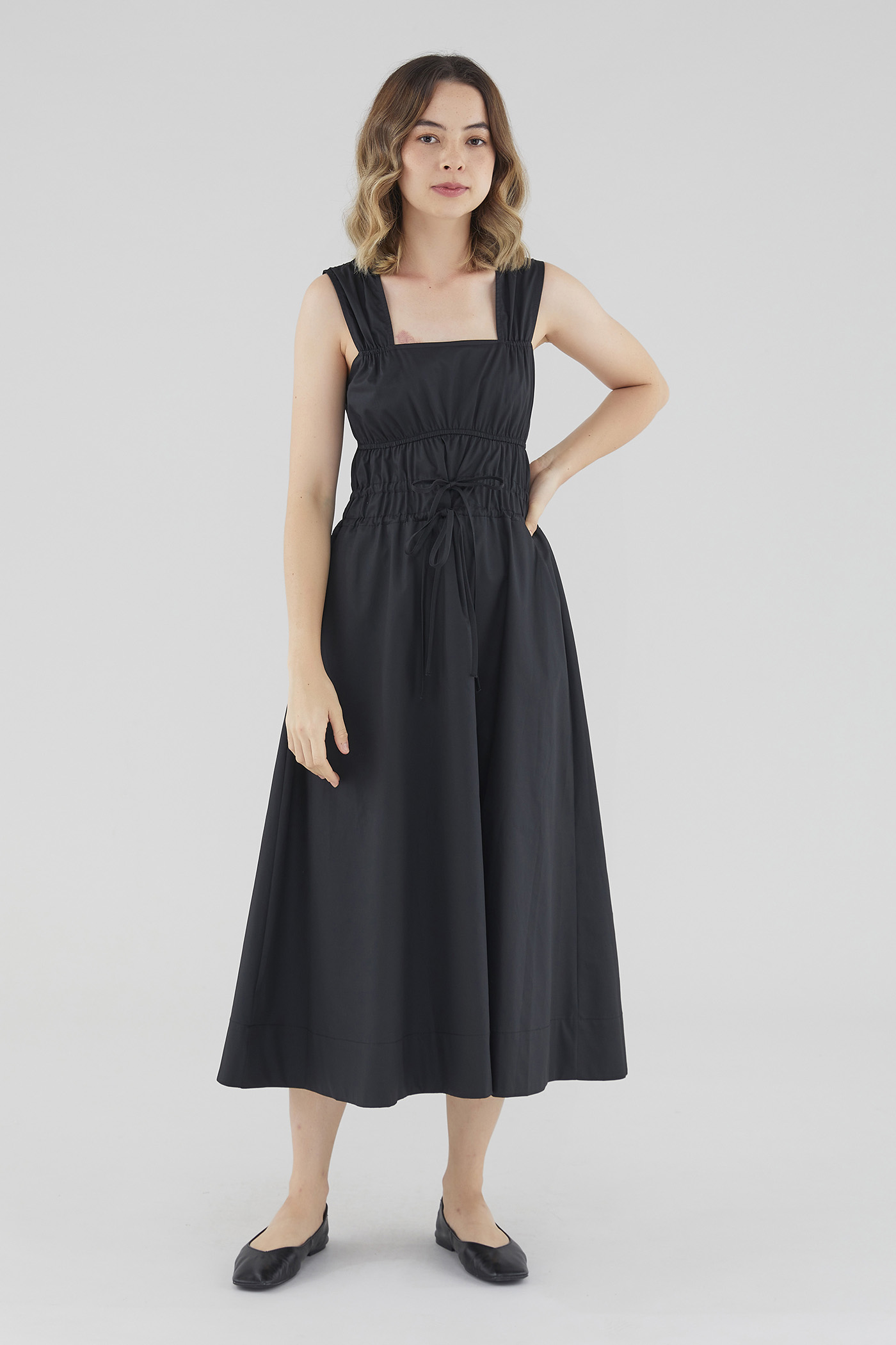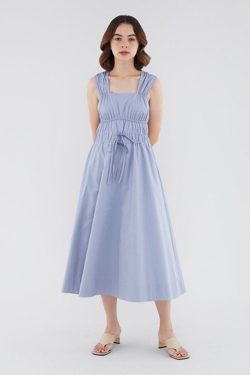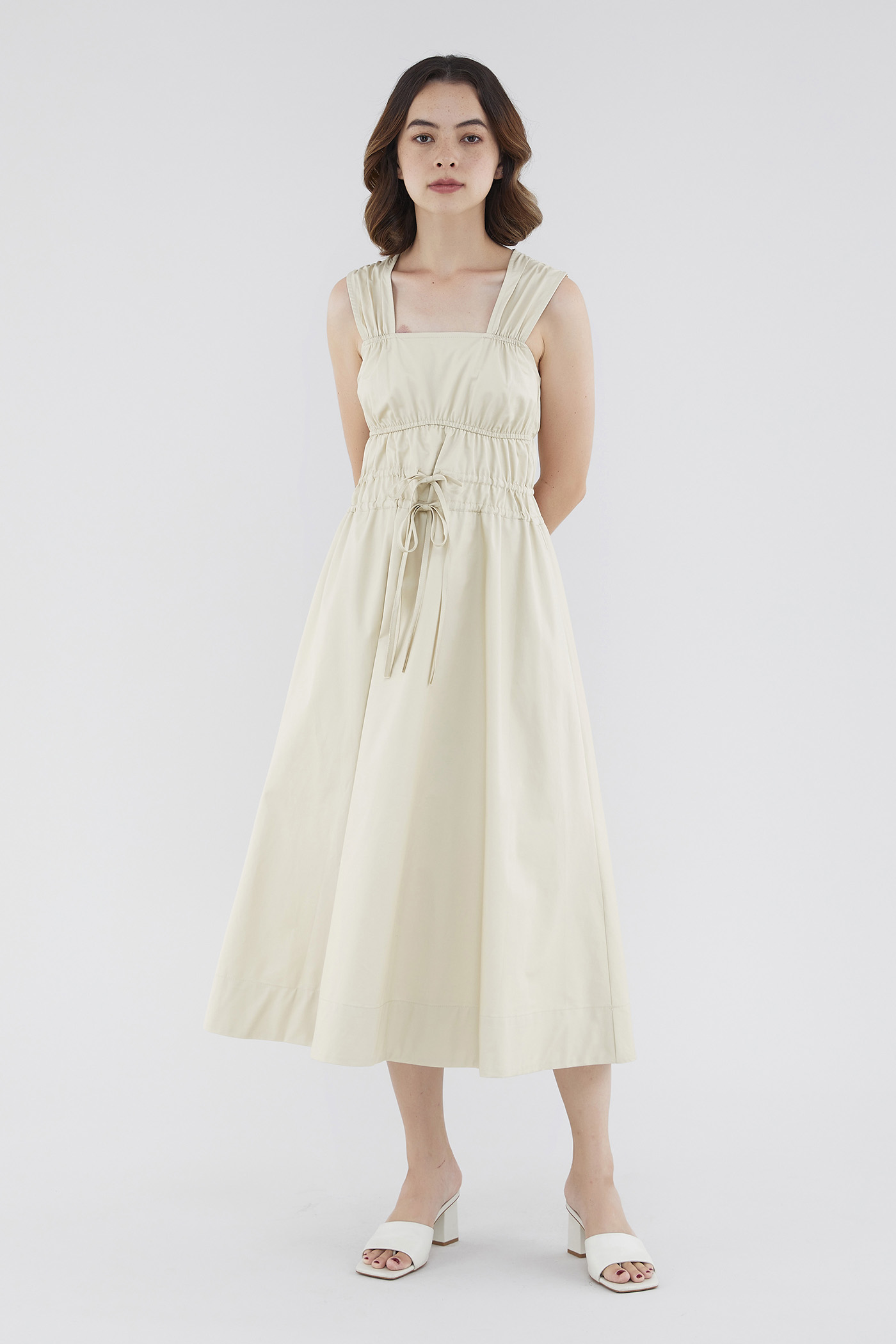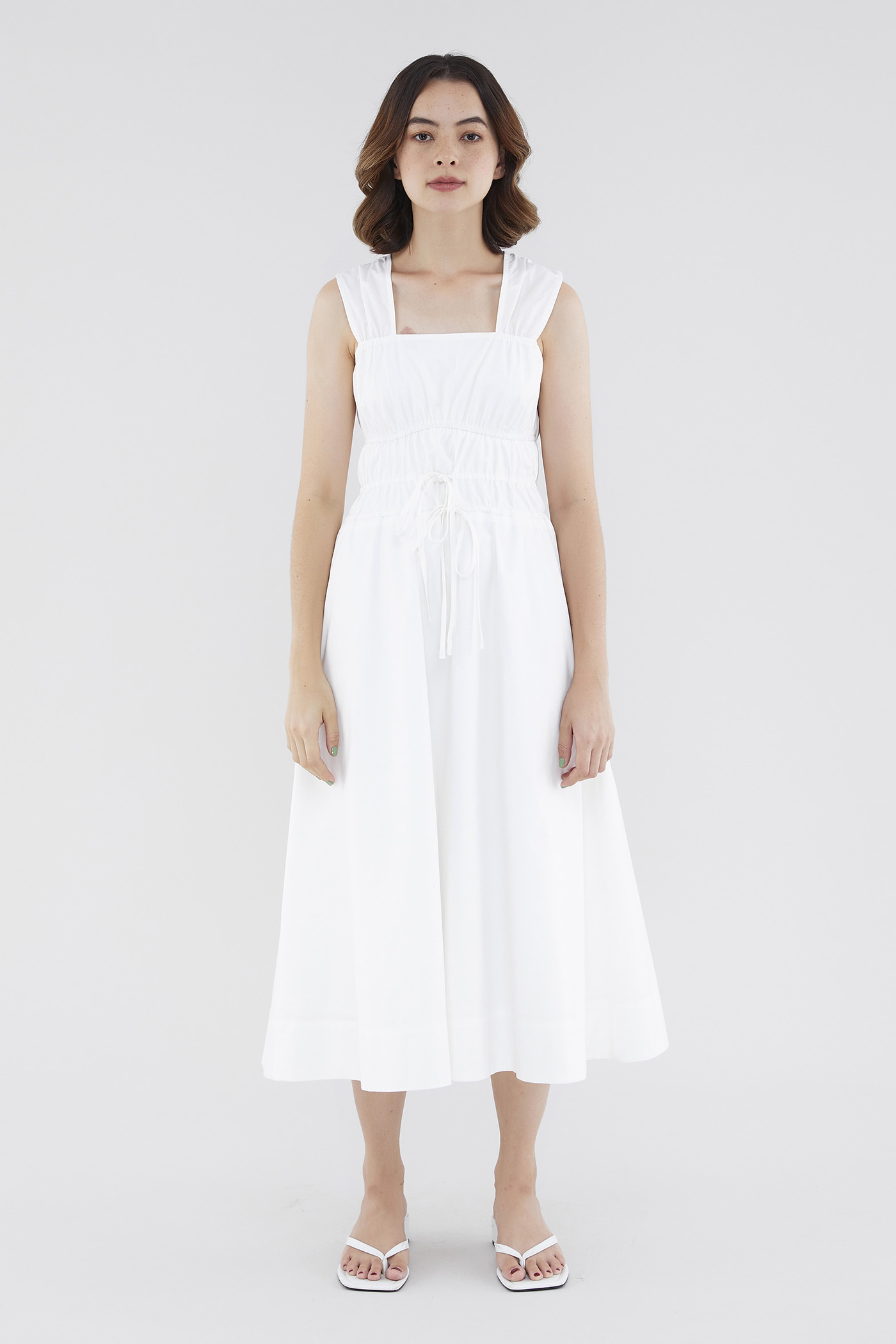 <p><span style="font-weight: 400;">Fabric Composition: 100% Cotton </span></p> <p><span style="font-weight: 400;">Lining: Full</span></p> <p><span style="font-weight: 400;">Sheerness: Opaque </span></p> <p><span style="font-weight: 400;">Pockets: None</span></p> <p><span style="font-weight: 400;">Double the details. Cut from crisp and non-stretch fabric, this sleeveless midi dress features a square neckline, wide shoulder straps, an elasticated band beneath the bust, a ruched bodice and double, adjustable tie-straps at its waist. Worn in a relaxed fit.</span></p> <p><span style="font-weight: 400;">Care Instructions: Do not soak / Do not bleach / Handwash or Machine wash on gentle mode / Do not machine dry / Iron using low heat</span></p>
