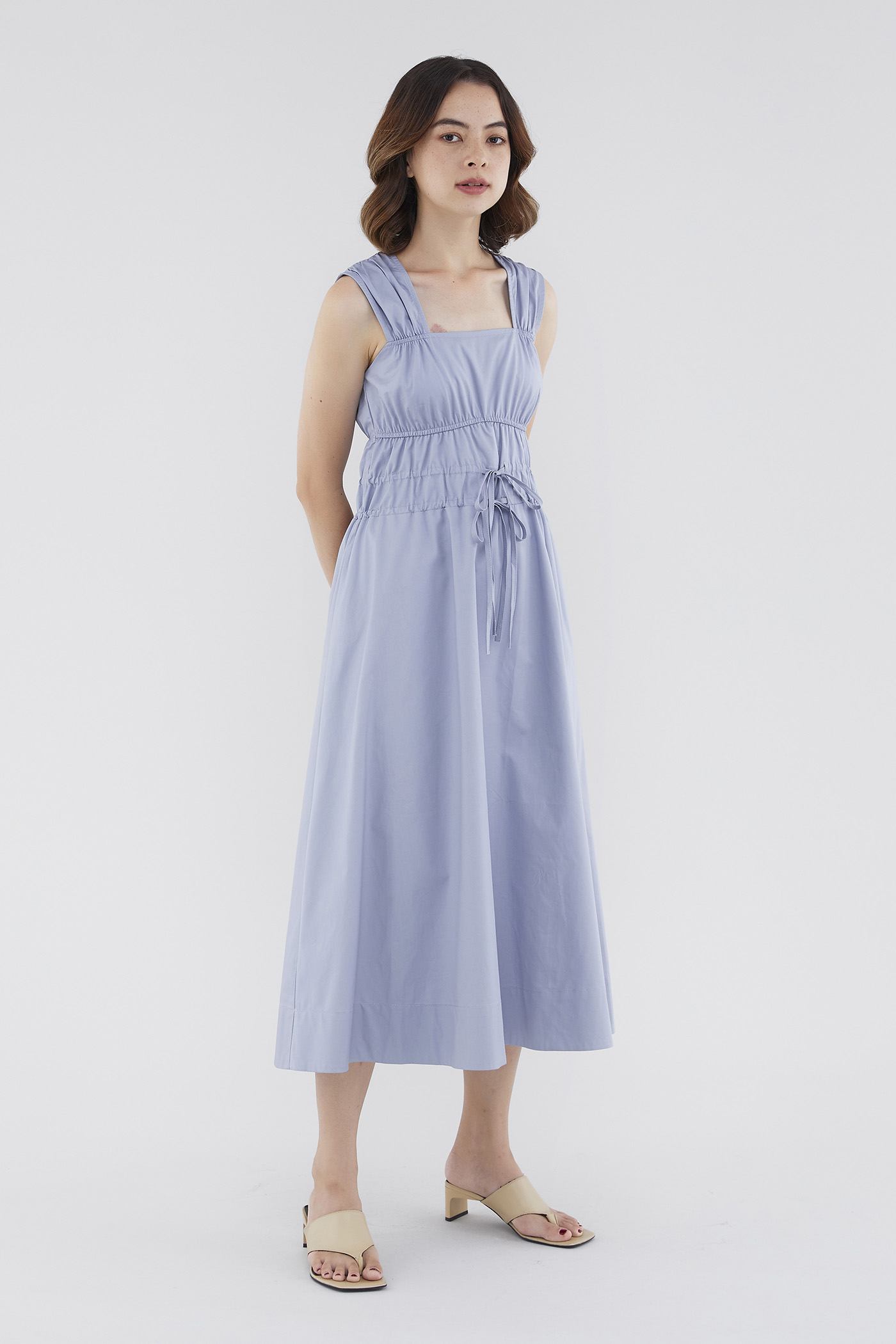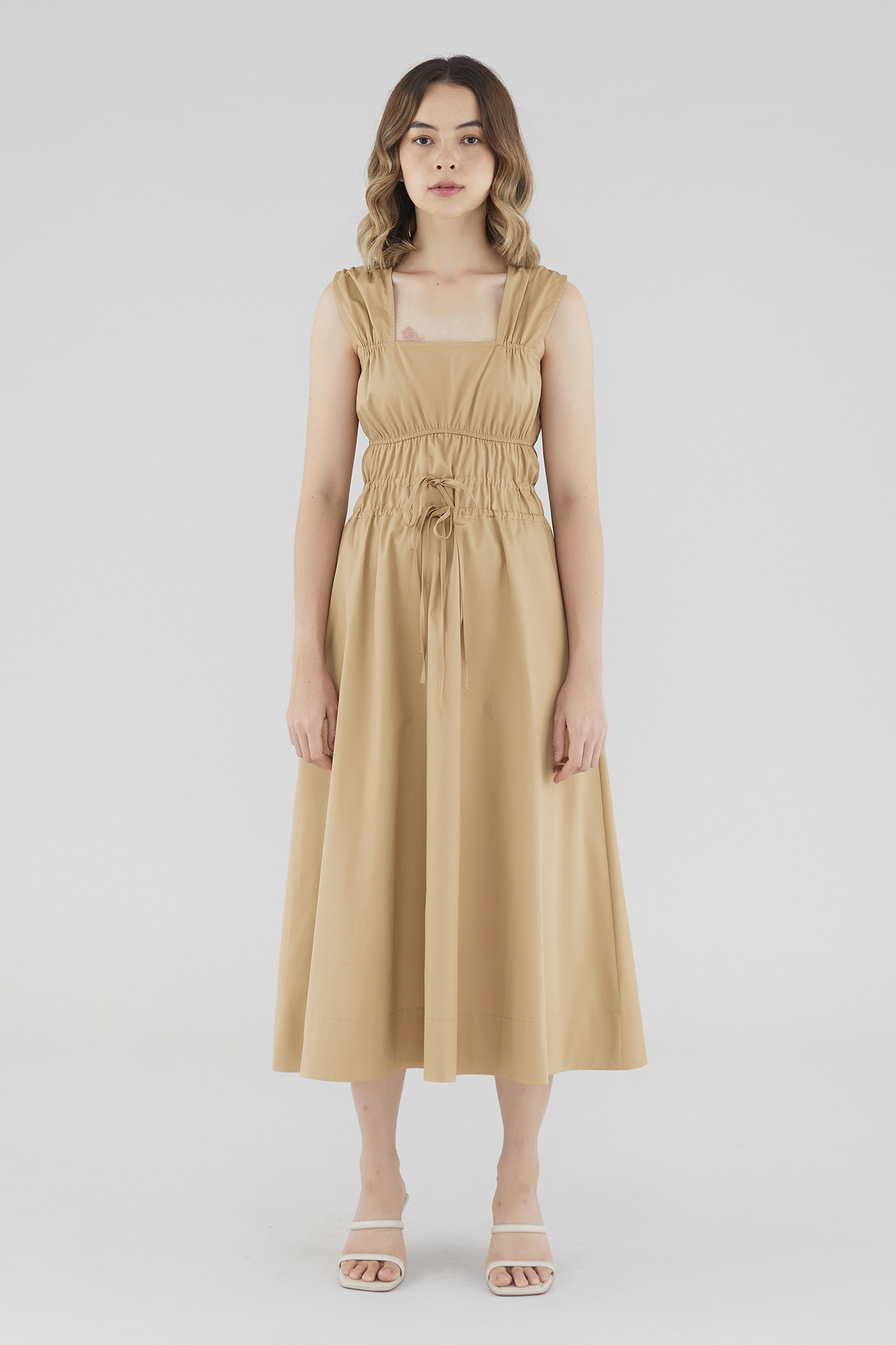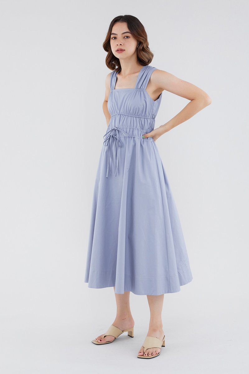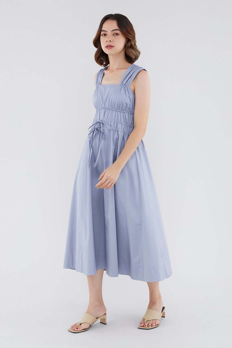 <p><span style="font-weight: 400;">Fabric Composition: 100% Cotton </span></p> <p><span style="font-weight: 400;">Lining: Full</span></p> <p><span style="font-weight: 400;">Sheerness: Opaque </span></p> <p><span style="font-weight: 400;">Pockets: None</span></p> <p><span style="font-weight: 400;">Double the details. Cut from crisp and non-stretch fabric, this sleeveless midi dress features a square neckline, wide shoulder straps, an elasticated band beneath the bust, a ruched bodice and double, adjustable tie-straps at its waist. Worn in a relaxed fit.</span></p> <p><span style="font-weight: 400;">Care Instructions: Do not soak / Do not bleach / Handwash or Machine wash on gentle mode / Do not machine dry / Iron using low heat</span></p>