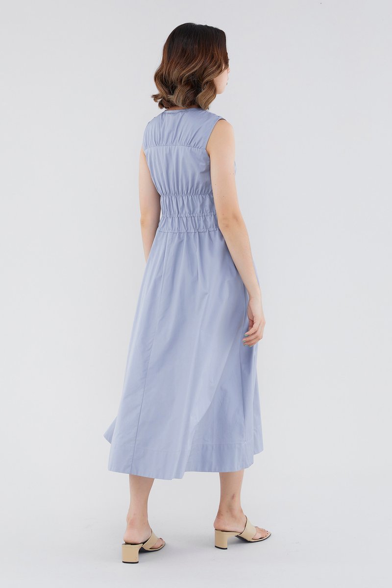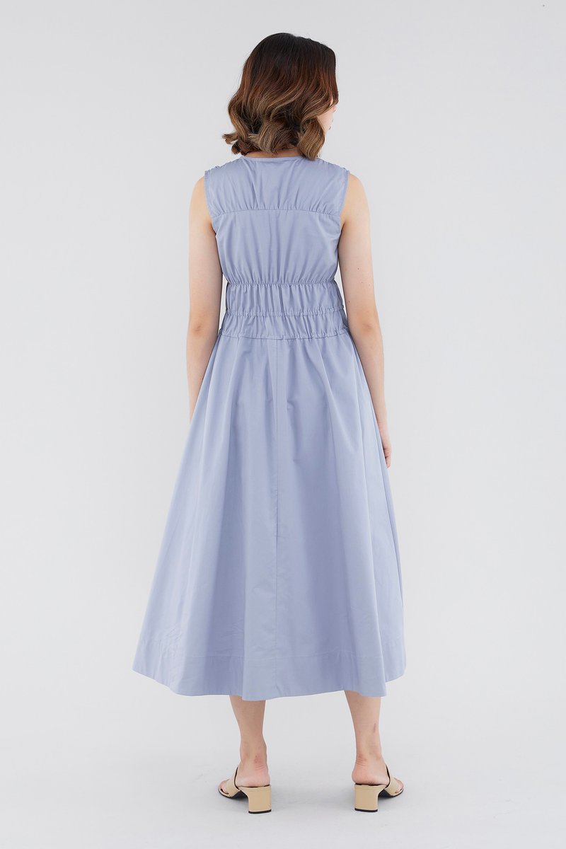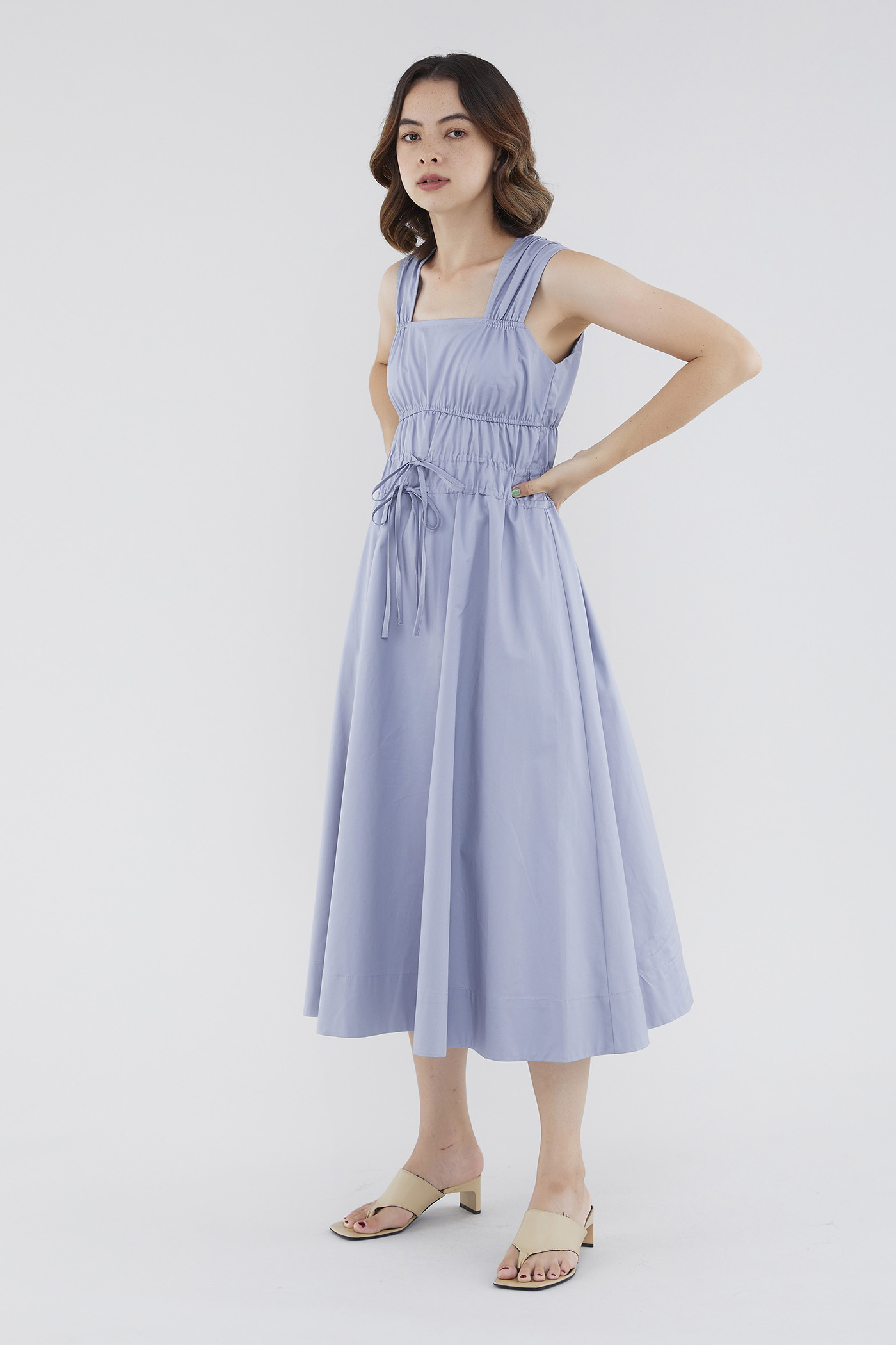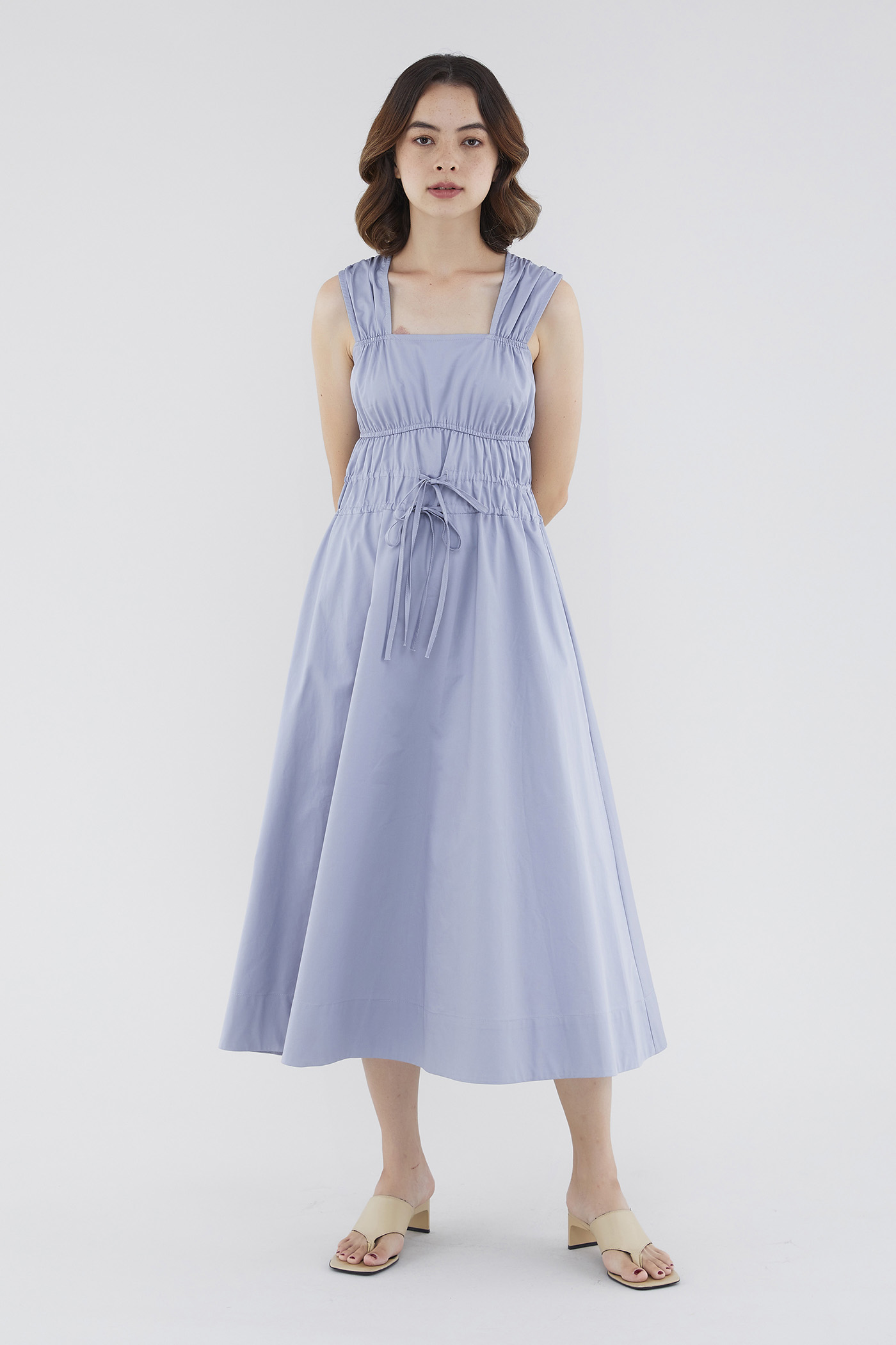 <p><span style="font-weight: 400;">Fabric Composition: 100% Cotton </span></p> <p><span style="font-weight: 400;">Lining: Full</span></p> <p><span style="font-weight: 400;">Sheerness: Opaque </span></p> <p><span style="font-weight: 400;">Pockets: None</span></p> <p><span style="font-weight: 400;">Double the details. Cut from crisp and non-stretch fabric, this sleeveless midi dress features a square neckline, wide shoulder straps, an elasticated band beneath the bust, a ruched bodice and double, adjustable tie-straps at its waist. Worn in a relaxed fit.</span></p> <p><span style="font-weight: 400;">Care Instructions: Do not soak / Do not bleach / Handwash or Machine wash on gentle mode / Do not machine dry / Iron using low heat</span></p>