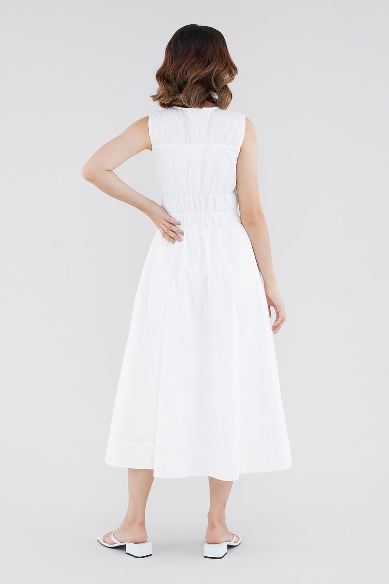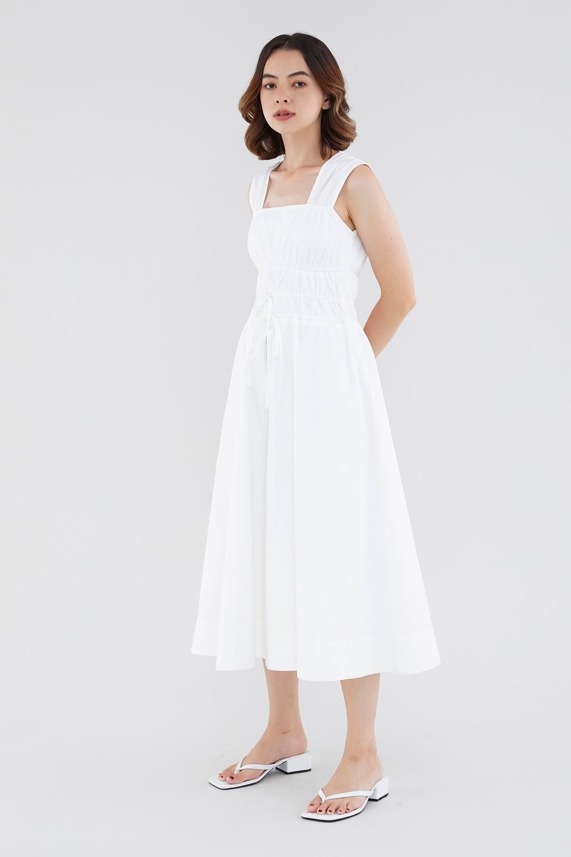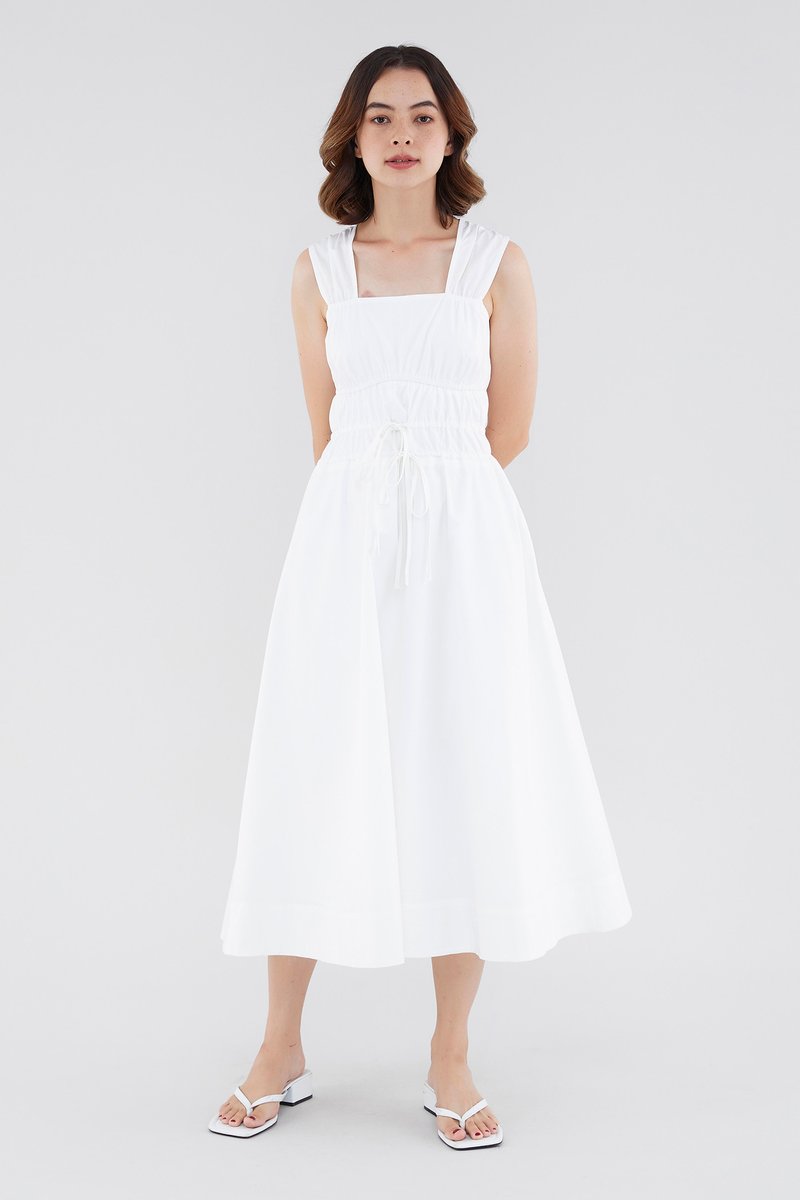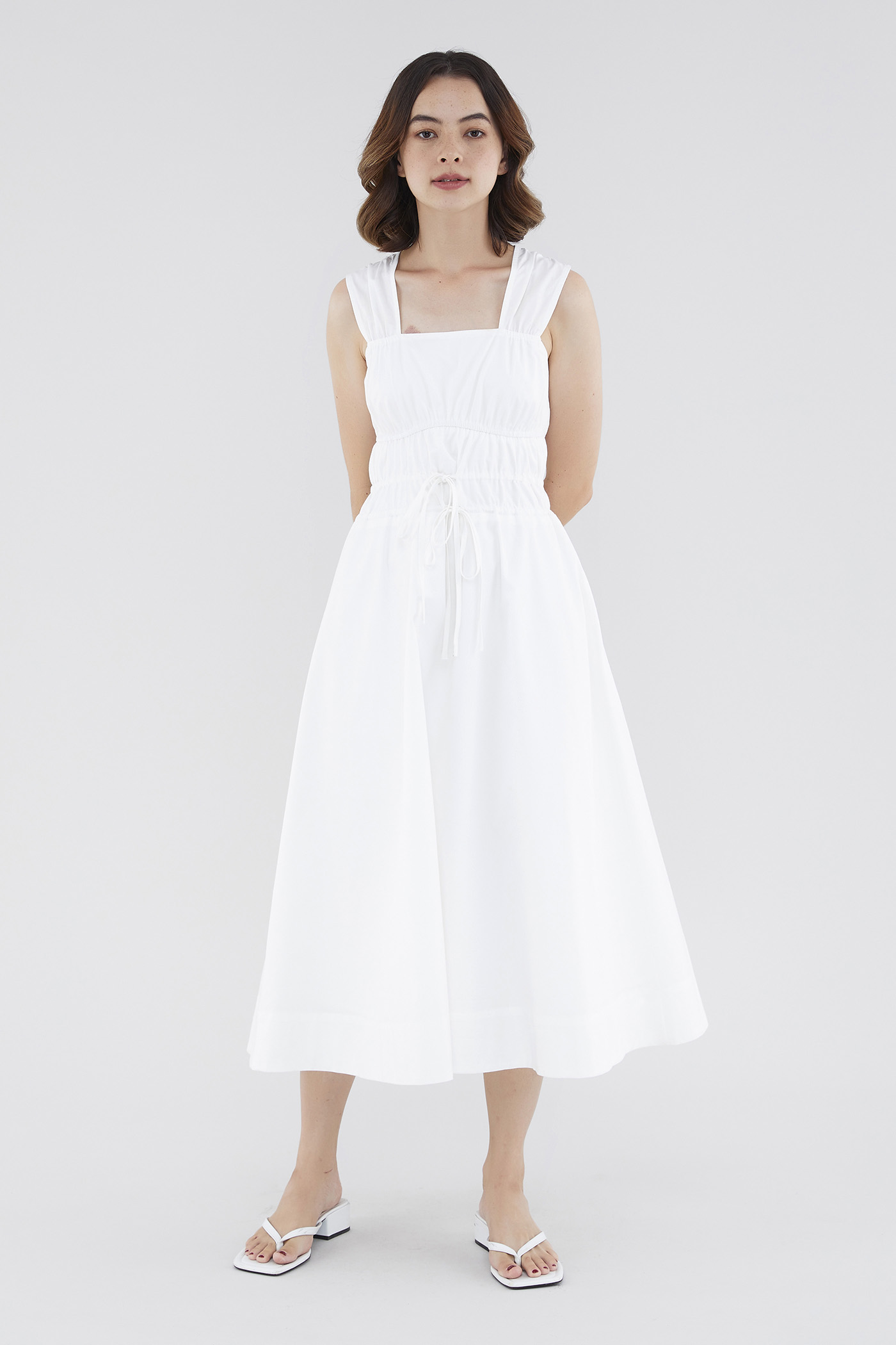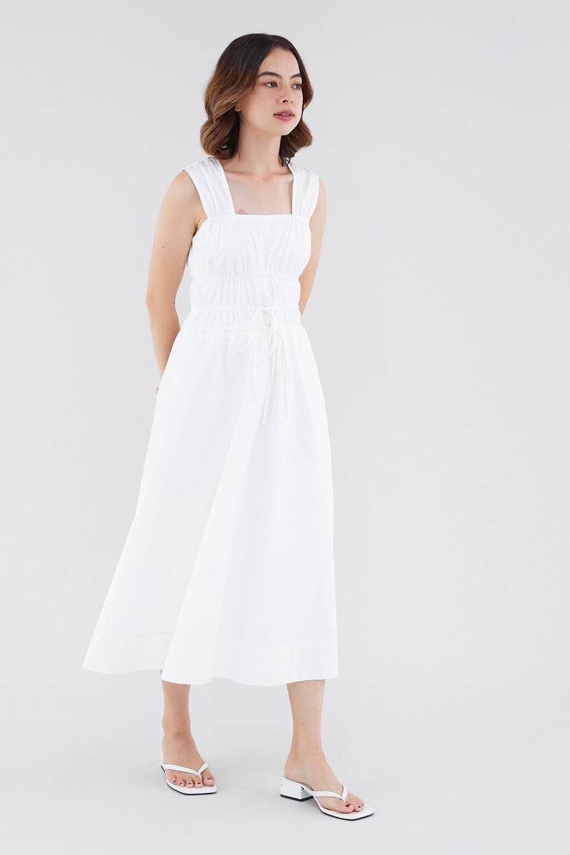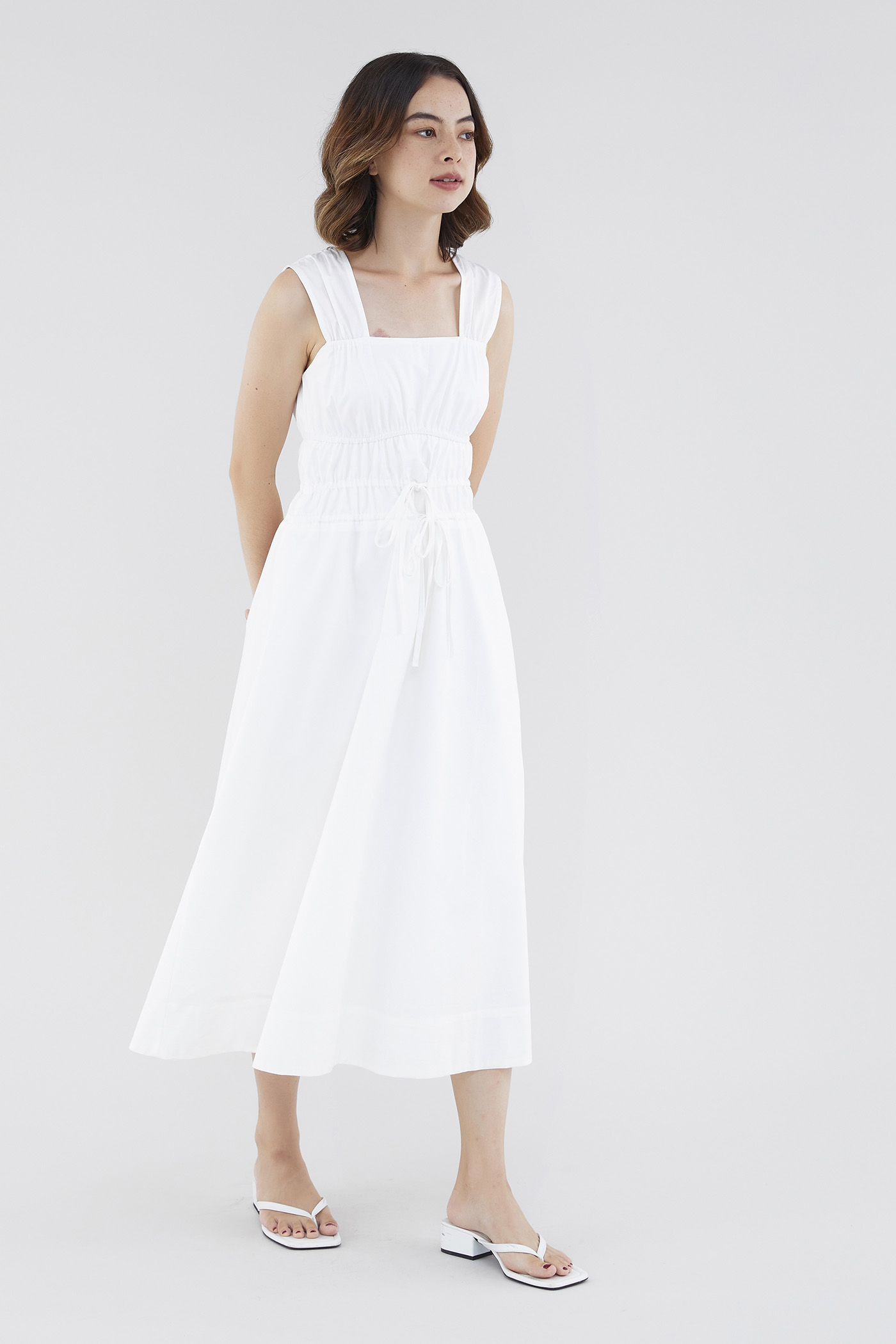 <p><span style="font-weight: 400;">Fabric Composition: 100% Cotton </span></p> <p><span style="font-weight: 400;">Lining: Full</span></p> <p><span style="font-weight: 400;">Sheerness: Opaque </span></p> <p><span style="font-weight: 400;">Pockets: None</span></p> <p><span style="font-weight: 400;">Double the details. Cut from crisp and non-stretch fabric, this sleeveless midi dress features a square neckline, wide shoulder straps, an elasticated band beneath the bust, a ruched bodice and double, adjustable tie-straps at its waist. Worn in a relaxed fit.</span></p> <p><span style="font-weight: 400;">Care Instructions: Do not soak / Do not bleach / Handwash or Machine wash on gentle mode / Do not machine dry / Iron using low heat</span></p>