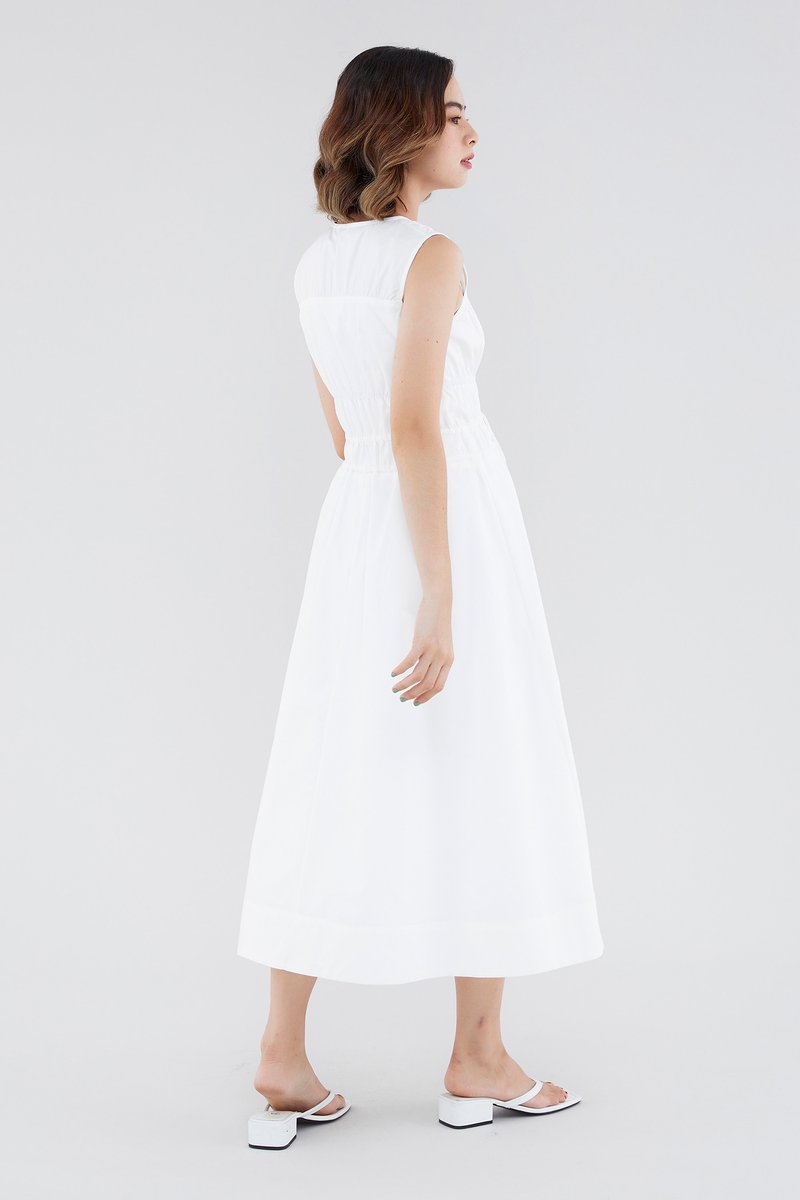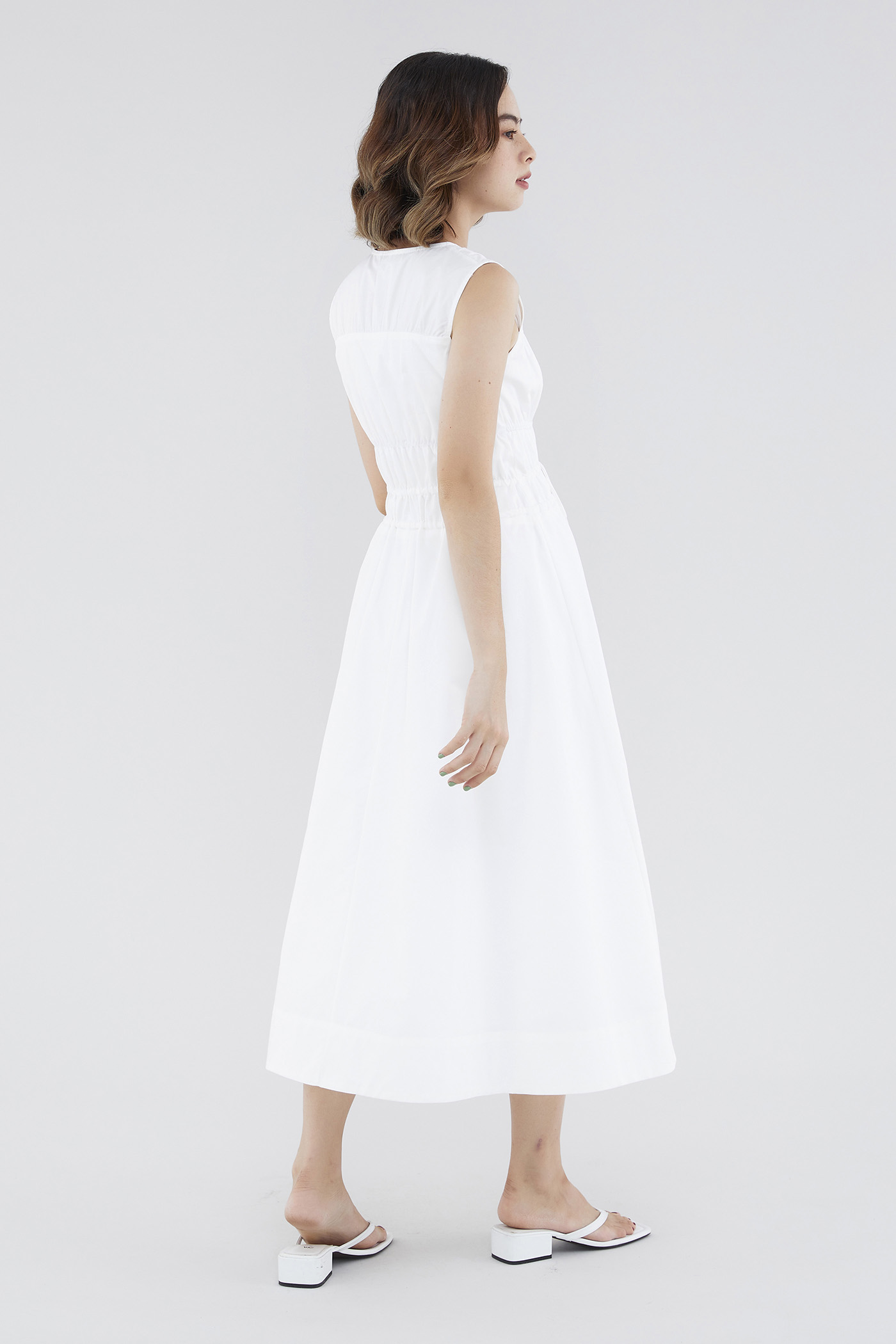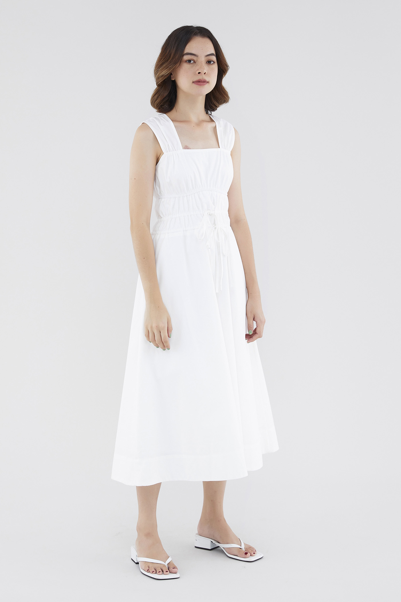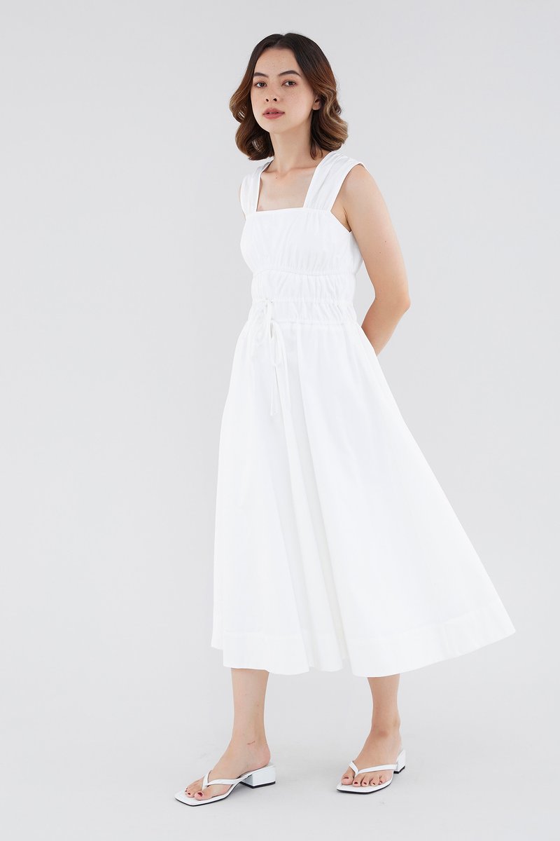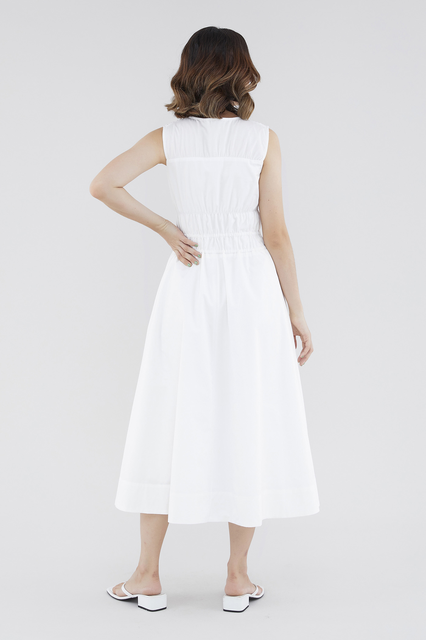 <p><span style="font-weight: 400;">Fabric Composition: 100% Cotton </span></p> <p><span style="font-weight: 400;">Lining: Full</span></p> <p><span style="font-weight: 400;">Sheerness: Opaque </span></p> <p><span style="font-weight: 400;">Pockets: None</span></p> <p><span style="font-weight: 400;">Double the details. Cut from crisp and non-stretch fabric, this sleeveless midi dress features a square neckline, wide shoulder straps, an elasticated band beneath the bust, a ruched bodice and double, adjustable tie-straps at its waist. Worn in a relaxed fit.</span></p> <p><span style="font-weight: 400;">Care Instructions: Do not soak / Do not bleach / Handwash or Machine wash on gentle mode / Do not machine dry / Iron using low heat</span></p>