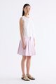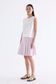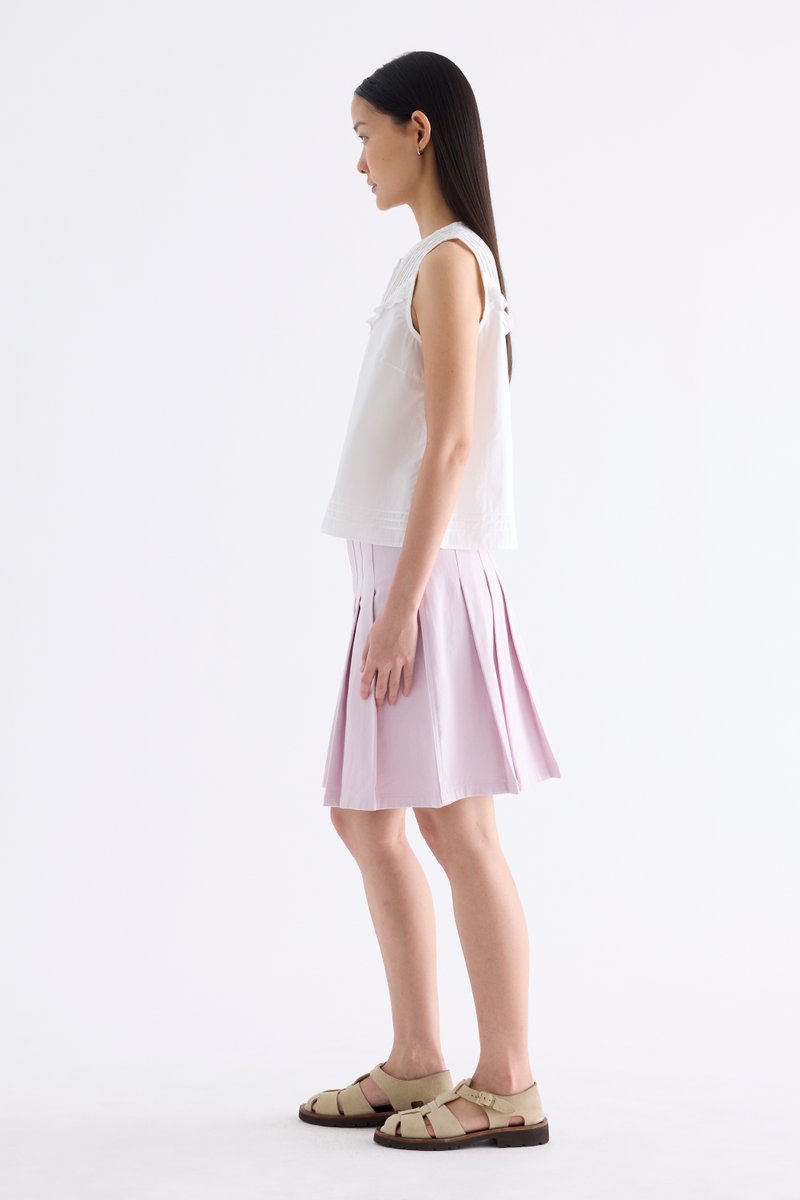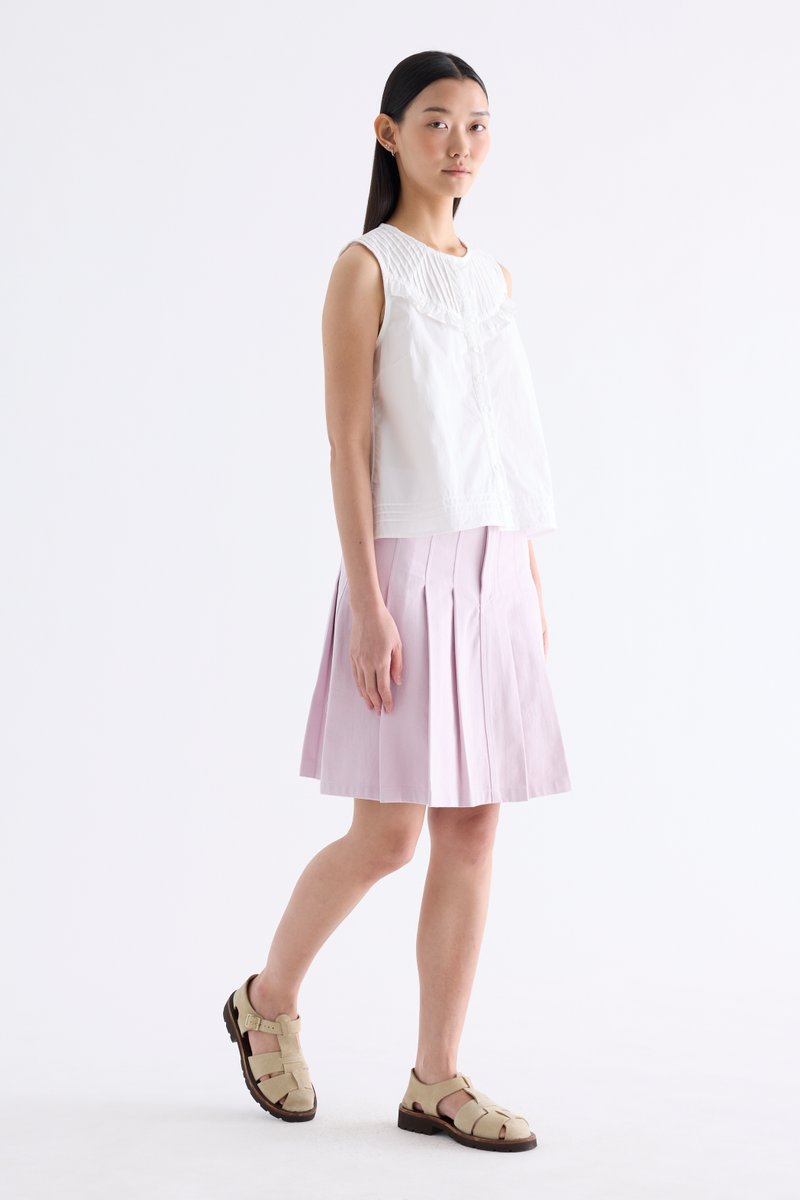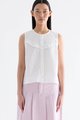 Tailored and textured. Cut from crisp and softly structured cotton, this sleeveless top features a pleated, frill-trimmed yoke, round neckline, button-down front and pleated hem. Worn in a relaxed, boxy fit.