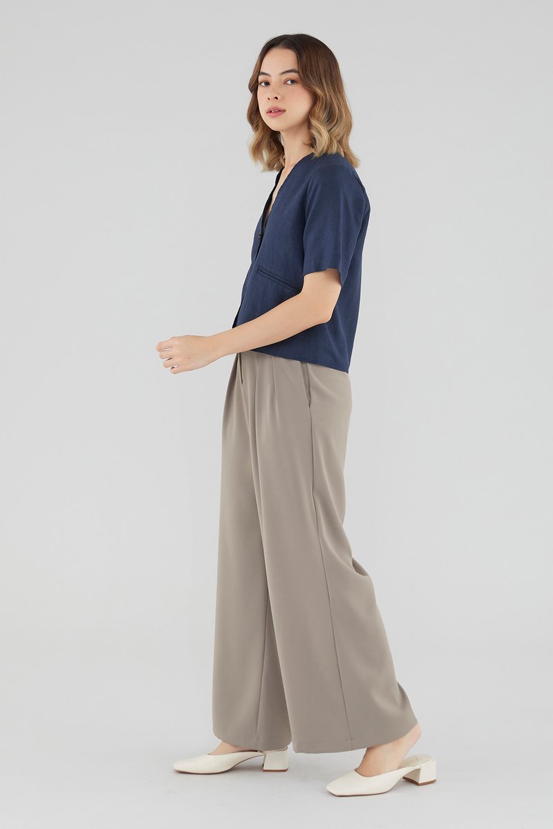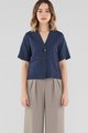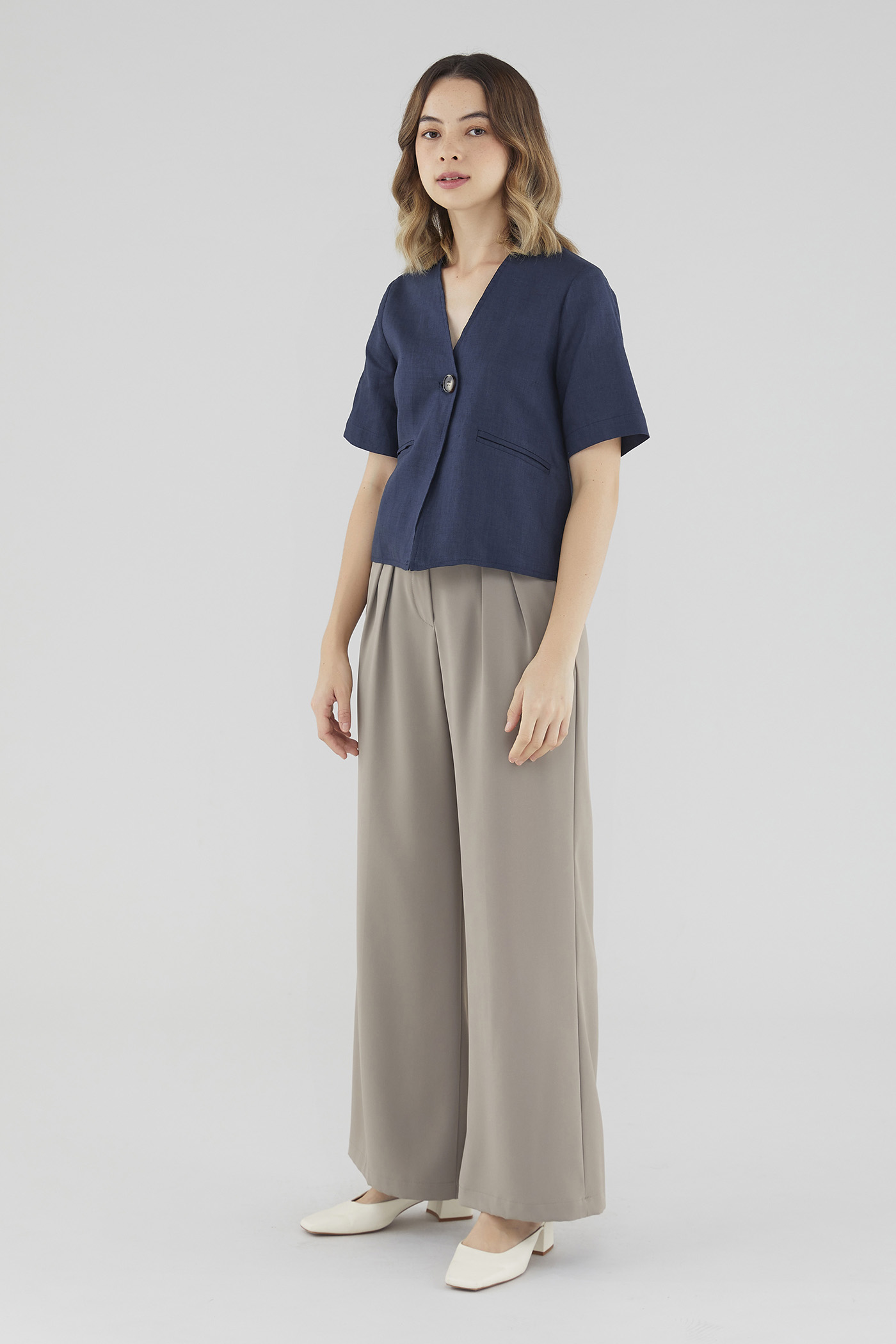 Everyday tailoring. Cut from airy and lightweight 100% linen, this blazer-style top features a deep V-neckline, short sleeves and a single button closure on the front. Style it on its own or as a layering piece. Fits slim.