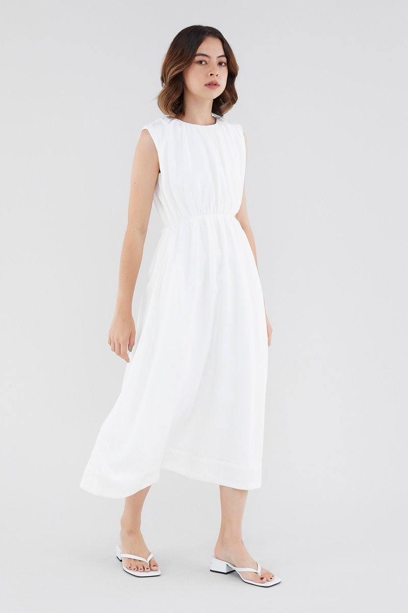 <p><span style="font-weight: 400;">Fabric Composition: 92% Lyocell 8% Linen</span></p> <p><span style="font-weight: 400;">Lining: Full</span></p> <p><span style="font-weight: 400;">Sheerness: Opaque </span></p> <p><span style="font-weight: 400;">Pockets: Two pockets on the side</span></p> <p><span style="font-weight: 400;">For your AM to PM staples. Made from smooth and drapey cotton, this sleeveless maxi dress features a round neckline, a side cut-out at the waist and soft ruching throughout for an effortlessly polished look. Worn in a relaxed, A-line silhouette with a zip closure on the back. </span></p> <p><span style="font-weight: 400;">Care Instructions: Do not soak / Do not bleach / Handwash or Machine wash on gentle mode / Do not machine dry / Iron using low heat</span></p> <p><em><span style="font-weight: 400;">This piece is made from a combination of our Wear Better fabrics, linen and lyocell. Both are fully biodegradable, durable and derived from production processes that consume and generate significantly less resources and waste respectively — meaning your clothes have a longer, less environmentally damaging life cycle.</span></em></p>