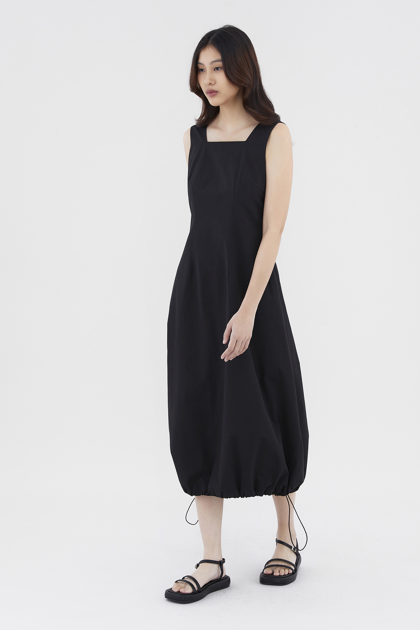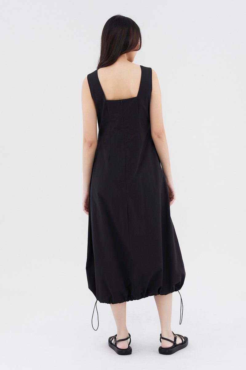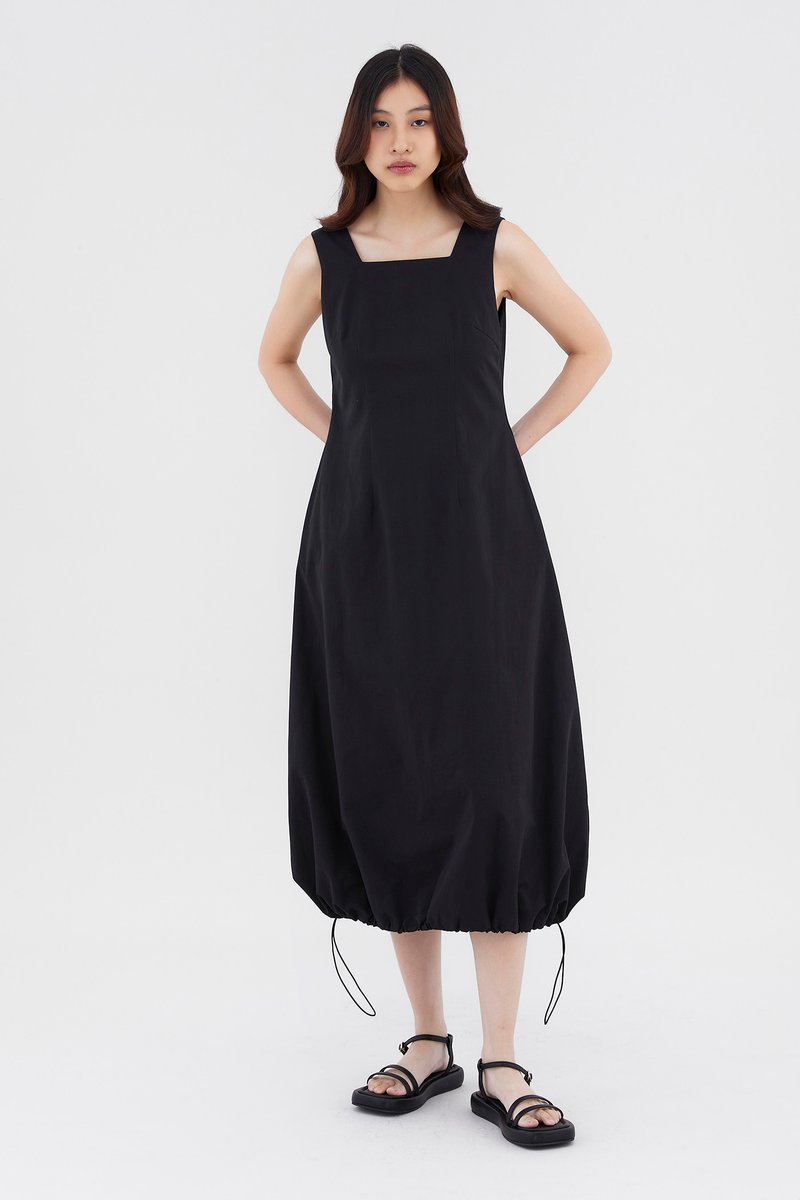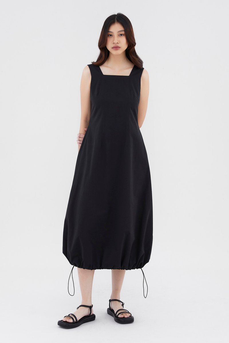 Leave an impression. Cut from crisp and gently structured cotton, this sleeveless midi-to-maxi dress features a square neckline, wide shoulder straps, a back zip closure and a bubble hemline with an adjustable toggle tie. Fits slim in a subtle A-line silhouette.