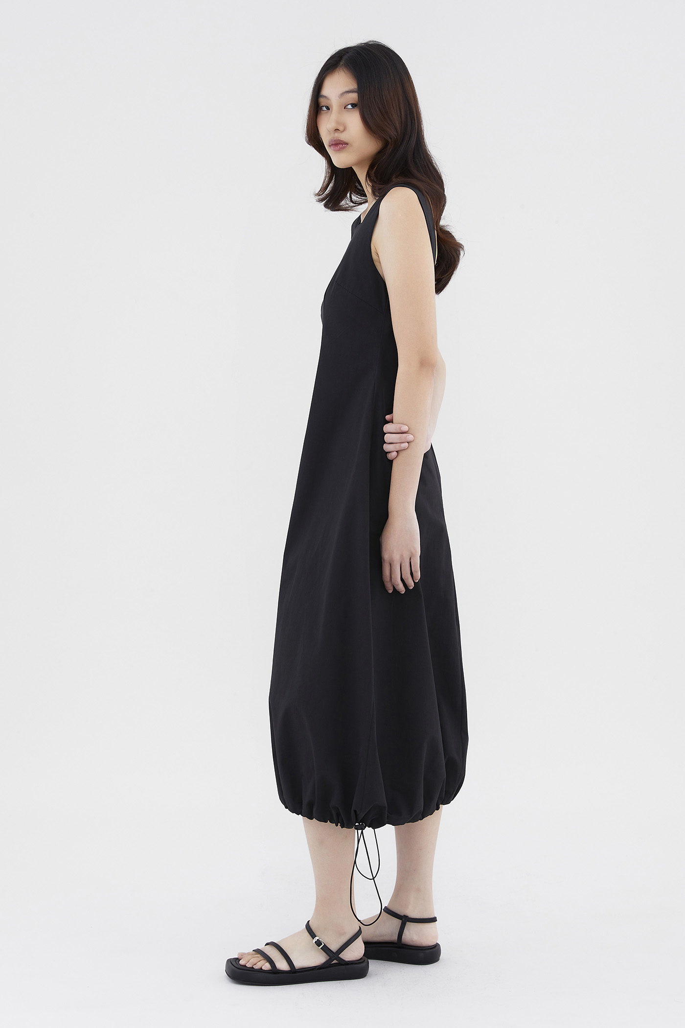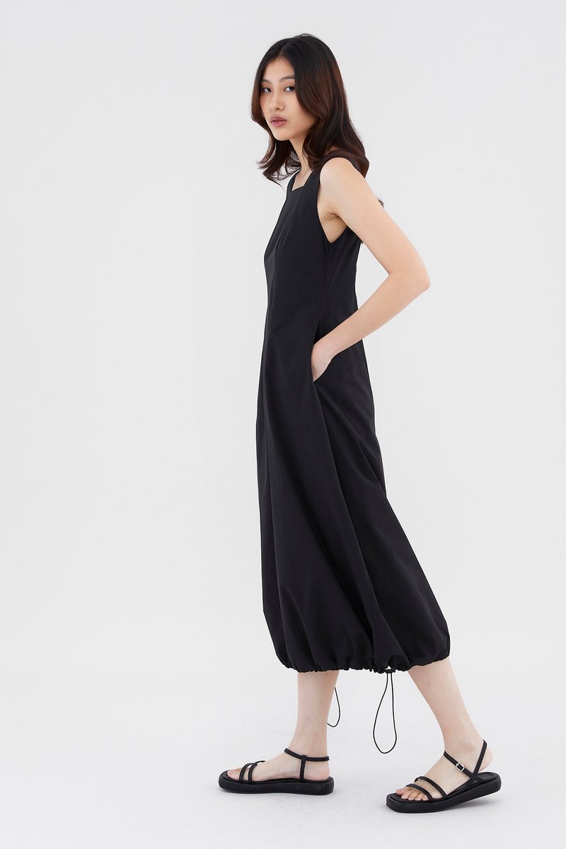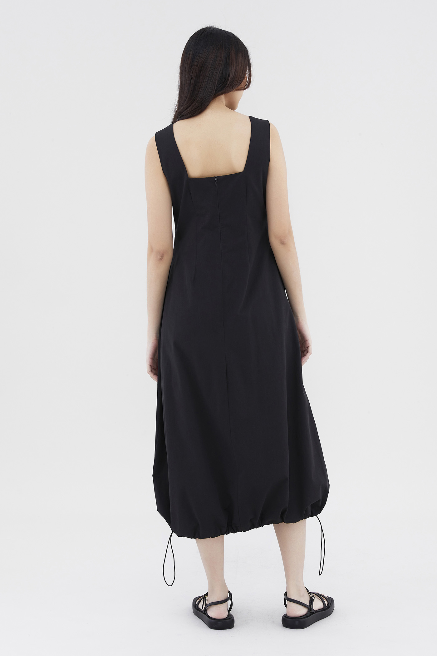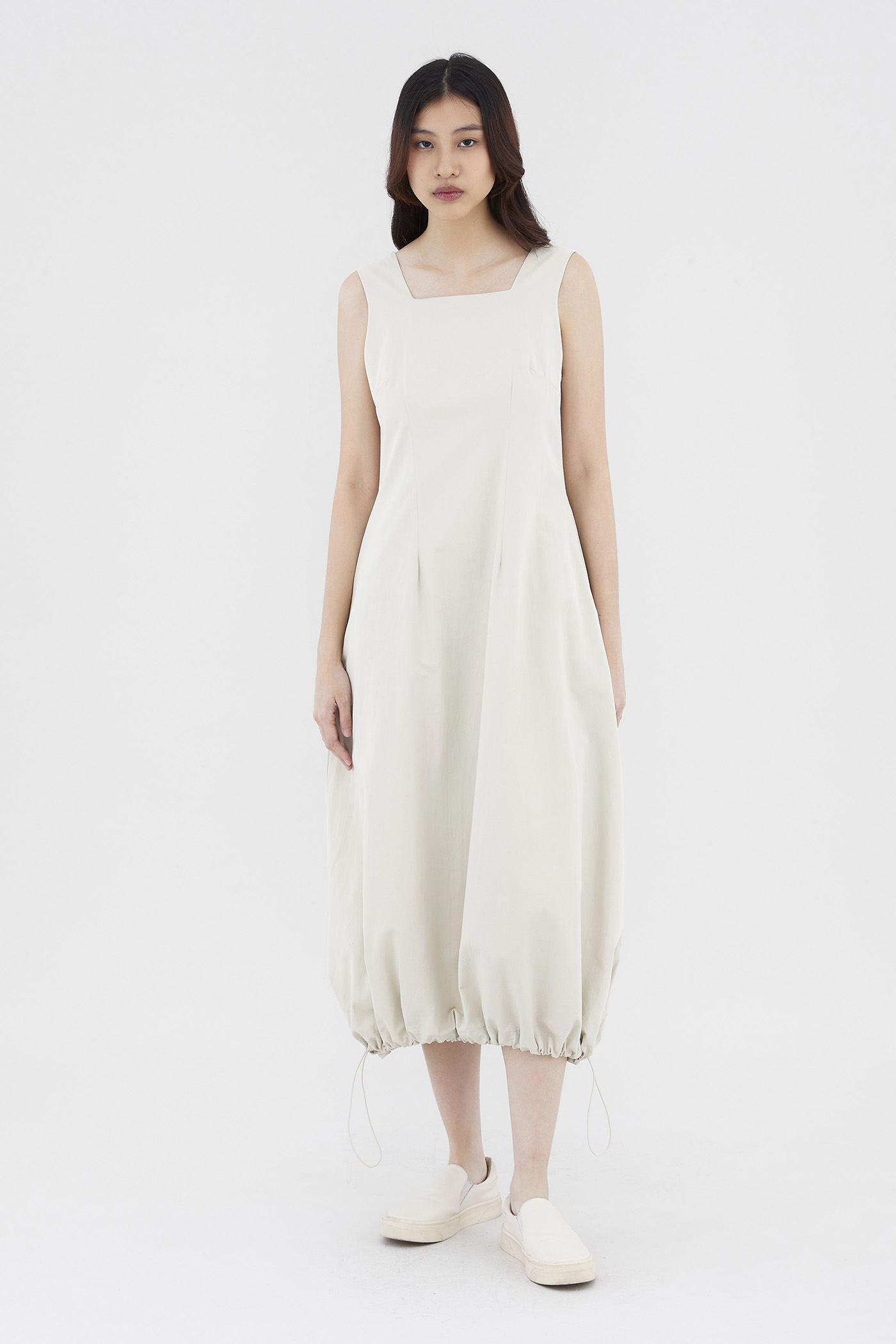 Leave an impression. Cut from crisp and gently structured cotton, this sleeveless midi-to-maxi dress features a square neckline, wide shoulder straps, a back zip closure and a bubble hemline with an adjustable toggle tie. Fits slim in a subtle A-line silhouette.
