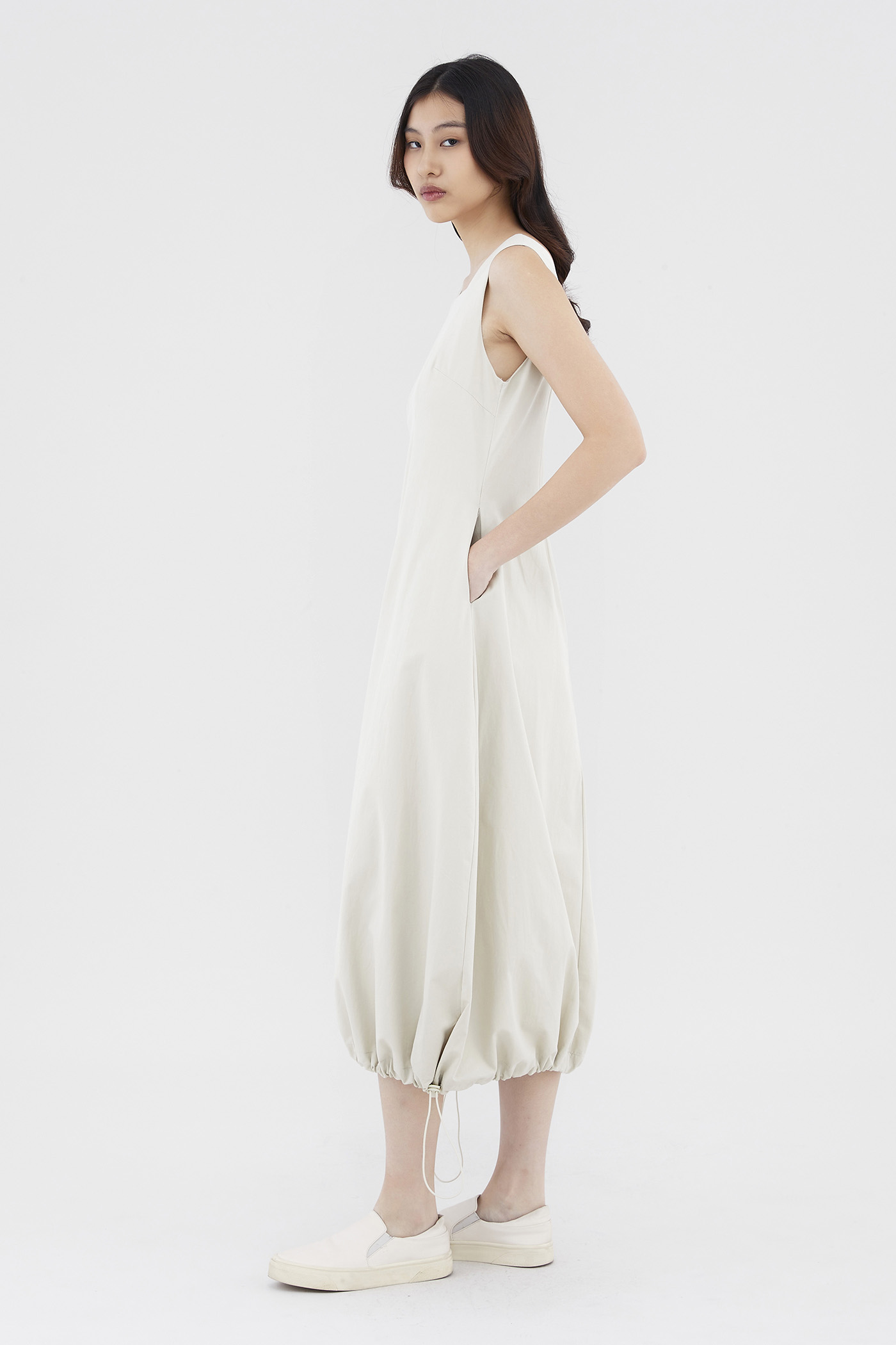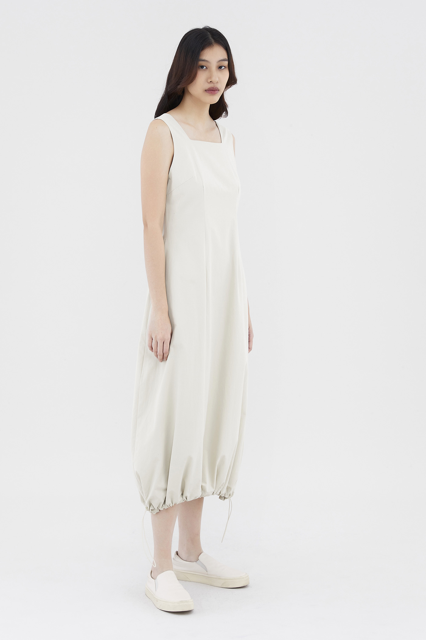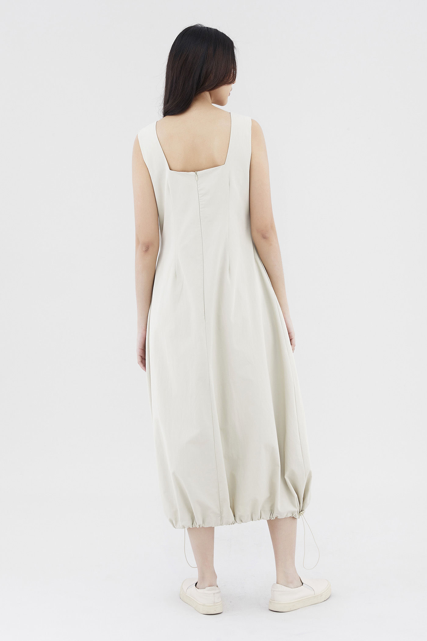 Leave an impression. Cut from crisp and gently structured cotton, this sleeveless midi-to-maxi dress features a square neckline, wide shoulder straps, a back zip closure and a bubble hemline with an adjustable toggle tie. Fits slim in a subtle A-line silhouette.