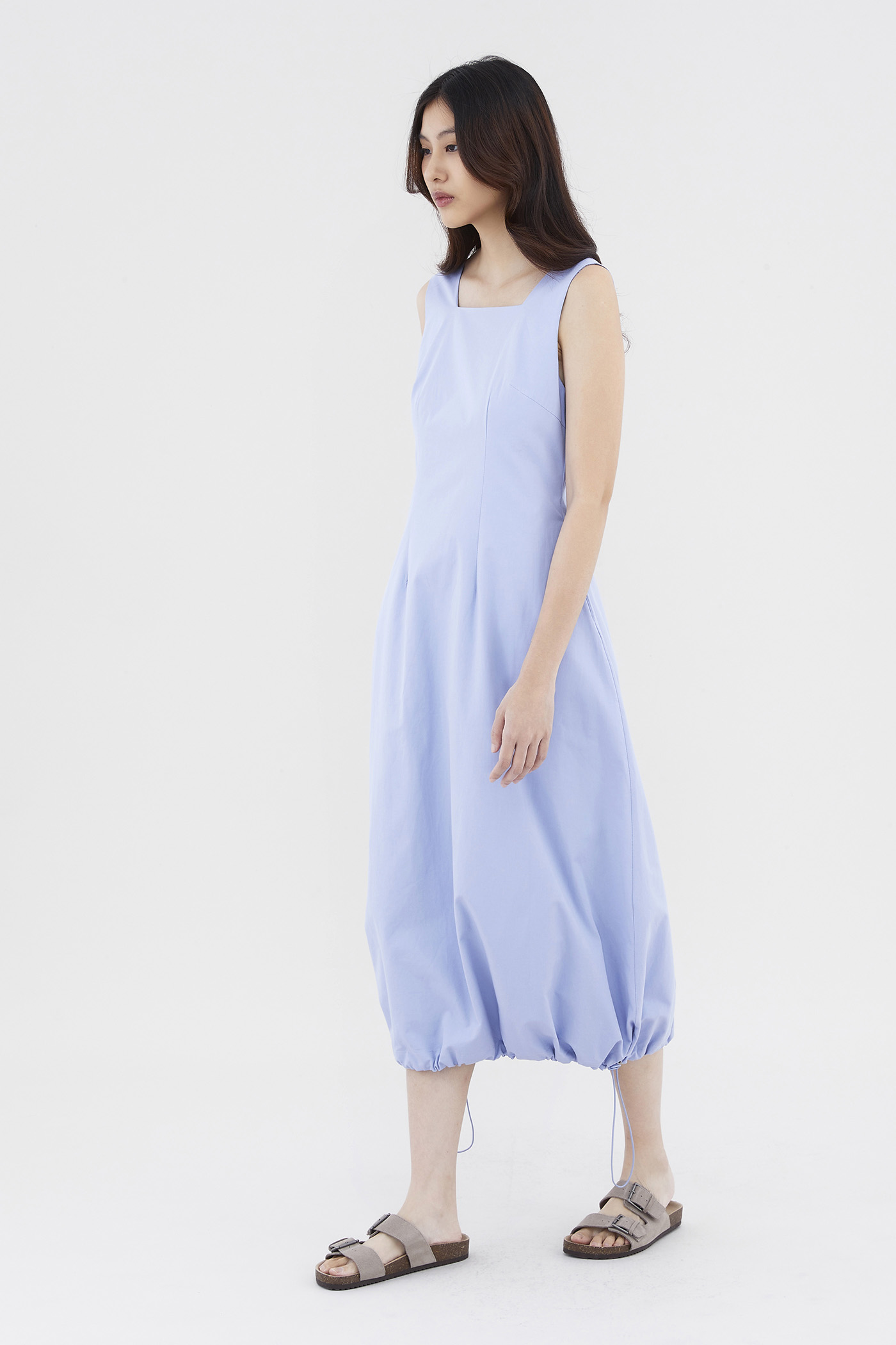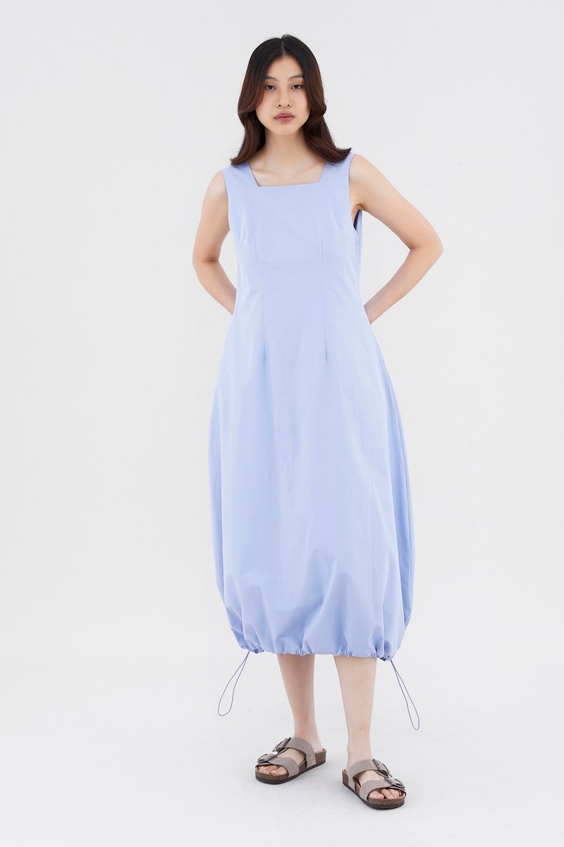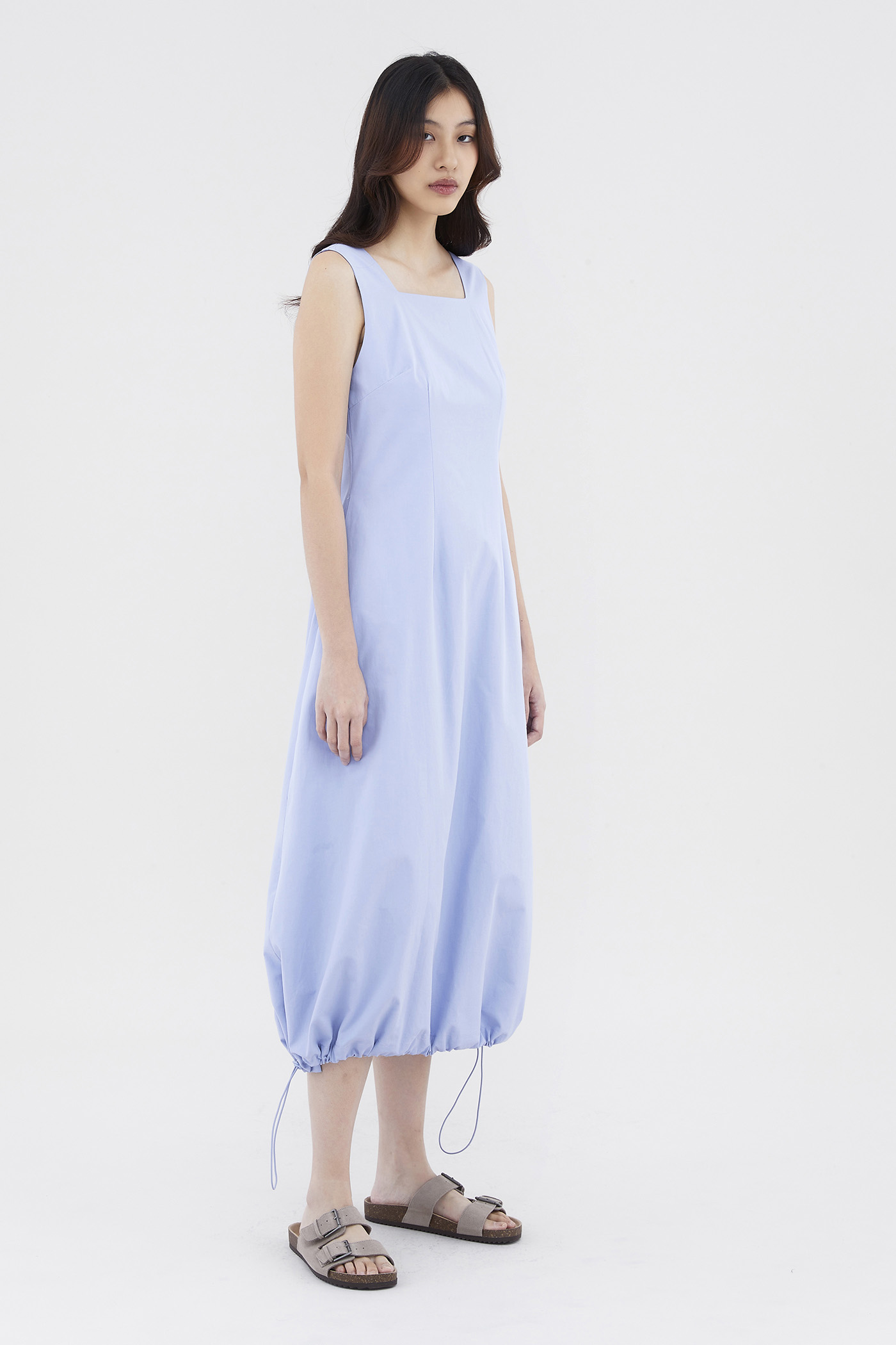 Leave an impression. Cut from crisp and gently structured cotton, this sleeveless midi-to-maxi dress features a square neckline, wide shoulder straps, a back zip closure and a bubble hemline with an adjustable toggle tie. Fits slim in a subtle A-line silhouette.