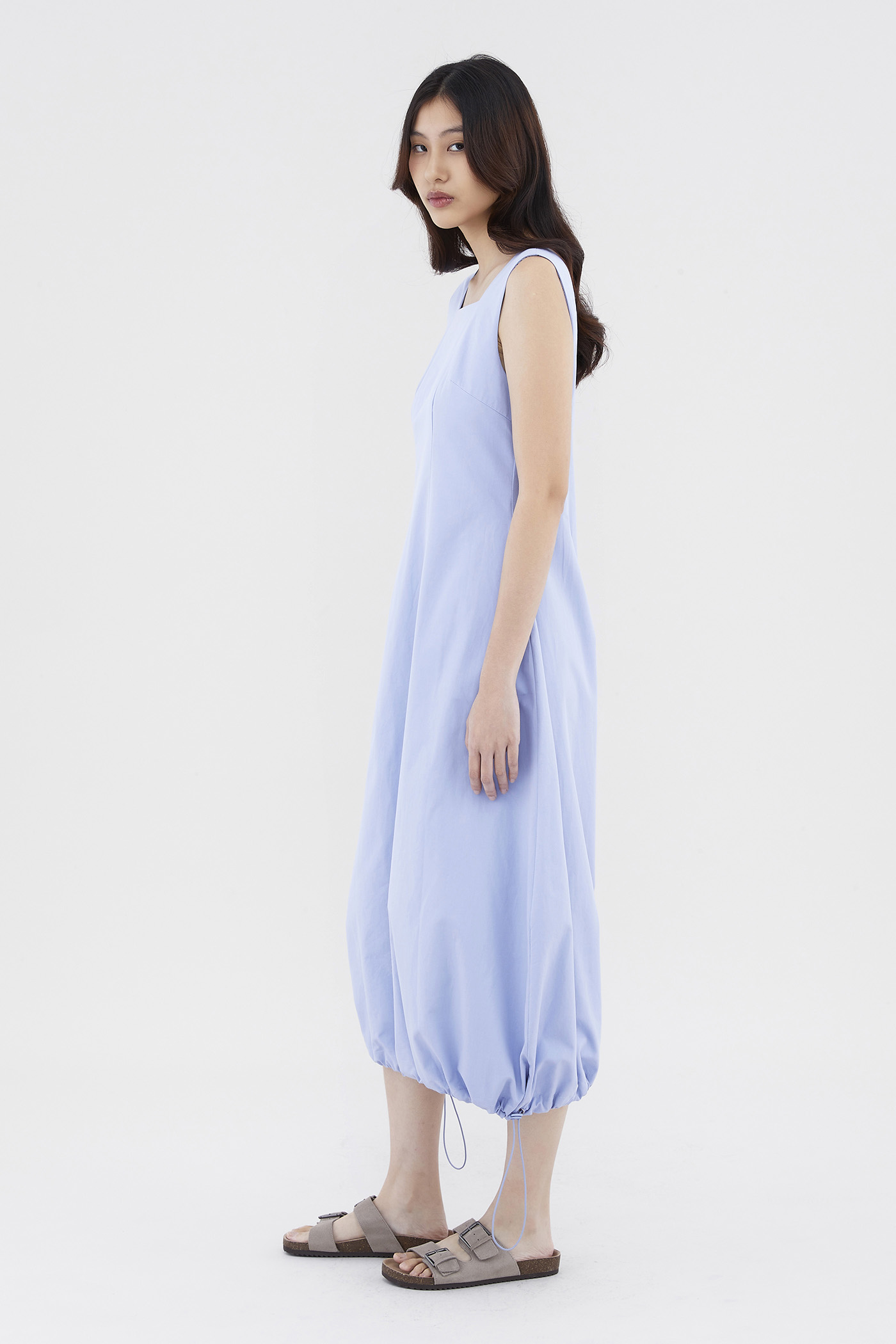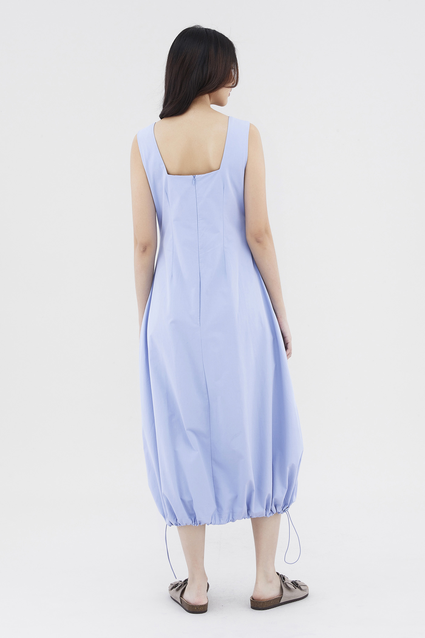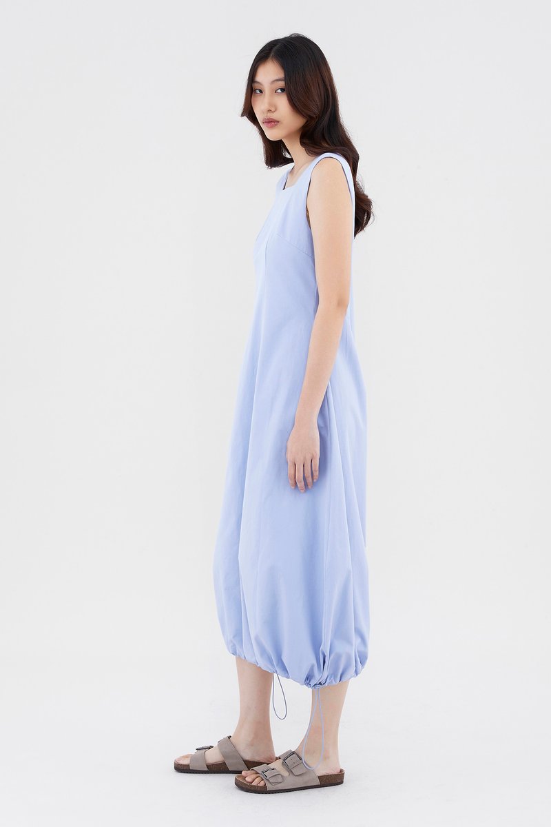 Leave an impression. Cut from crisp and gently structured cotton, this sleeveless midi-to-maxi dress features a square neckline, wide shoulder straps, a back zip closure and a bubble hemline with an adjustable toggle tie. Fits slim in a subtle A-line silhouette.