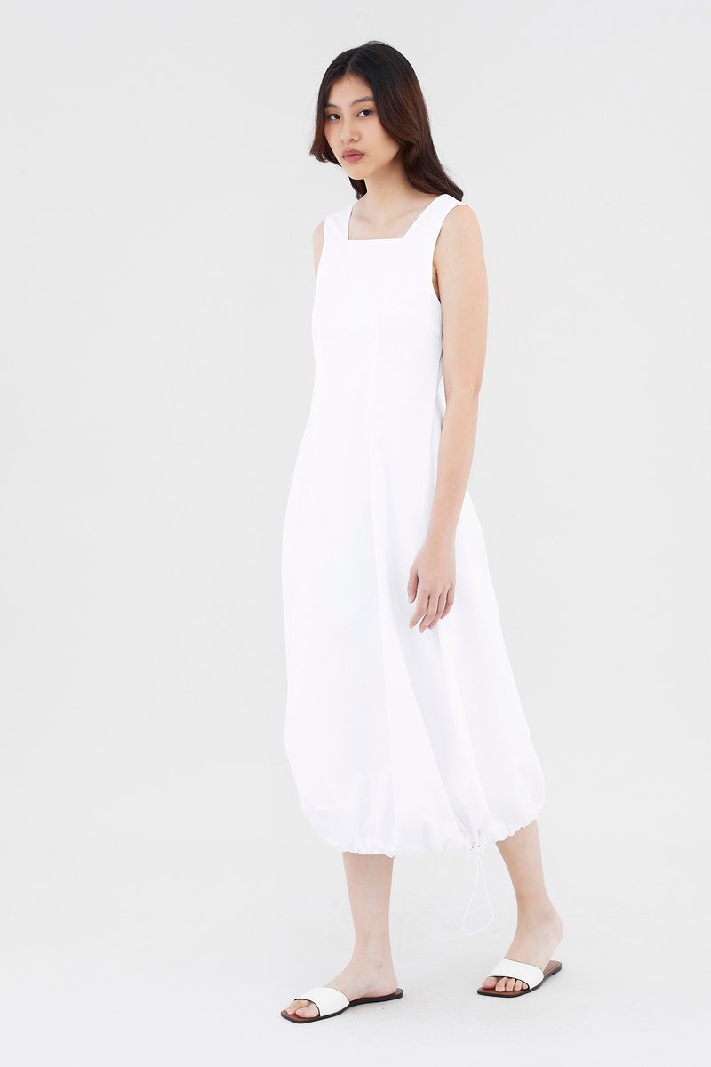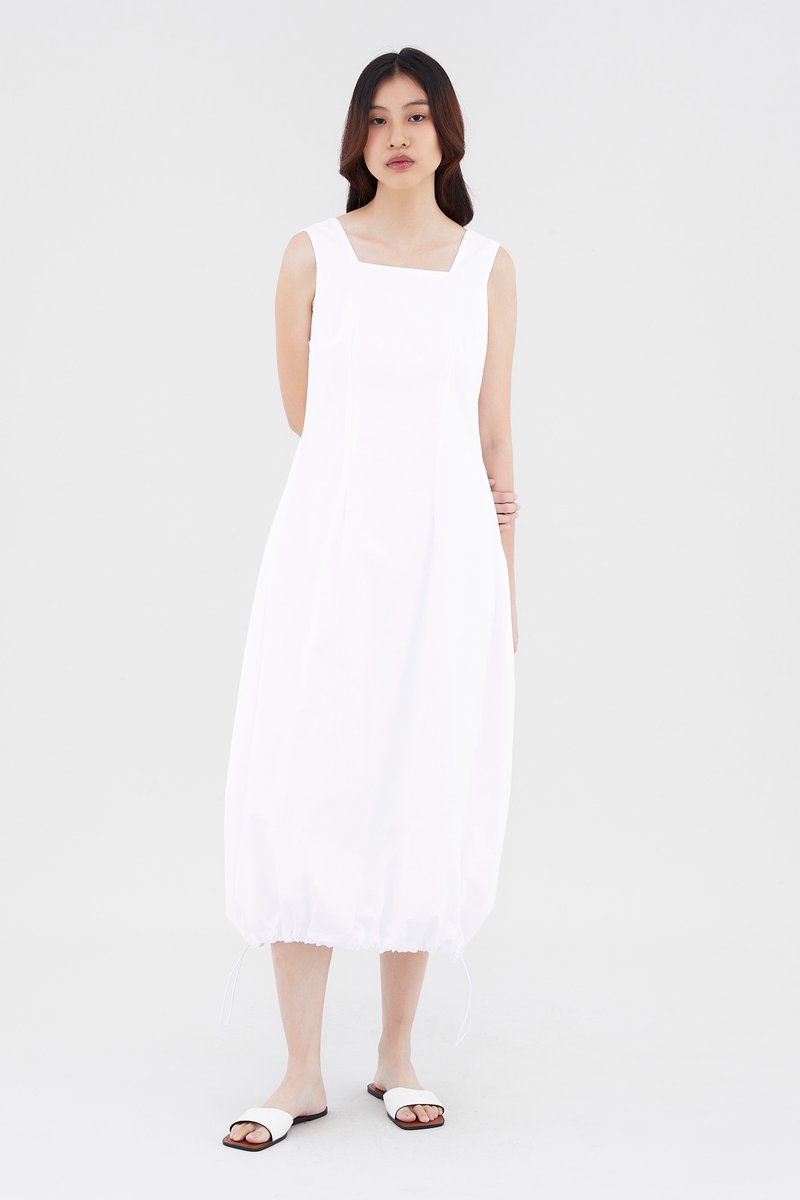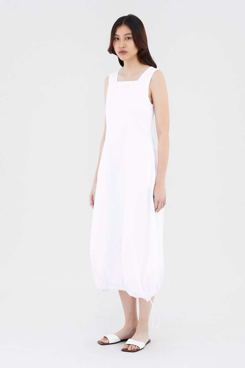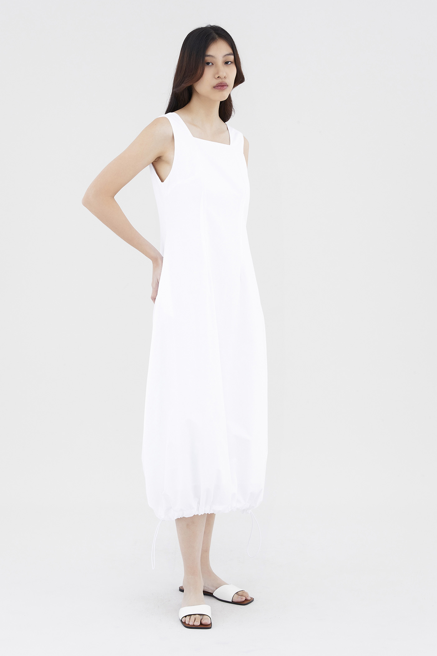 Leave an impression. Cut from crisp and gently structured cotton, this sleeveless midi-to-maxi dress features a square neckline, wide shoulder straps, a back zip closure and a bubble hemline with an adjustable toggle tie. Fits slim in a subtle A-line silhouette.
